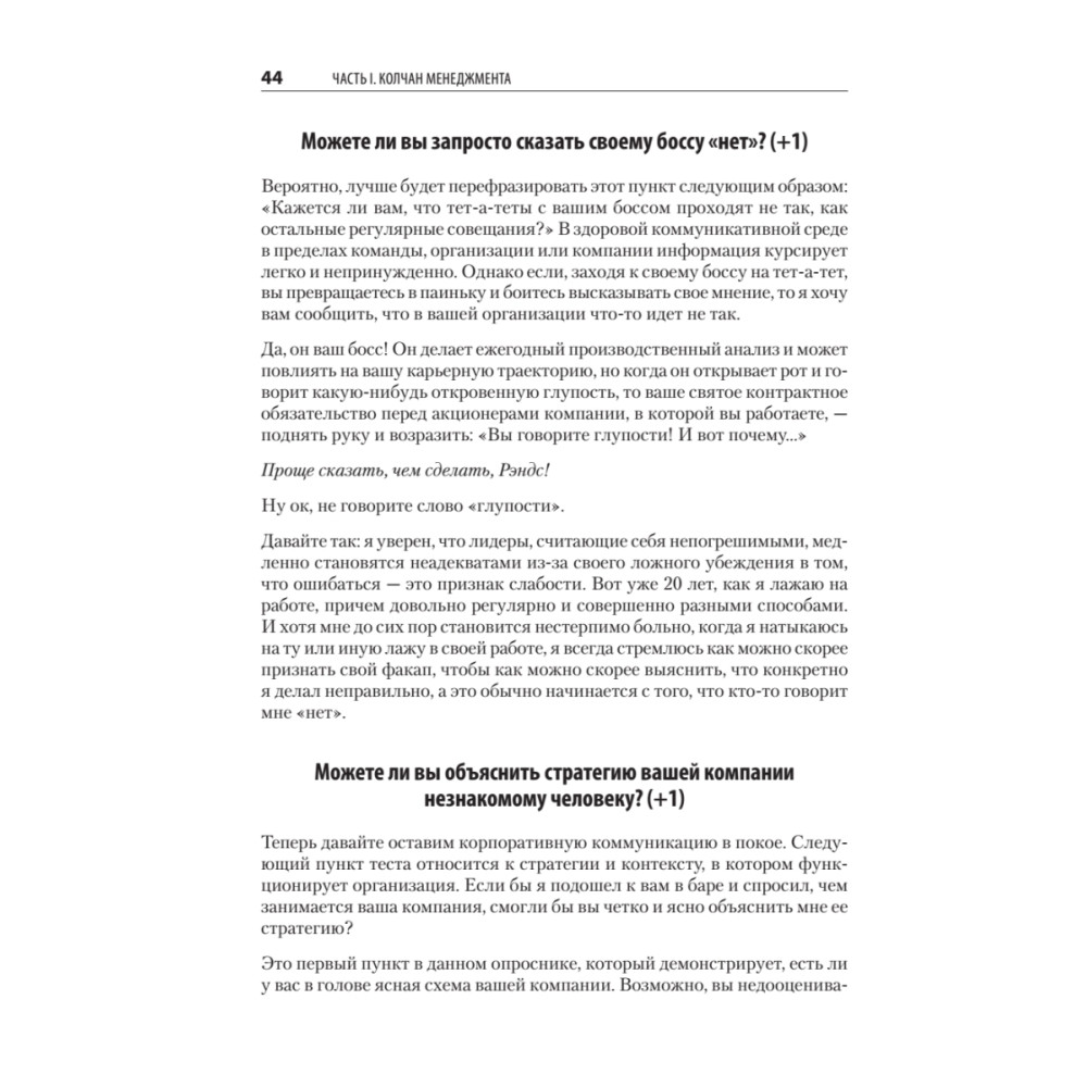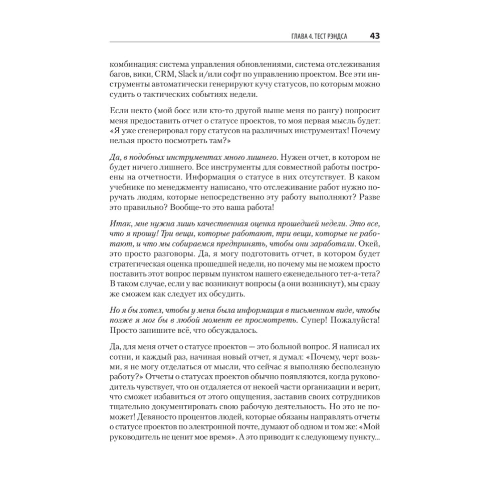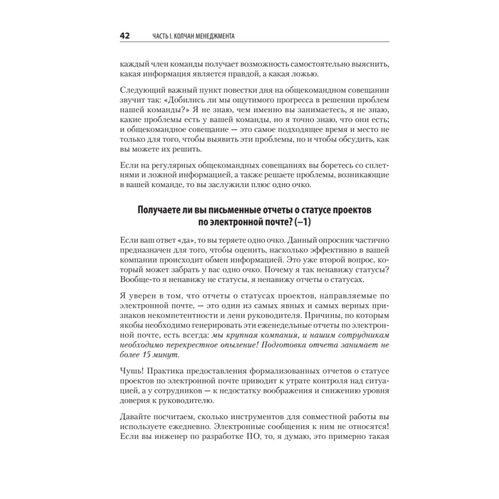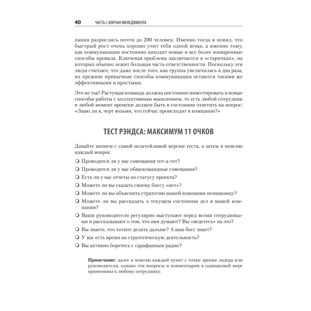 «Это книга по менеджменту, полная инсайтов, идей и мнений о том, как следует руководить людьми. Вся приведенная здесь информация основана на моем личном опыте взаимодействия с реальными людьми (с которыми я общаюсь до сих пор). Мне бы очень хотелось сказать, что мой опыт лидерства всегда был положительным, но это не так. Несколько раз мне по-настоящему срывало крышу, причем при свидетелях. И именно эти свидетели помогали мне снова взять себя в руки и тем самым давали материал для еще одной страницы этой книги.»
