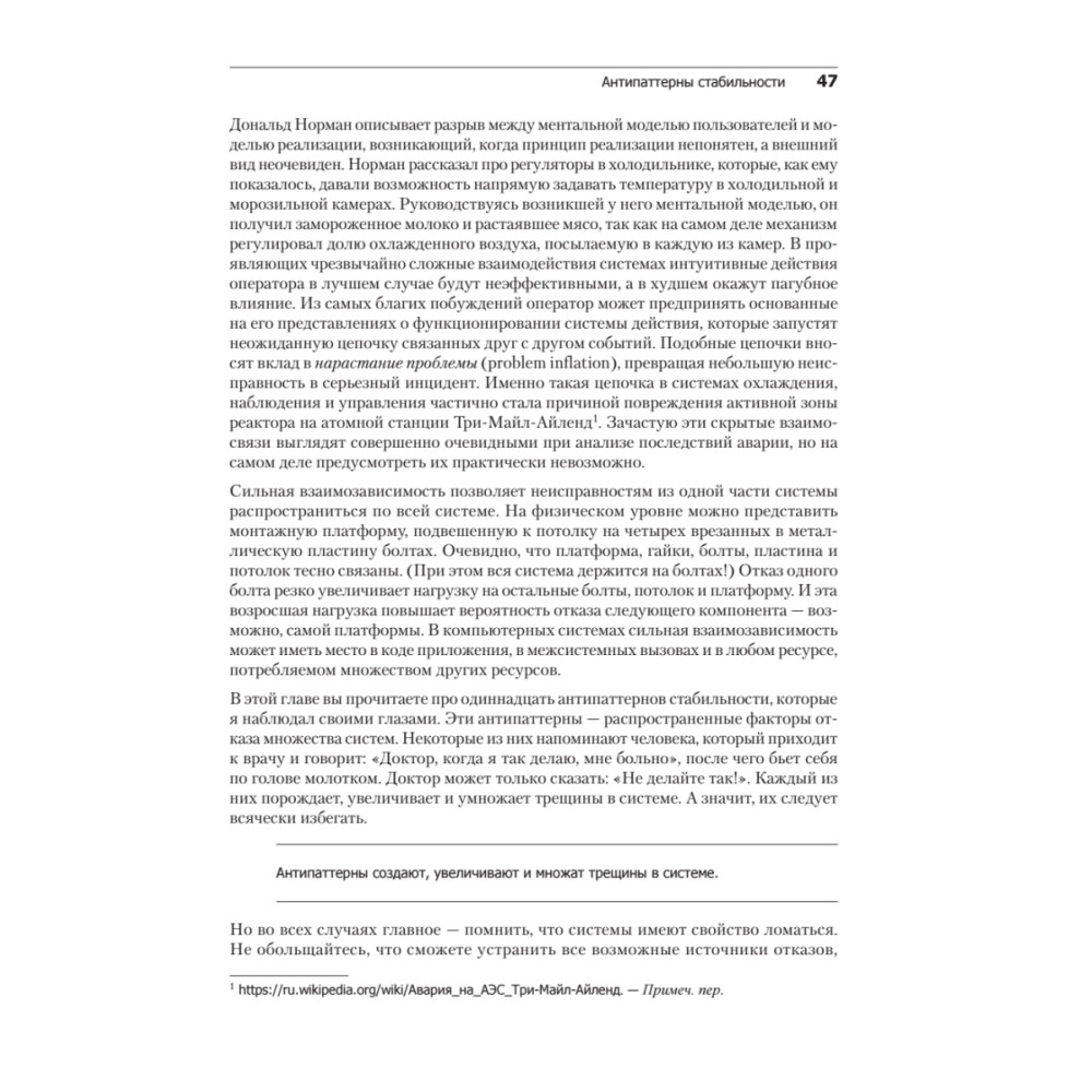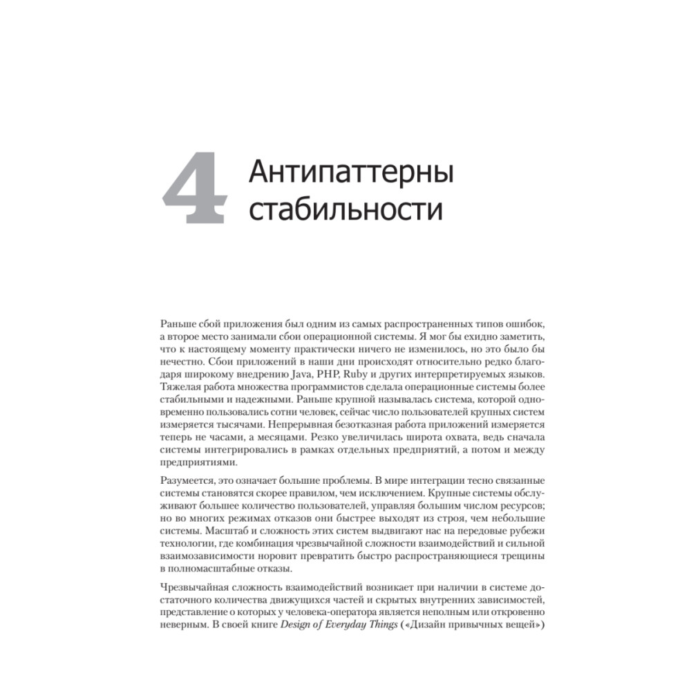 Не важно, каким инструментом вы пользуетесь для программной разработки — Java, .NET или Ruby on Rails. Написание кода — это еще только полдела. Готовы ли вы к внезапному наплыву ботов на ваш сайт? Предусмотрена ли в вашем ПО «защита от дурака»? Правильно ли вы понимаете юзабилити? Майкл Нейгард утверждает, что большинство проблем в программных продуктах были заложены в них еще на стадии дизайна и проектирования. Вы можете двигаться к идеалу сами — методом проб и ошибок, а можете использовать опыт автора. В этой книге вы найдете множество шаблонов проектирования, помогающих избежать критических ситуаций и не меньшее количество антишаблонов, иллюстрирующих неправильные подходы с подробным анализом возможных последствий. Любой разработчик, имеющий опыт многопоточного программирования, легко разберется в примерах на Java, которые подробно поясняются и комментируются.
