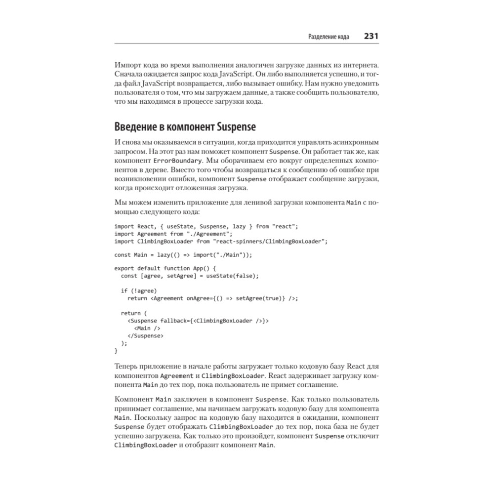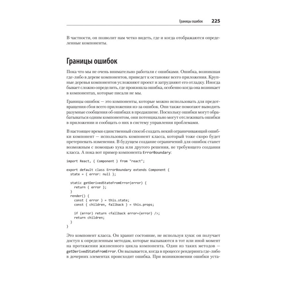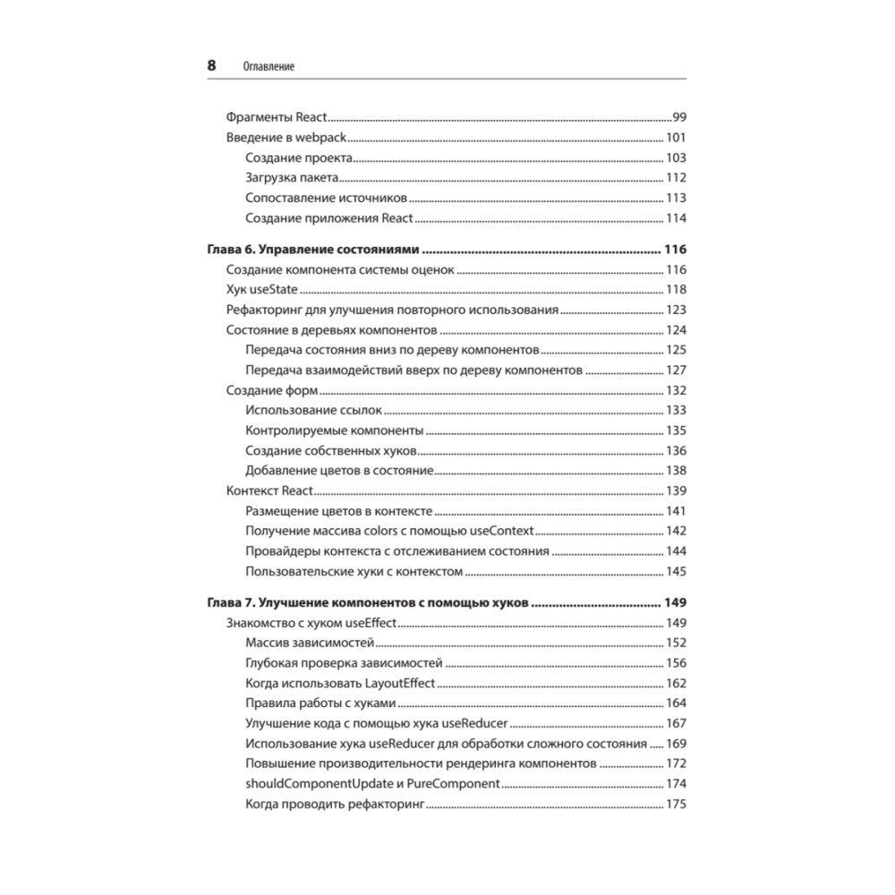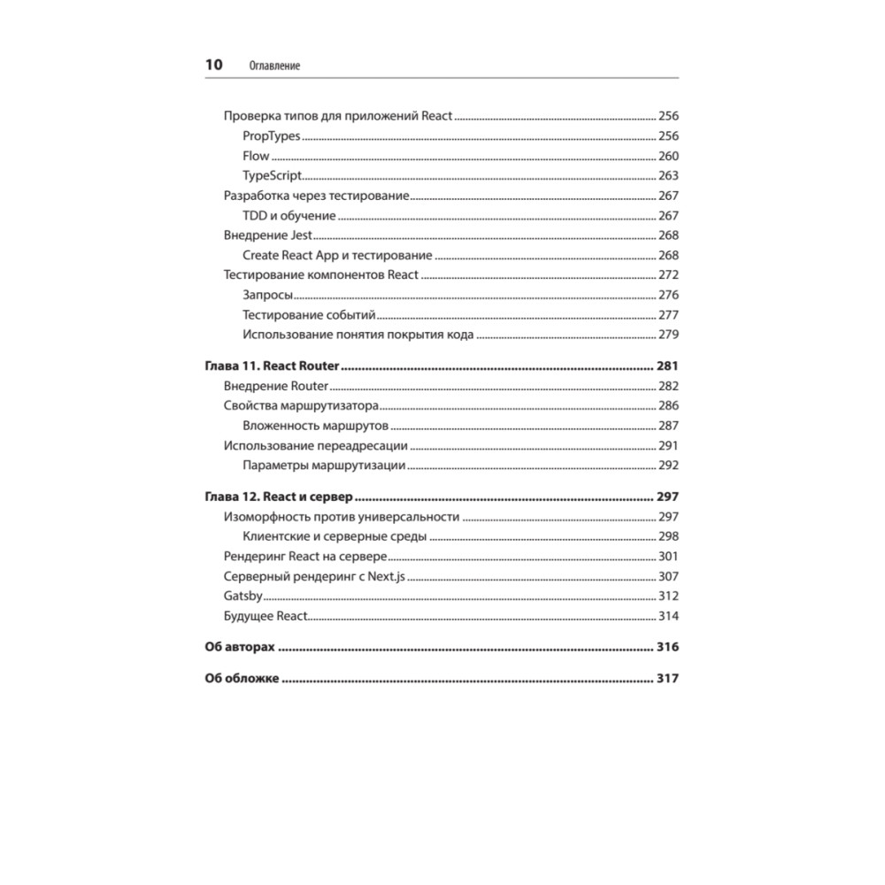 Хотите создавать эффективные приложения с помощью React? Тогда эта книга написана для вас. Познакомьтесь c лучшими практиками и шаблонами создания современного кода. Вам не потребуются глубокие знания React или функционала JavaScript — достаточно знакомства с принципами работы JavaScript, CSS и HTML. Алекс Бэнкс и Ева Порселло научат вас создавать пользовательские интерфейсы, которые будут динамически отображать изменения без необходимости перезагрузки страницы даже на крупномасштабных сайтах, работающих с огромными массивами данных. В этой книге вы: • Разберетесь с ключевыми аспектами функционального программирования на JavaScript. • Узнаете, как устроена работа React в браузере. • Создадите слои представления приложения с помощью компонентов React. • Научитесь управлять данными и тратить меньше времени на отладку. • Внедрите в проект хуки React для управления состояниями и перехвата данных. • Используете маршрутизатор для полноценной работы с одностраничными приложениями. • Научитесь структурировать приложения React с учетом особенности работы сервера.