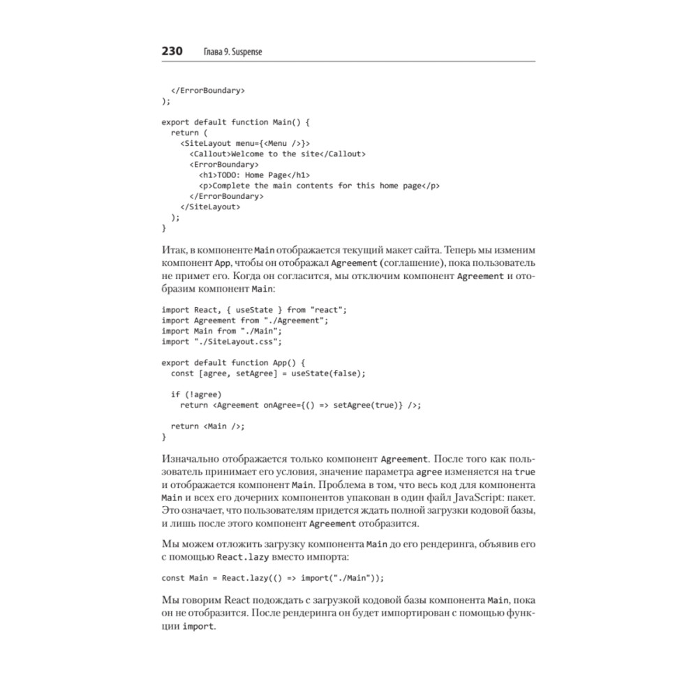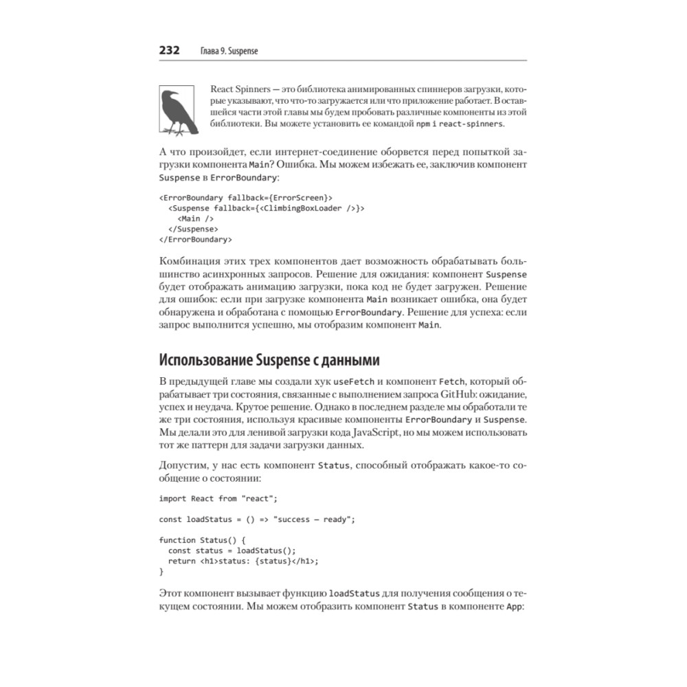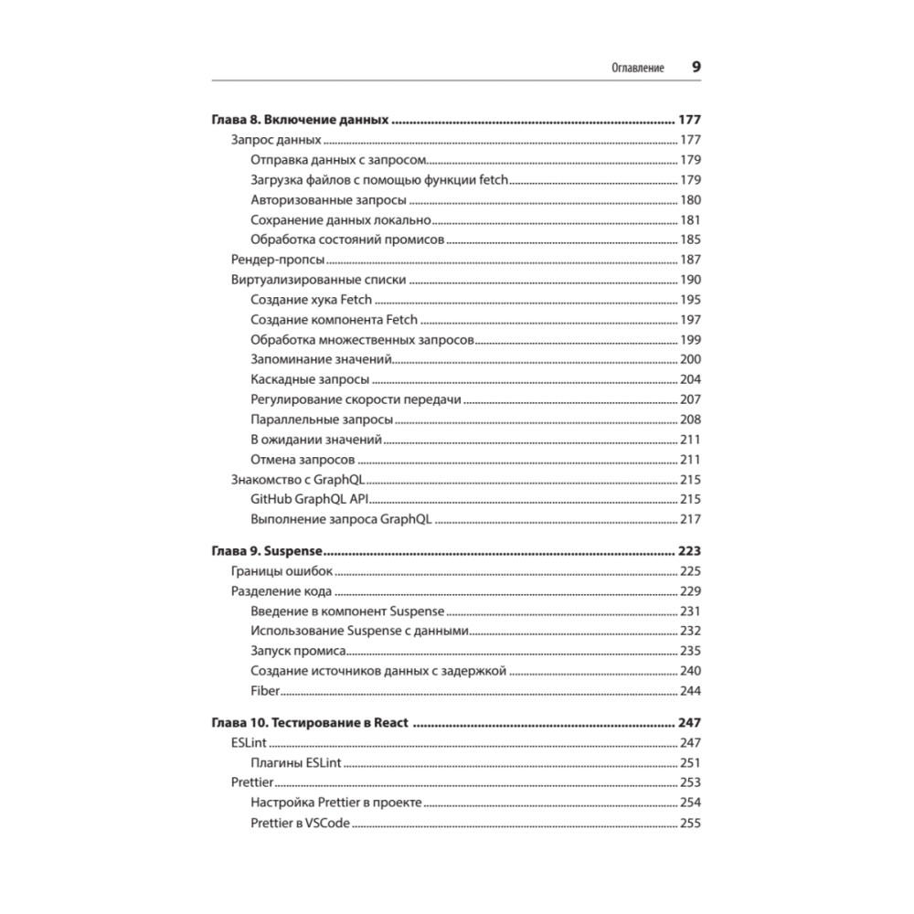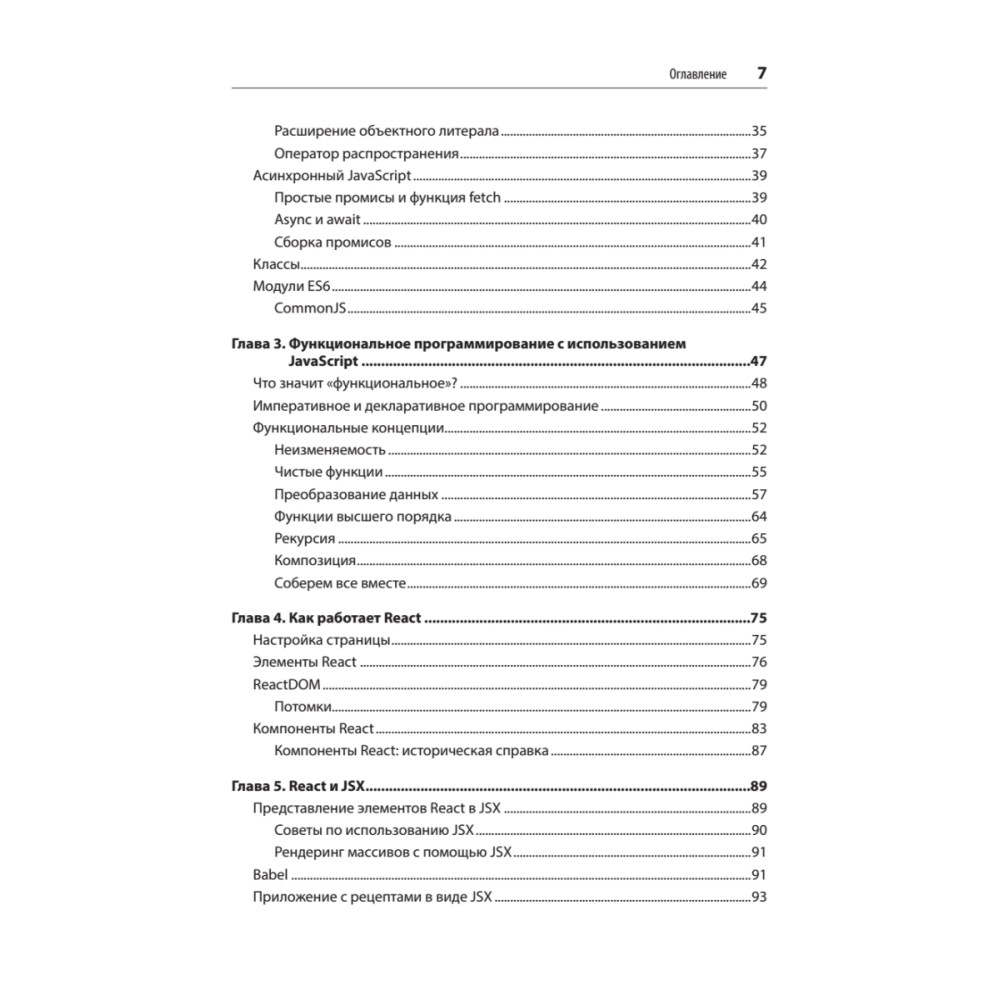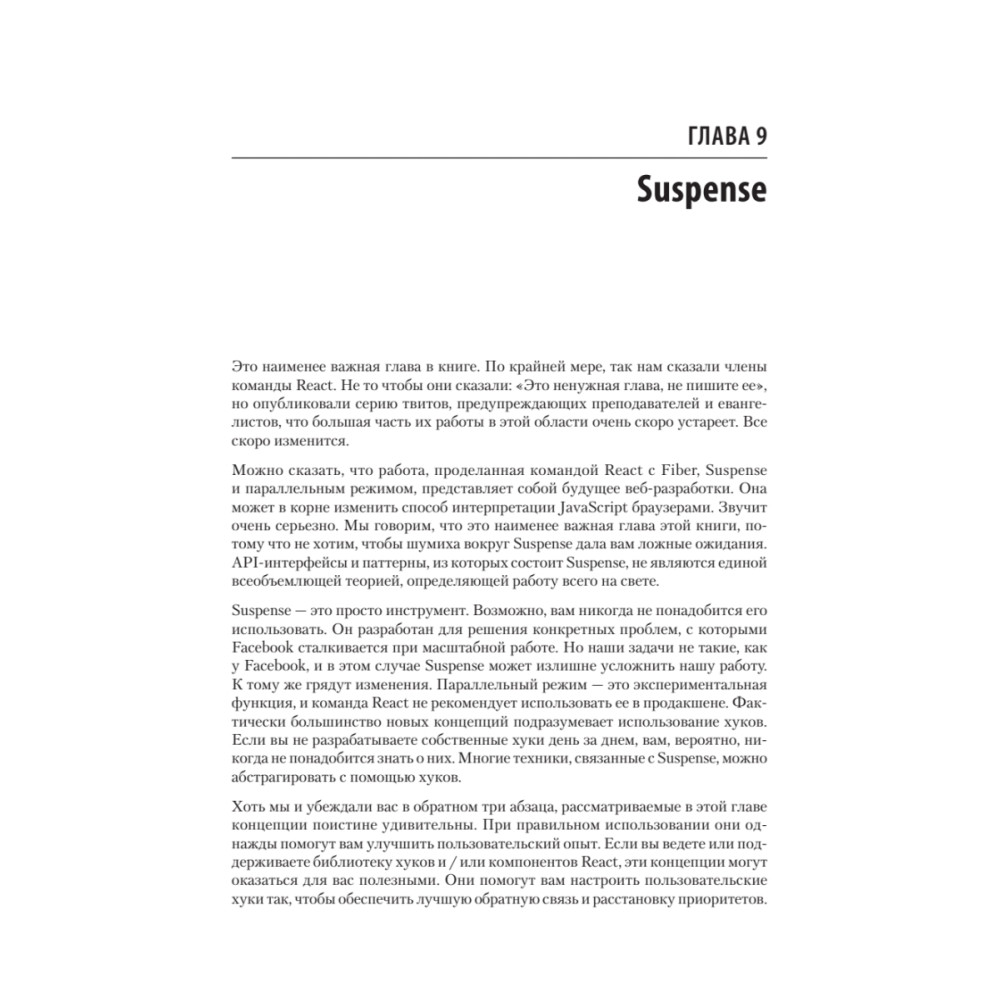 Хотите создавать эффективные приложения с помощью React? Тогда эта книга написана для вас. Познакомьтесь c лучшими практиками и шаблонами создания современного кода. Вам не потребуются глубокие знания React или функционала JavaScript — достаточно знакомства с принципами работы JavaScript, CSS и HTML. Алекс Бэнкс и Ева Порселло научат вас создавать пользовательские интерфейсы, которые будут динамически отображать изменения без необходимости перезагрузки страницы даже на крупномасштабных сайтах, работающих с огромными массивами данных. В этой книге вы: • Разберетесь с ключевыми аспектами функционального программирования на JavaScript. • Узнаете, как устроена работа React в браузере. • Создадите слои представления приложения с помощью компонентов React. • Научитесь управлять данными и тратить меньше времени на отладку. • Внедрите в проект хуки React для управления состояниями и перехвата данных. • Используете маршрутизатор для полноценной работы с одностраничными приложениями. • Научитесь структурировать приложения React с учетом особенности работы сервера.