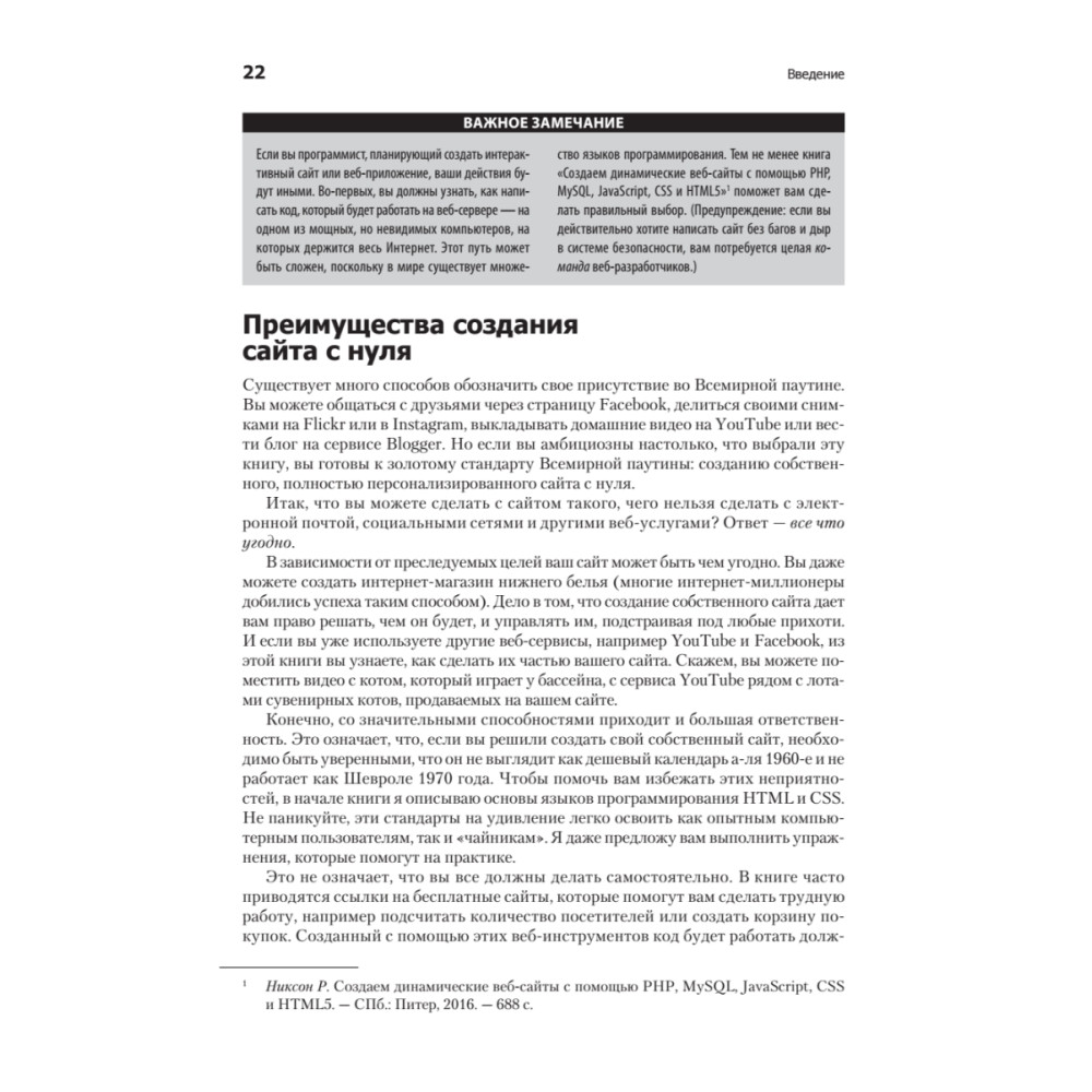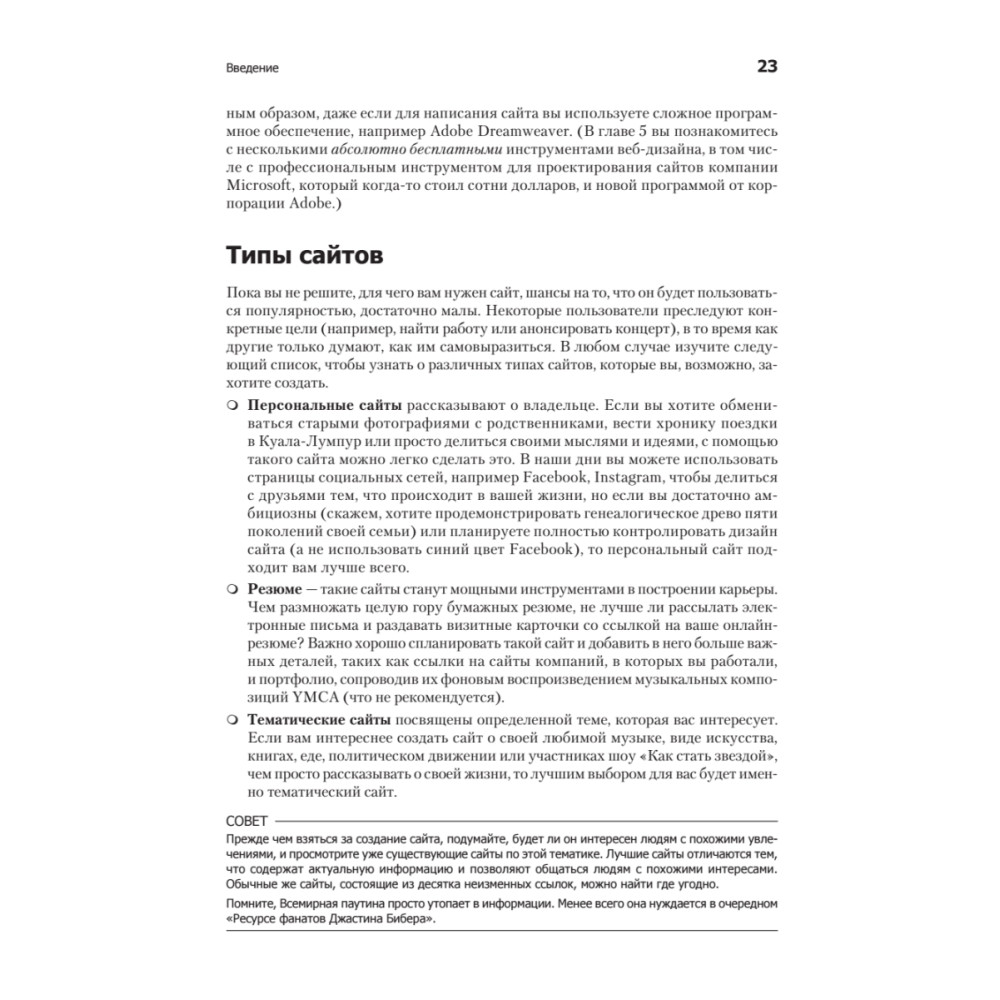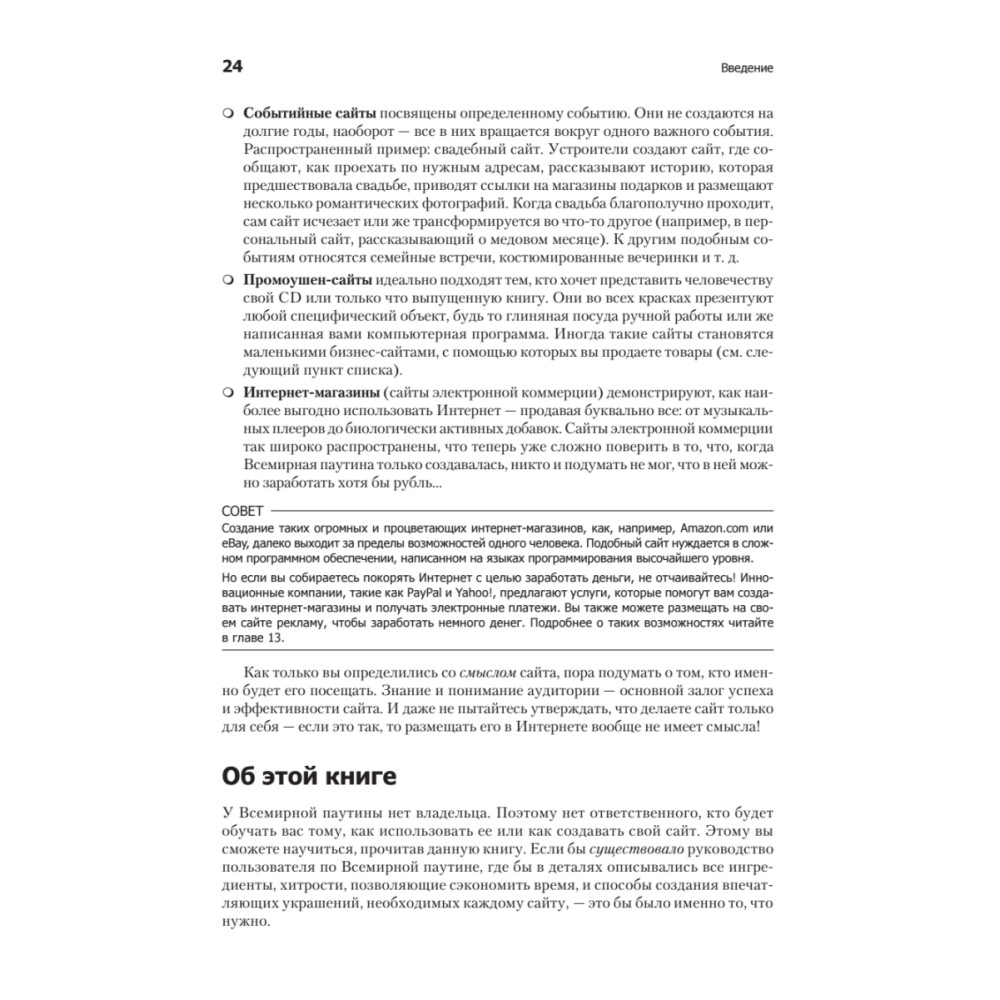 Можно без труда создать добротный веб-сайт, вооружившись обычным компьютером и некоторыми амбициями. Хотите сделать собственный блог, интернет-магазин, форум, ресурс с рекламой мероприятия? Не проблема! Эта доступная книга, не перегруженная терминами, расскажет обо всех приемах, инструментах и навыках, необходимых, чтобы создать сайт и запустить его в Вебе.