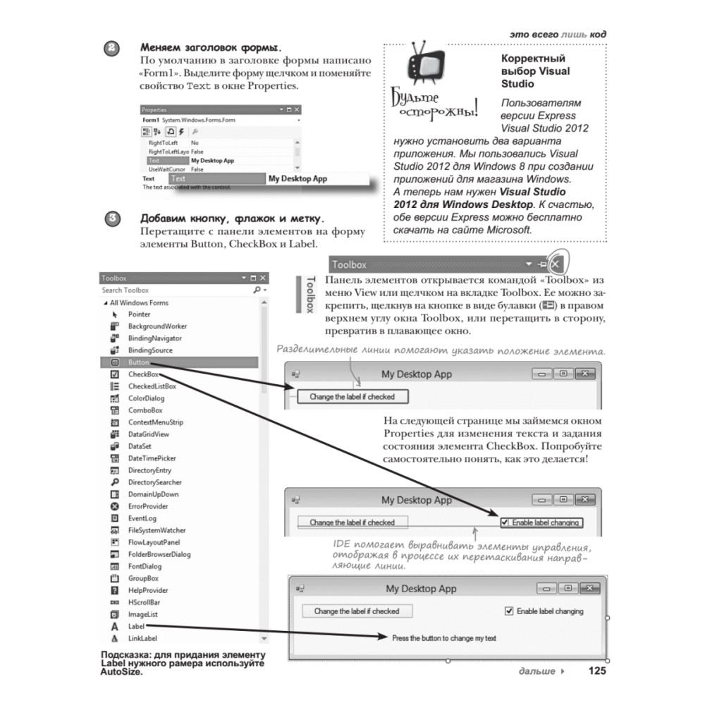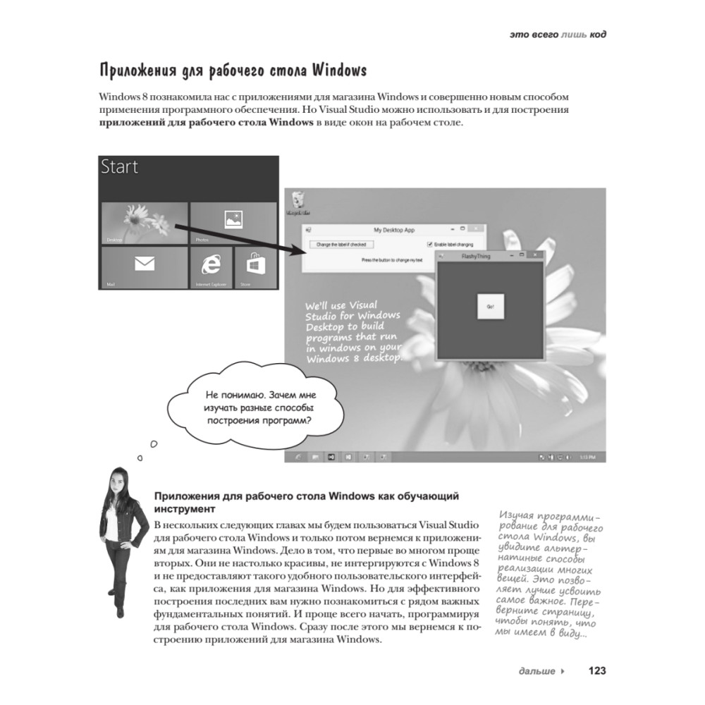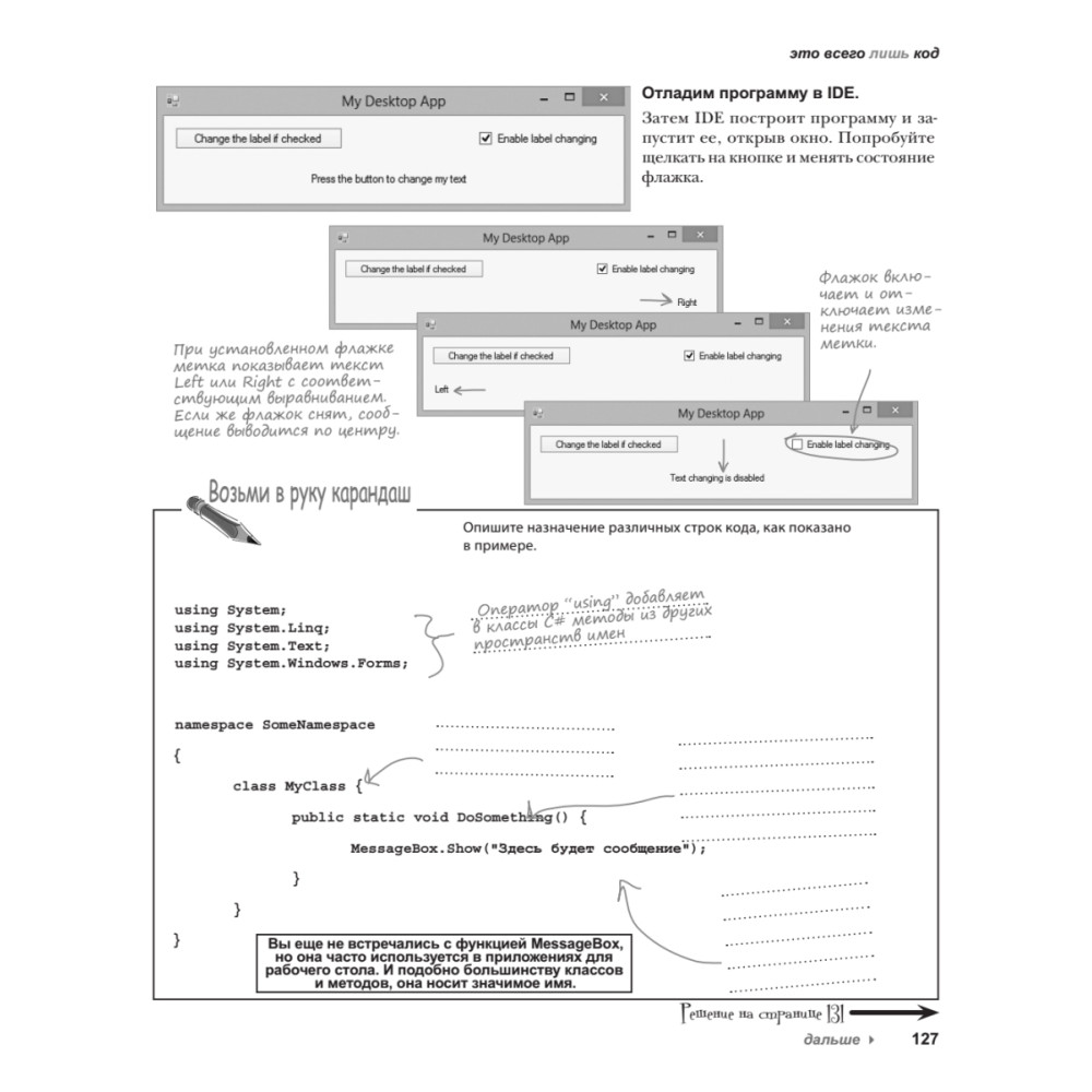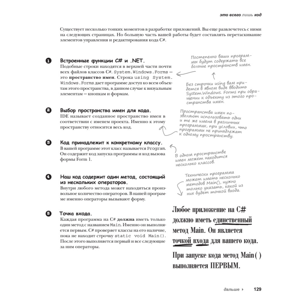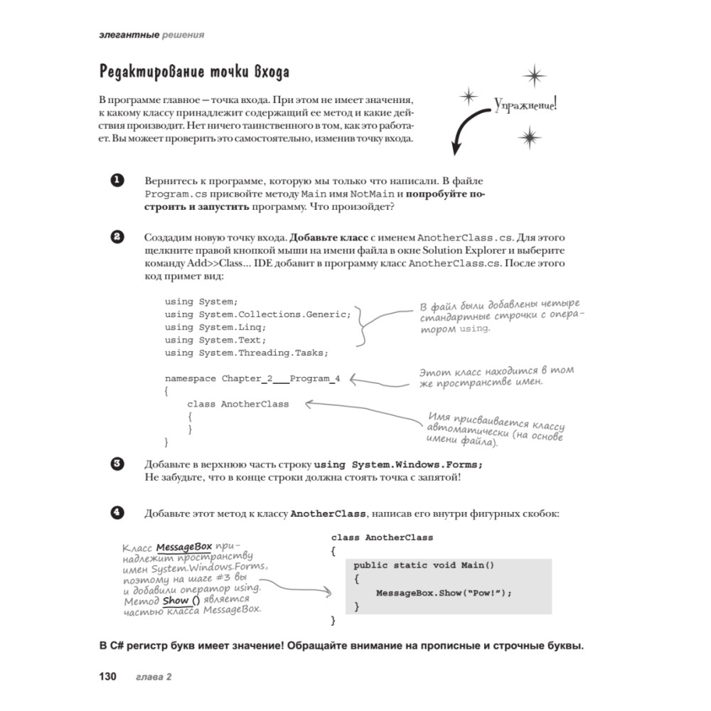 Большинство книг по программированию построены на основе скучного изложения спецификаций и примеров. Пора это изменить! Используя методику Head First можно сразу приступить к написанию собственного кода на языке C#. Вы освоите минимальный набор инструментов и примете участие в забавных программных проектах: от разработки карточной игры до создания серьезного бизнес-приложения. Хотите программировать действительно быстро? C# — это мощный язык программирования. Благодаря Head First и Visual Studio вам не потребуется писать непонятный код, чтобы заставить кнопку работать. Вместо того чтобы запоминать параметры метода для имени и для ярлыка кнопки, вы сможете сфокусироваться на достижении результата. Звучит заманчиво? Тогда переверните страницу и приступим к делу.