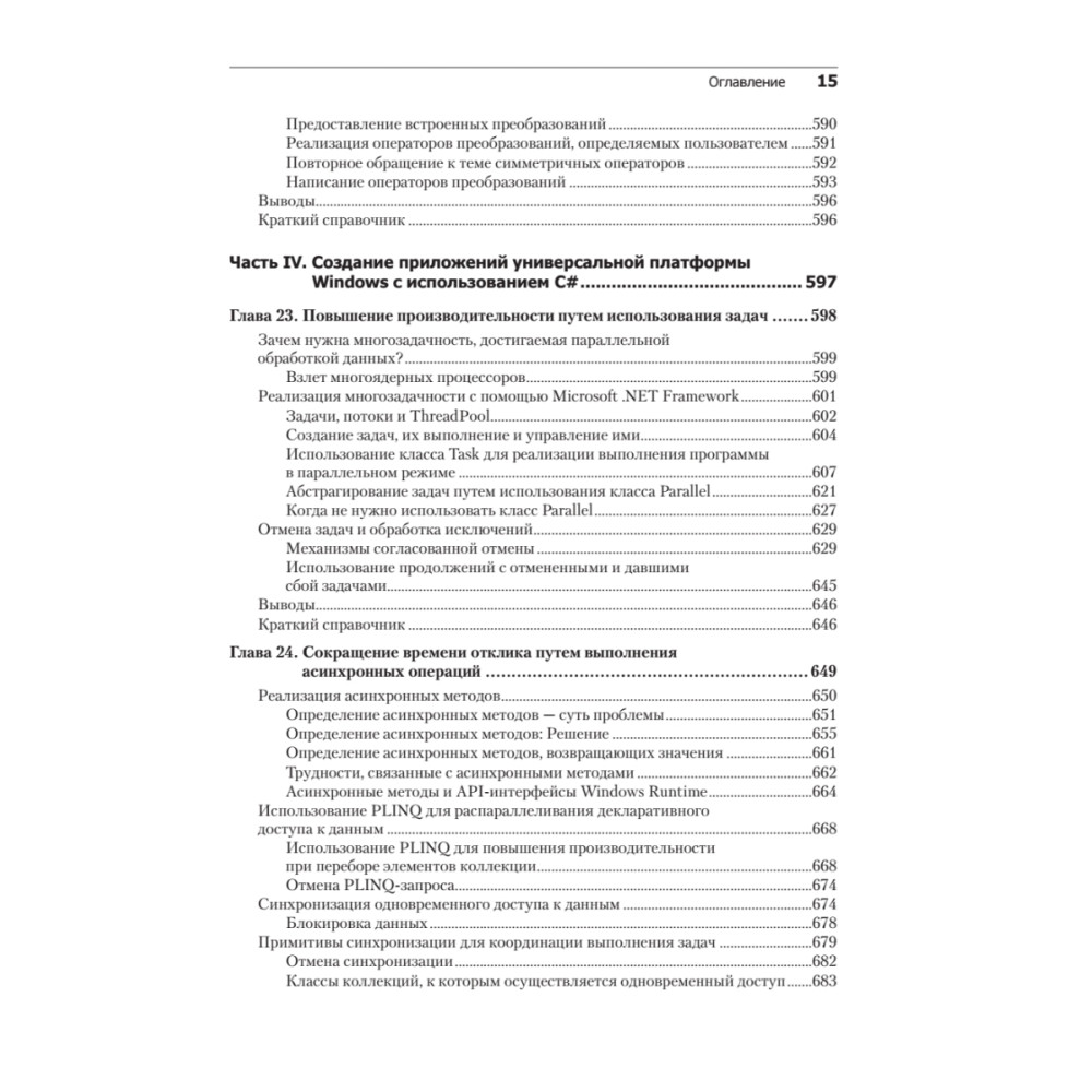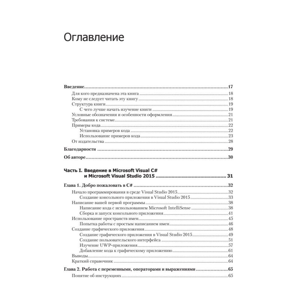 Освойте основы программирования и углубите свои познания, используя новейшую версию C# с Visual Studio 2015. Вы научитесь быстро писать код и создавать проекты, работать с переменными, операторами, выражениями и методами, разрабатывать надежные приложения с обработкой ошибок и исключений, использовать коллекции, создавать запросы LINQ, а кроме того получите навыки объектно-ориентированного программирования. Книга пригодится разработчикам программного обеспечения, которые только начинают работать с Visual C# или хотят перейти на новую версию ПО, а также всем, кто знает хотя бы один язык программирования. Опыт работы с Microsoft .NET или Visual Studio не требуется.