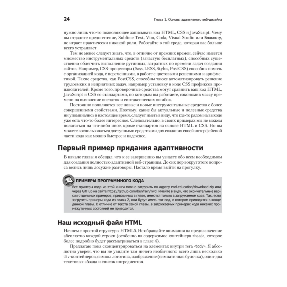 Начните разрабатывать сайты в соответствии с новой методологией адаптивного веб-дизайна, благодаря чему они будут красиво отображаться на экранах любых размеров. Читайте эту книгу, попутно создавая и улучшая адаптивные веб-дизайны с использованием HTML5 и CSS3. Вы научитесь применять на практике новые технологии и методики, призванные стать инструментами будущего для веб-разработчиков клиентских приложений.