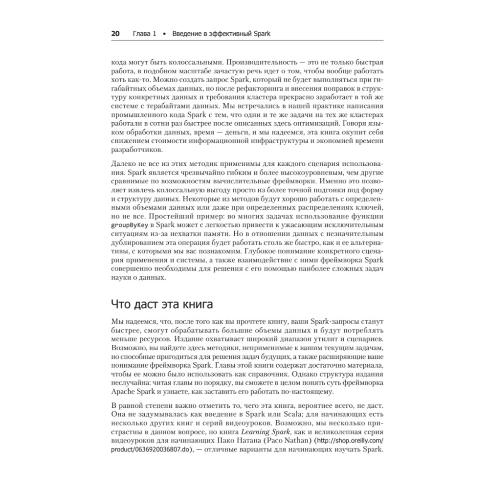 Если у вас уже есть положительный опыт использования Spark для решения небольших задач, но вы по-прежнему ломаете голову – где та самая непревзойденная производительность Spark, позволяющая перемалывать колоссальные объемы данных – то эта книга для вас. Она расскажет, как эффективно использовать Spark для укрощения больших данных и вырасти из новичка в специалиста. Идеально подходит для программистов, инженеров по работе с данными, системных администраторов, обслуживающих крупномасштабные приложения