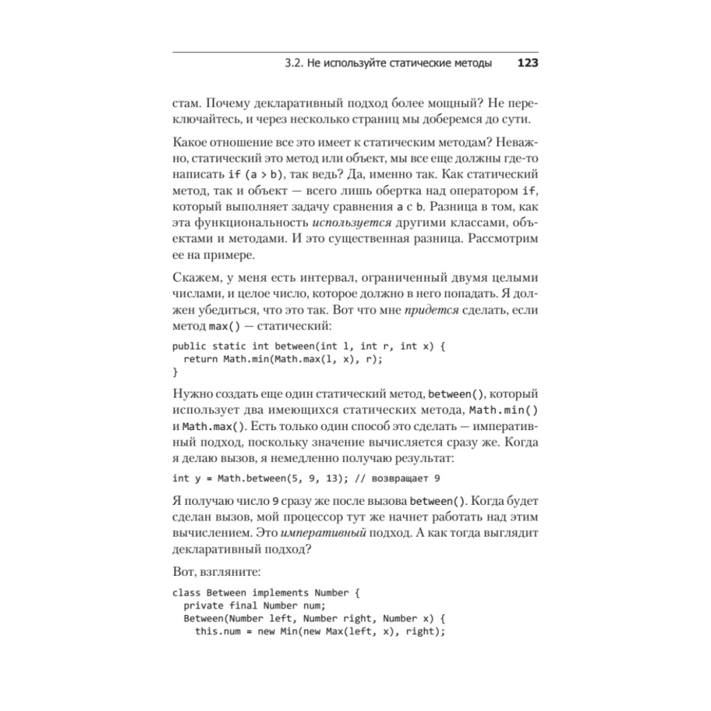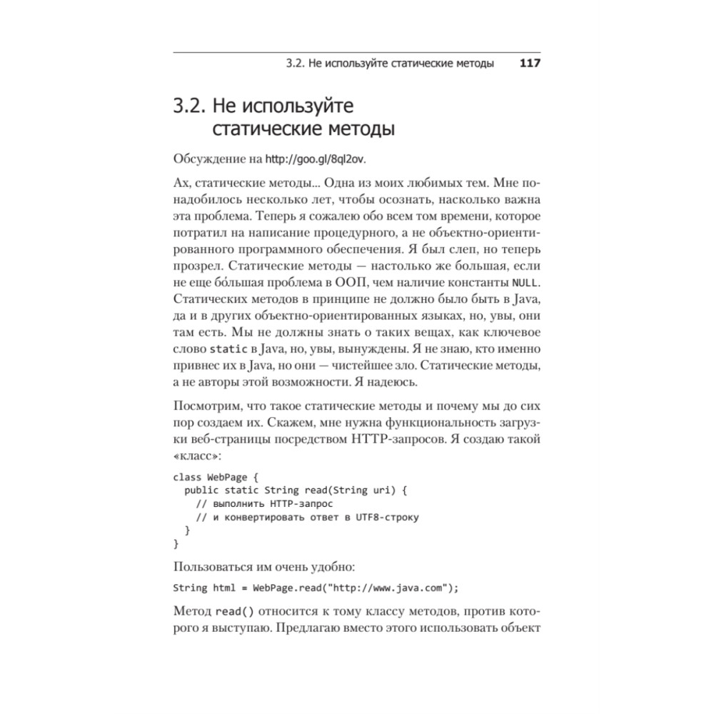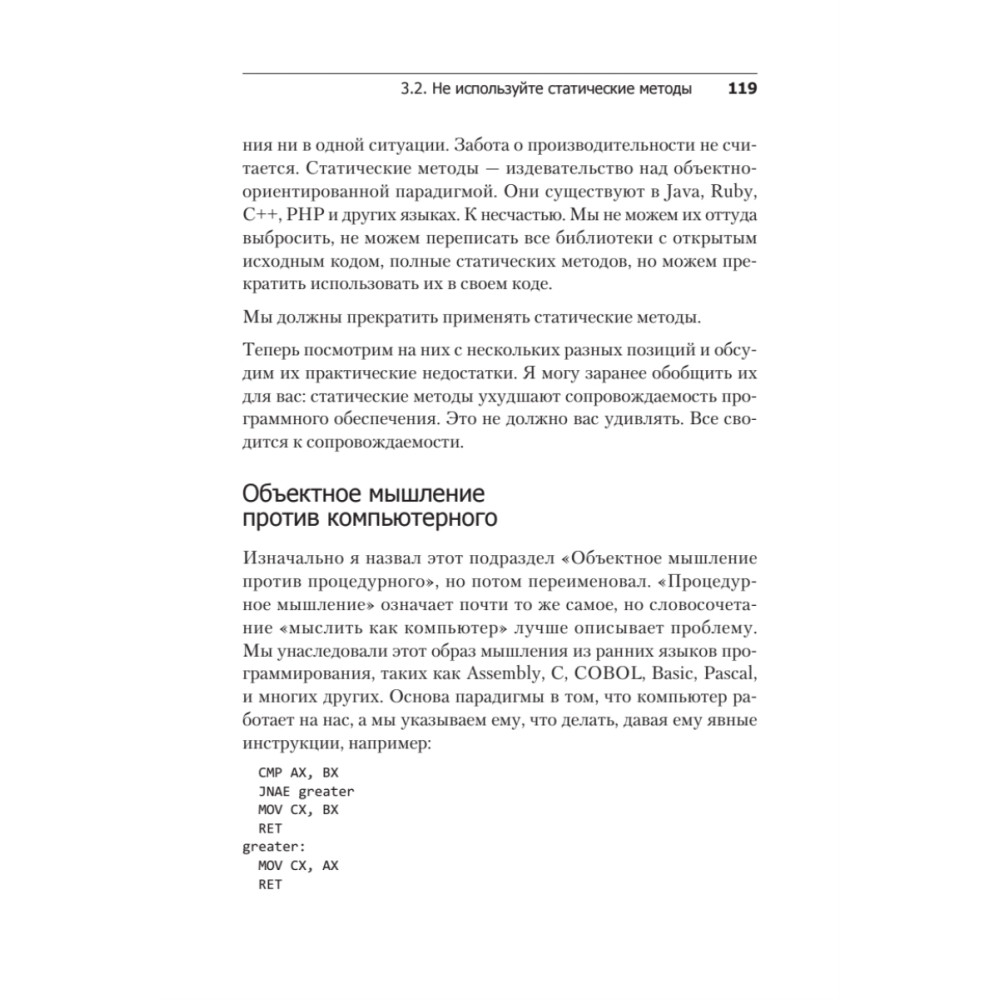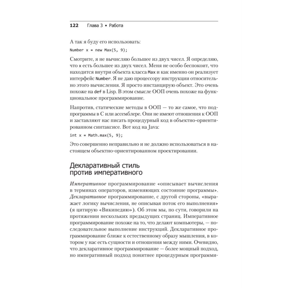 Эта книга всерьез пересматривает суть и принципы объектно-ориентированного программирования (ООП) и может быть метафорически названа "ООП Лобачевского". Автор книги, разработчик с 20-летним стажем, критически анализирует догмы ООП и предлагает взглянуть на эту парадигму совершенно по-новому. Так, он клеймит статические методы, геттеры, сеттеры, изменяемые методы, считая, что это - зло. Для начинающего программиста этот томик может стать просветлением или шоком, а для опытного является обязательным чтением.