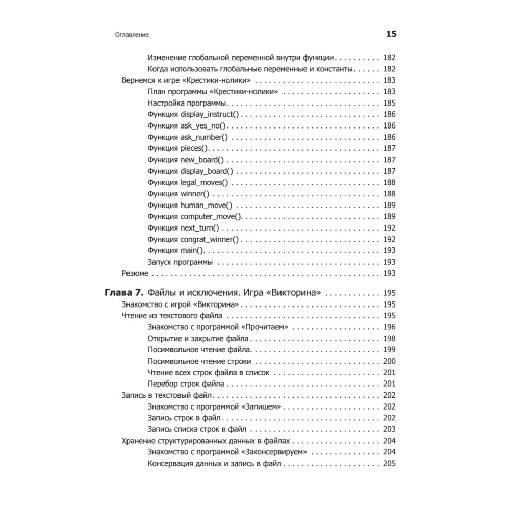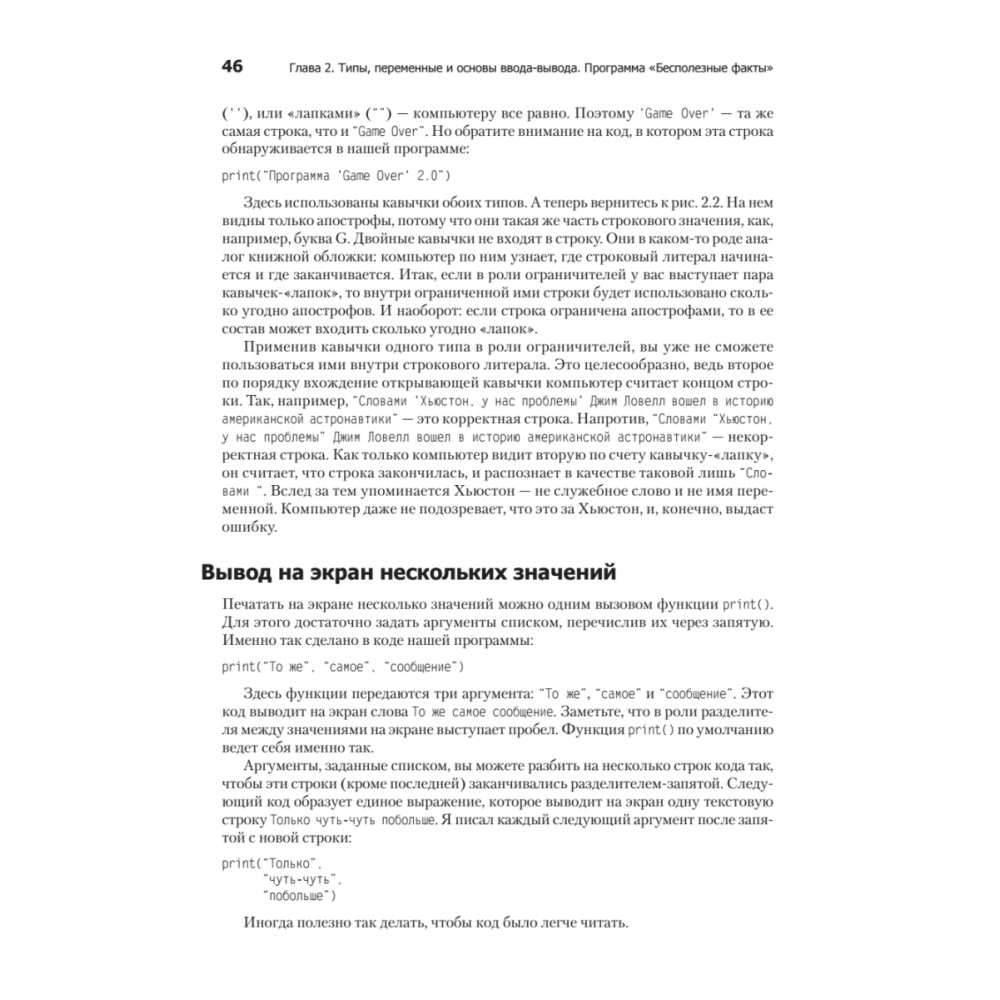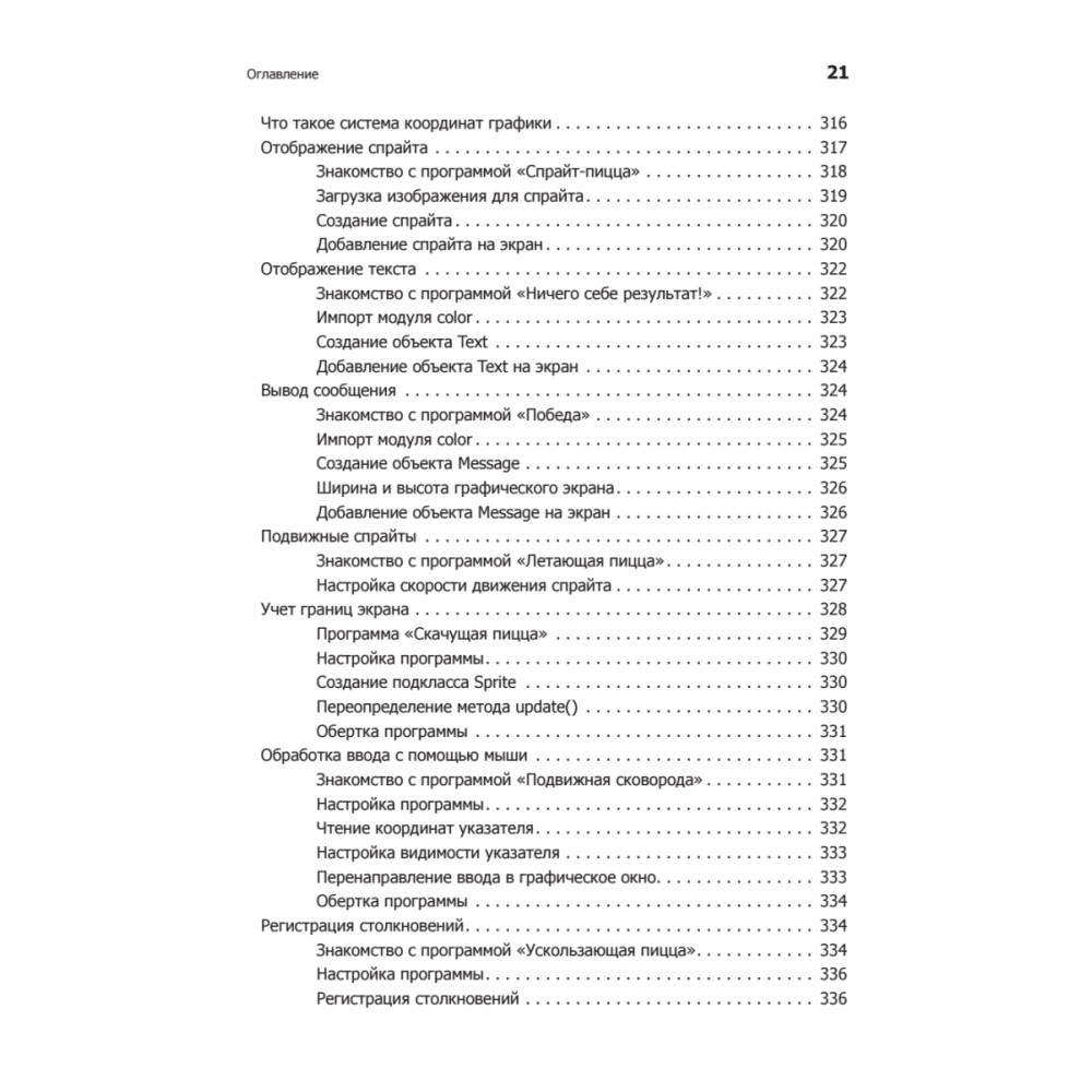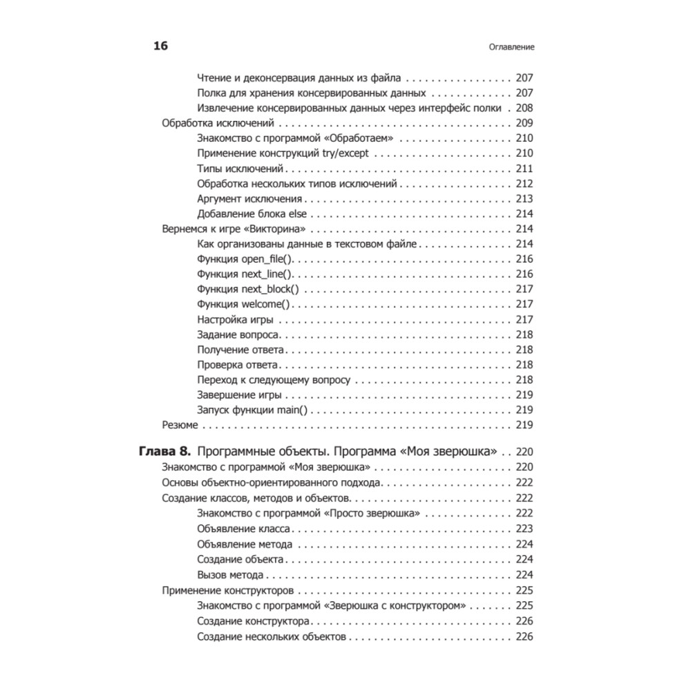 Для лучшего усвоения материала в книге приведено множество примеров программного кода. В конце каждой главы вы найдете проект полноценной игры, иллюстрирующий ключевые идеи изложенной темы, а также краткое резюме пройденного материала и задачи для самопроверки. Прочитав эту книгу, вы всесторонне ознакомитесь с языком Python, усвоите базовые принципы программирования и будете готовы перенести их на почву других языков, за изучение которых возьметесь.