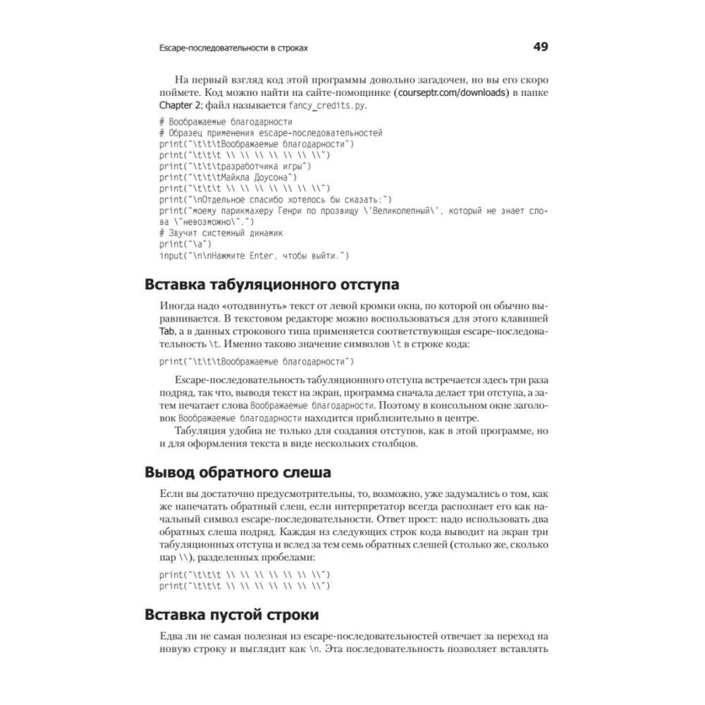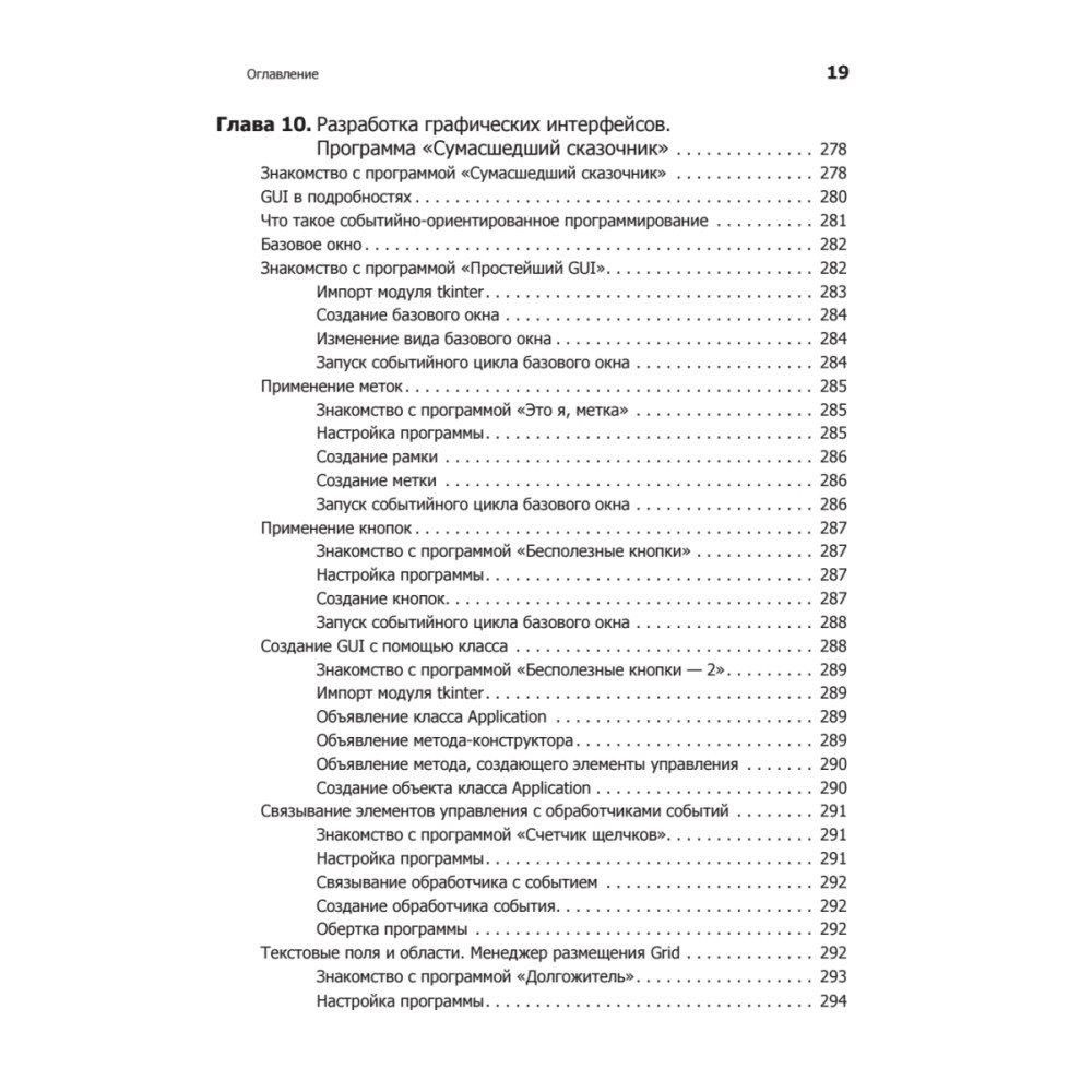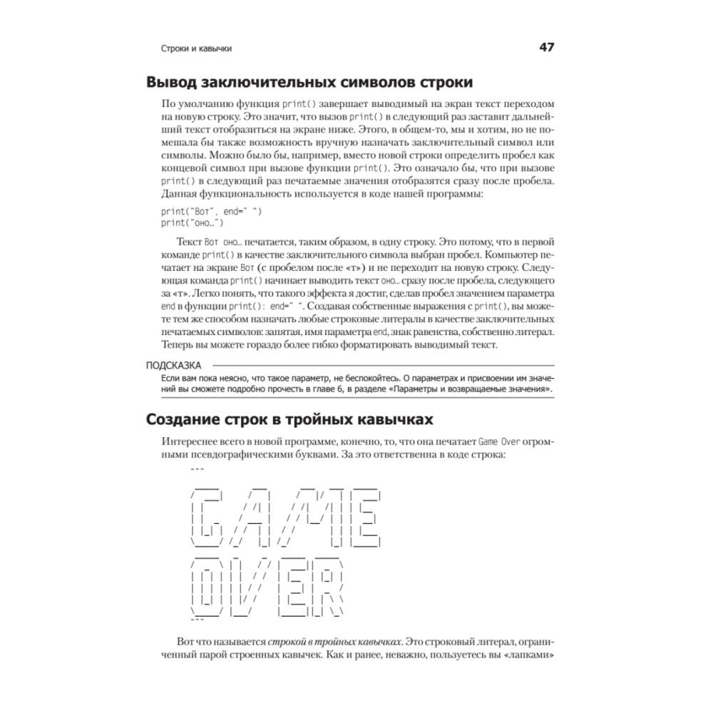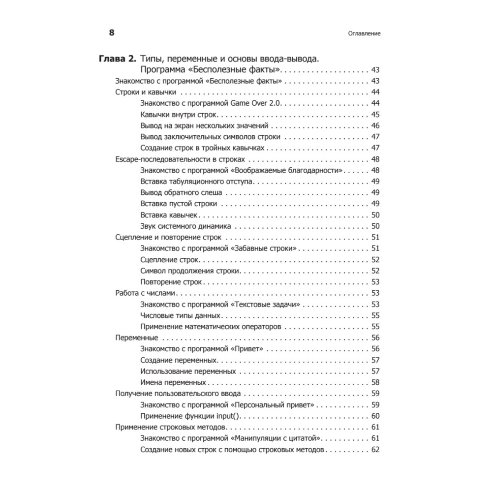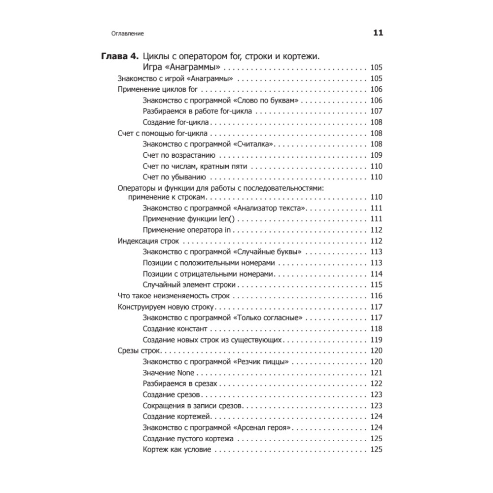 Для лучшего усвоения материала в книге приведено множество примеров программного кода. В конце каждой главы вы найдете проект полноценной игры, иллюстрирующий ключевые идеи изложенной темы, а также краткое резюме пройденного материала и задачи для самопроверки. Прочитав эту книгу, вы всесторонне ознакомитесь с языком Python, усвоите базовые принципы программирования и будете готовы перенести их на почву других языков, за изучение которых возьметесь.