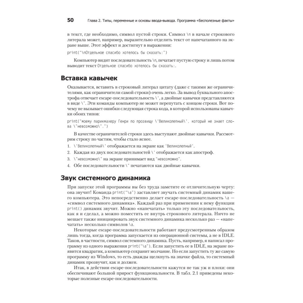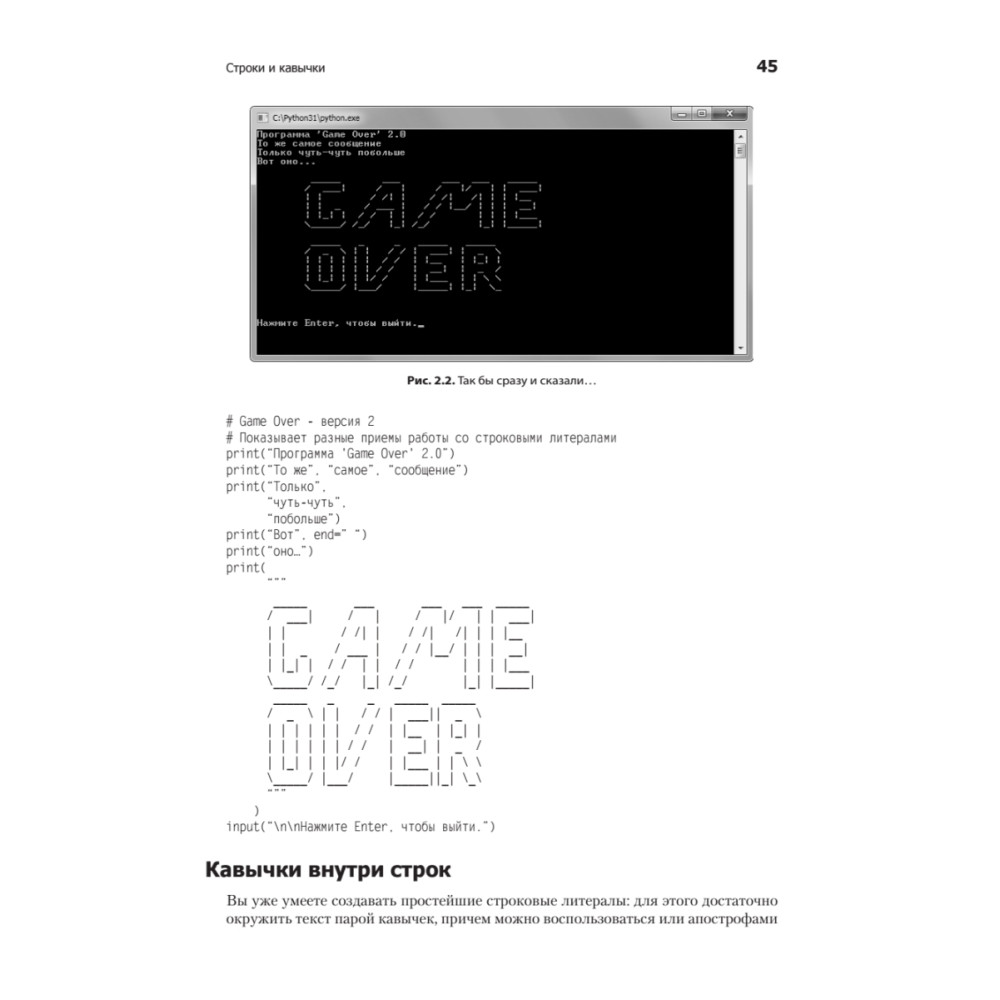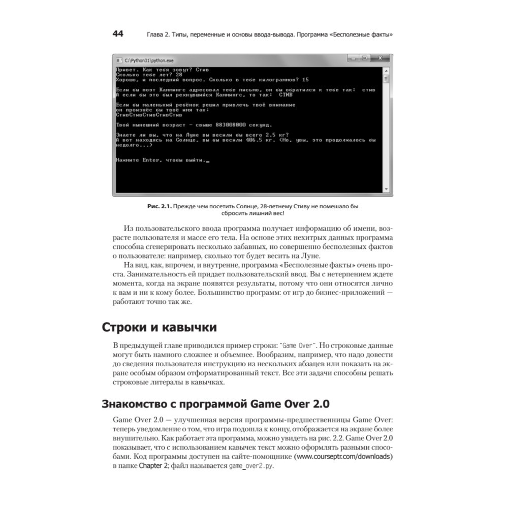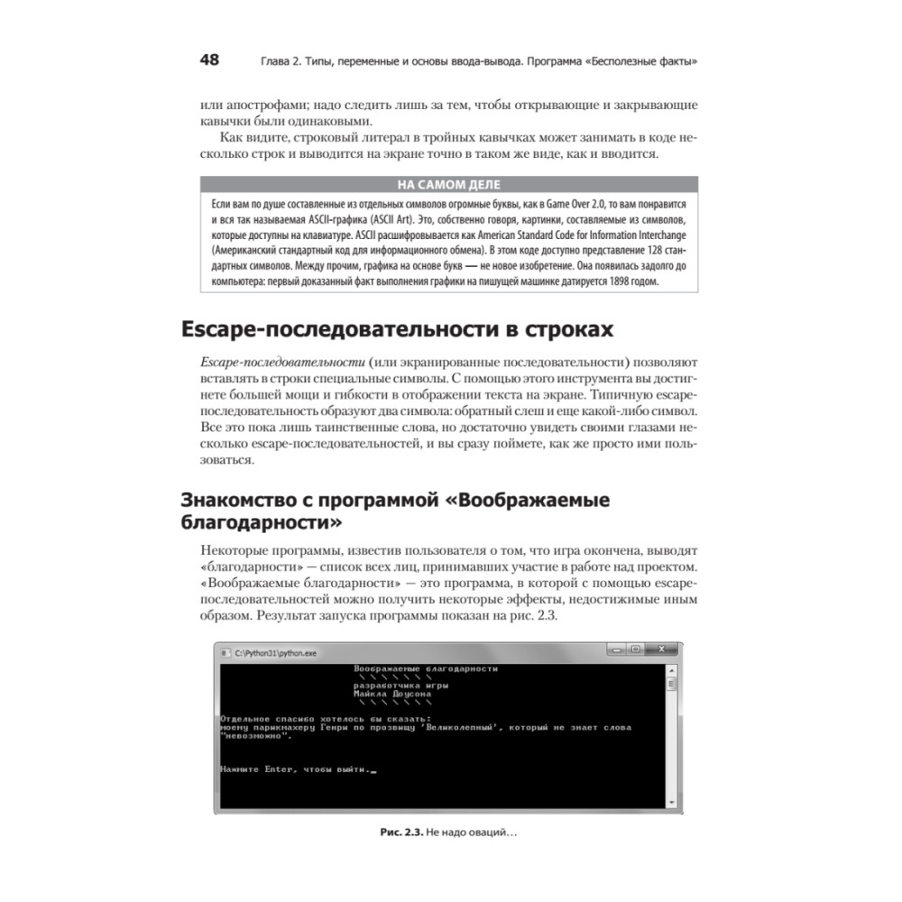 Для лучшего усвоения материала в книге приведено множество примеров программного кода. В конце каждой главы вы найдете проект полноценной игры, иллюстрирующий ключевые идеи изложенной темы, а также краткое резюме пройденного материала и задачи для самопроверки. Прочитав эту книгу, вы всесторонне ознакомитесь с языком Python, усвоите базовые принципы программирования и будете готовы перенести их на почву других языков, за изучение которых возьметесь.