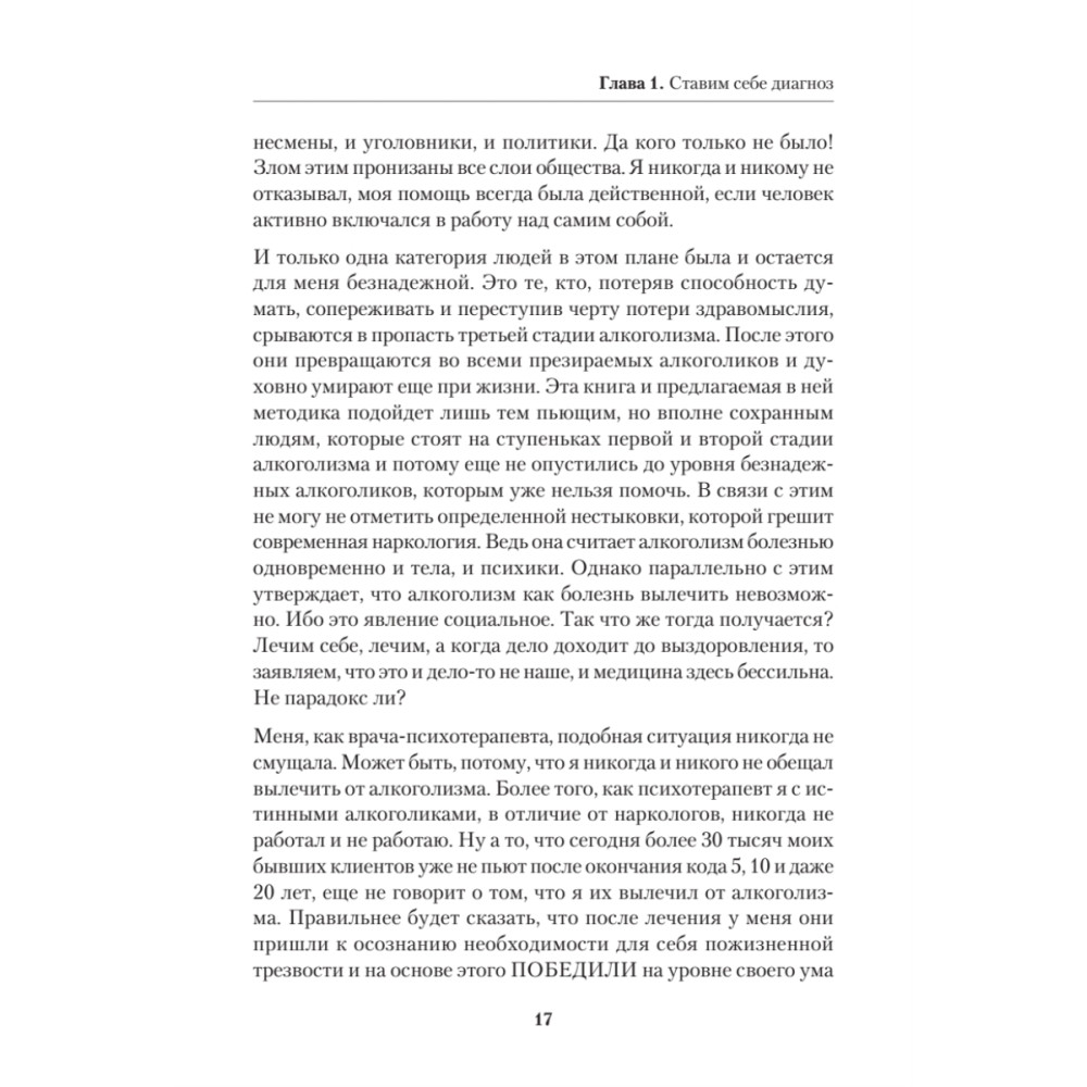 Издание адресовано людям, страдающим алкоголизмом, а также их близким, которые наверняка готовы помогать оступившемуся человеку. Также книга будет полезна широкому кругу людей, столкнувшихся с проблемой зависимости от алкоголя или занимающихся лечением алкоголизма.