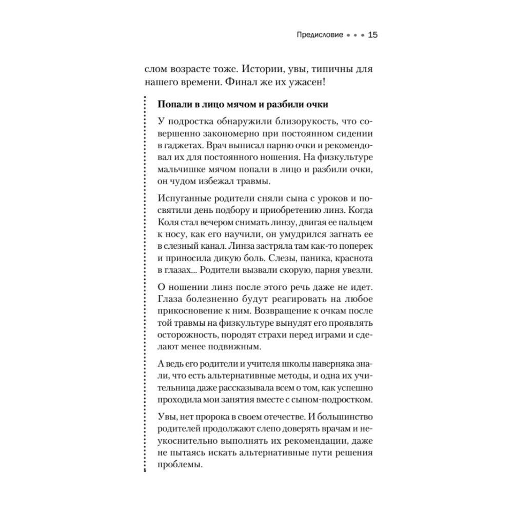 Светлана Троицкая — бессменный руководитель центра естественной коррекции зрения и оздоровления — уже 28 лет помогает людям восстанавливать зрение и избавляться от глазных болезней без операций и лекарств. Автор разрушает стереотипы о причинах возникновения тех или иных проблем с глазами и дает читателям не просто набор упражнений, а комплексную программу для восстановления зрения и здоровья. Благодаря ей множество людей не только избавились от очков и страшных диагнозов, избежали оперативного вмешательства, но и улучшили свое самочувствие в целом. Нормализация давления и уровня сахара в крови, снижение веса и избавление от бессонницы — это лишь малая часть «побочных эффектов» уникальной системы восстановления зрения Светланы Троицкой. При этом программа построена таким образом, что выполнять ее сможет даже самый занятой человек. Подарите себе и своим детям здоровье и прекрасное зрение на всю жизнь!