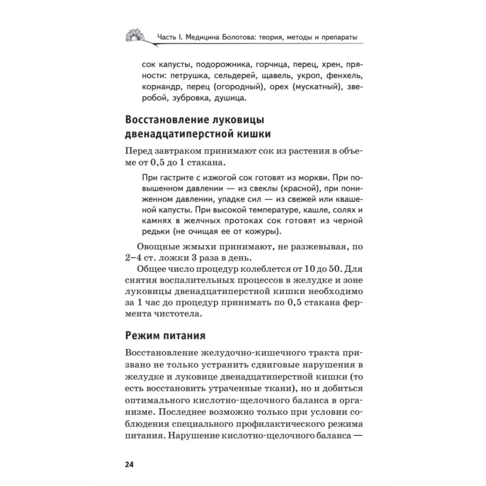 Наконец-то появился универсальный справочник лекарственных препаратов, разработанных крупнейшим ученым современности — Борисом Болотовым. Большинство лекарств, созданных академиком, основаны на использовании ферментов молочно-кислого брожения лекарственных растений. Их приготовление и применение отличается простотой и доступно каждому. Краеугольным камнем аптеки Болотова также является царская водка, благодаря которой можно замедлить старение и предупредить множество болезней за счет закисления организма. - Как приготовить препараты в домашних условиях? - Где взять сырье? - Как правильно применять препараты? - Какие лекарства применять в том или ином случае? Ответы на все вопросы вы найдете в «Аптеке здоровья по Болотову». Поиски облегчит тщательно разработанная структура книги. Страница Б. Болотова в Интернете расположена на сайте www.beztabletok.ru. Телефон московского представительства Б. Болотова: 8 (499) 748-31-87.