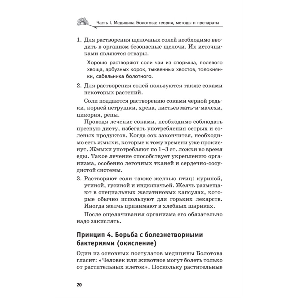 Наконец-то появился универсальный справочник лекарственных препаратов, разработанных крупнейшим ученым современности — Борисом Болотовым. Большинство лекарств, созданных академиком, основаны на использовании ферментов молочно-кислого брожения лекарственных растений. Их приготовление и применение отличается простотой и доступно каждому. Краеугольным камнем аптеки Болотова также является царская водка, благодаря которой можно замедлить старение и предупредить множество болезней за счет закисления организма. - Как приготовить препараты в домашних условиях? - Где взять сырье? - Как правильно применять препараты? - Какие лекарства применять в том или ином случае? Ответы на все вопросы вы найдете в «Аптеке здоровья по Болотову». Поиски облегчит тщательно разработанная структура книги. Страница Б. Болотова в Интернете расположена на сайте www.beztabletok.ru. Телефон московского представительства Б. Болотова: 8 (499) 748-31-87.