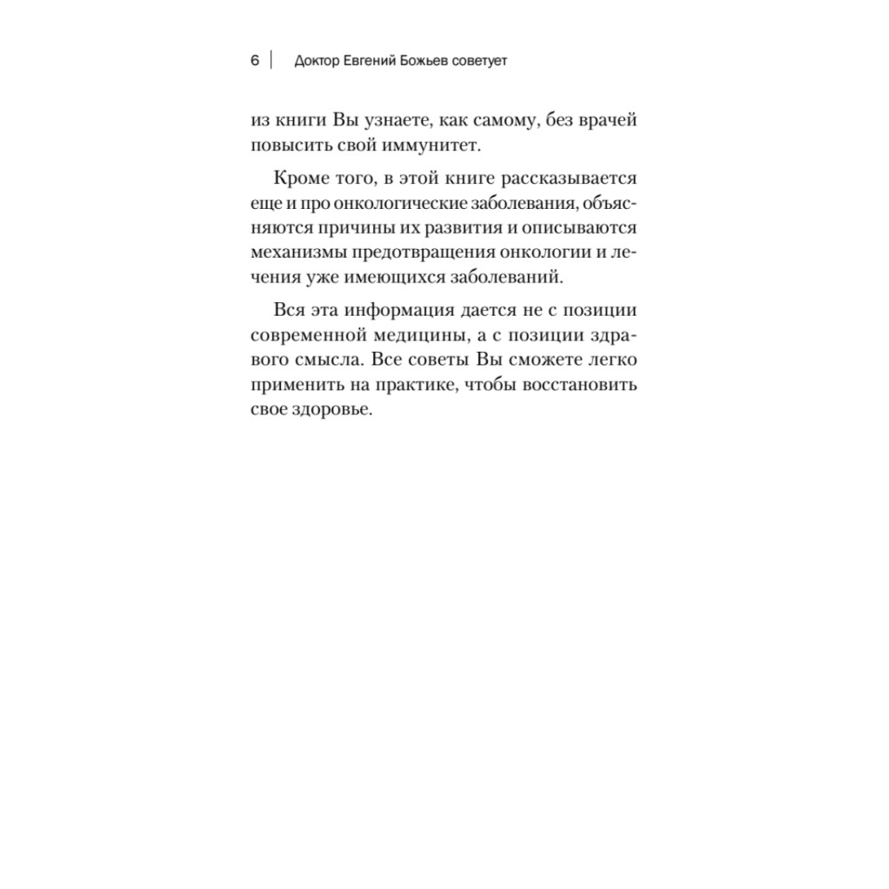 Евгений Божьев — невролог, мануальный терапевт, сторонник альтернативной медицины — учит исцелению без лекарств и докторов. Его уникальные оздоровительные методики проверены годами медицинской практики, его авторские видео на канале YouTube набирают миллионы просмотров. Доктор Божьев убежден: любое заболевание можно предотвратить. Эта книга открывает секреты здорового образа жизни и крепкого иммунитета. В ней вы найдете простые рекомендации, как самому, без врачей повысить свой иммунитет, а также узнаете о причинах развития, профилактике и лечении онкологии и других заболеваний.
