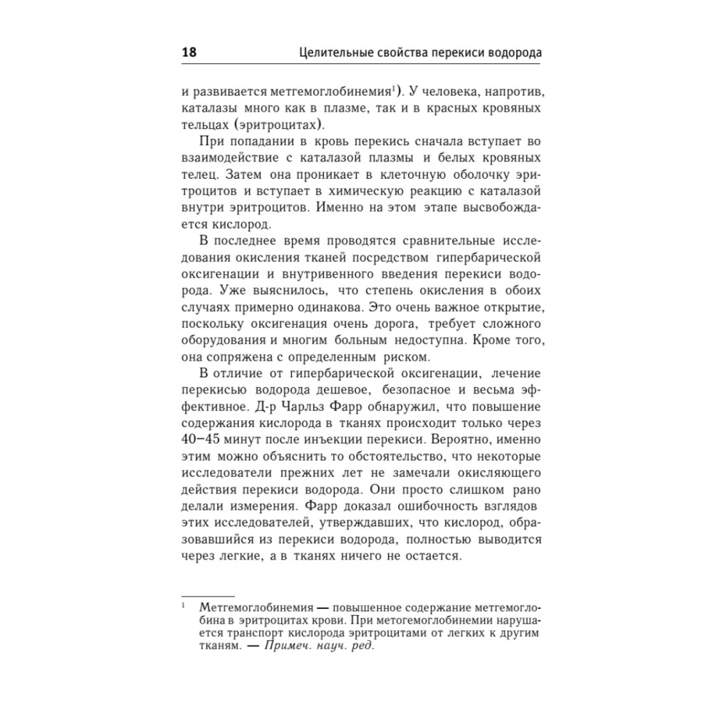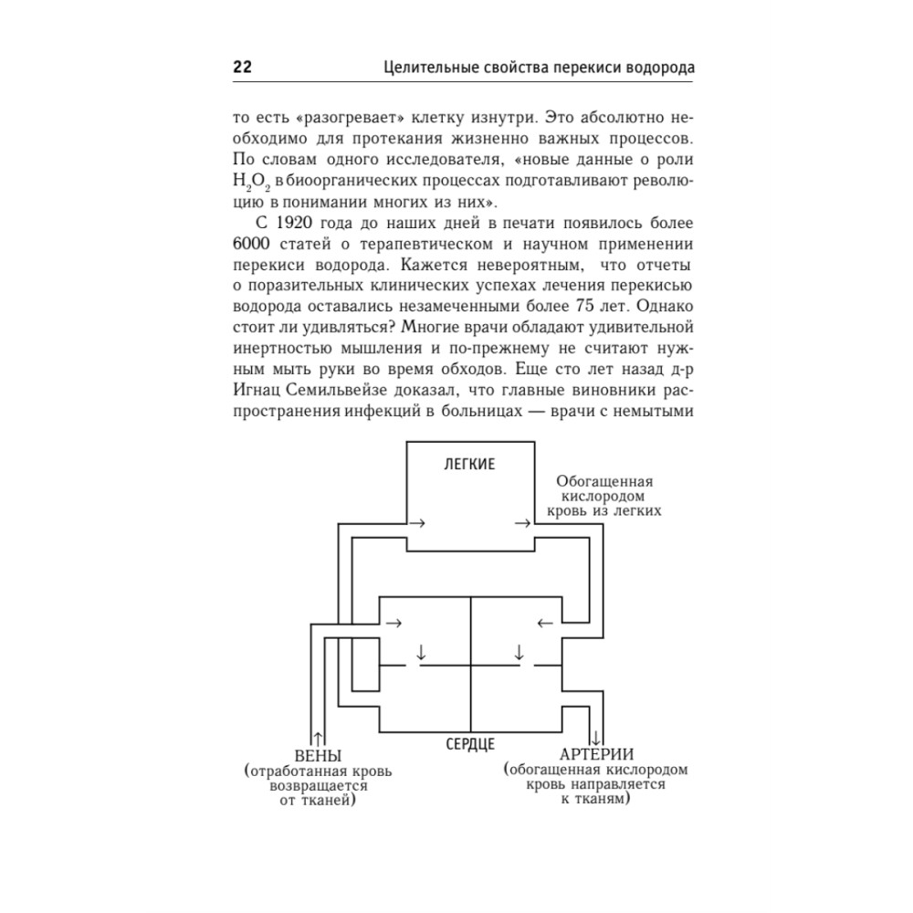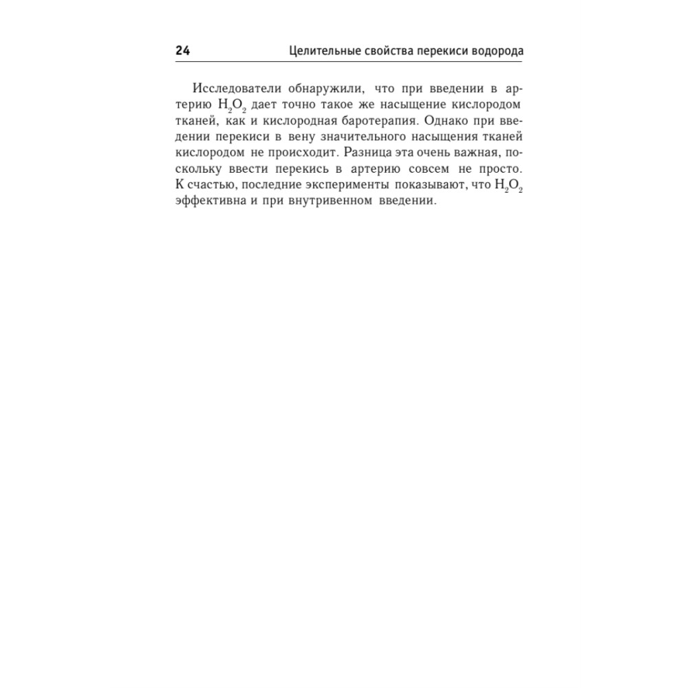 Значительное применение перекись водорода находит в борьбе с различными заболеваниями. Клинический опыт показывает, что при помощи этого вещества можно побеждать такие серьезные недуги, как рак, СПИД, атеросклероз, эмфизема, рассеянный склероз, гепатит, гангрена и другие. Перекись также помогает при простудных заболеваниях (в том числе гриппе), депрессии, заболеваниях десен. В выдержавшей три издания на Западе книге приводятся удивительные факты, рекомендации и отклики пациентов, на себе испытавших целительное воздействие этого всем известного вещества.