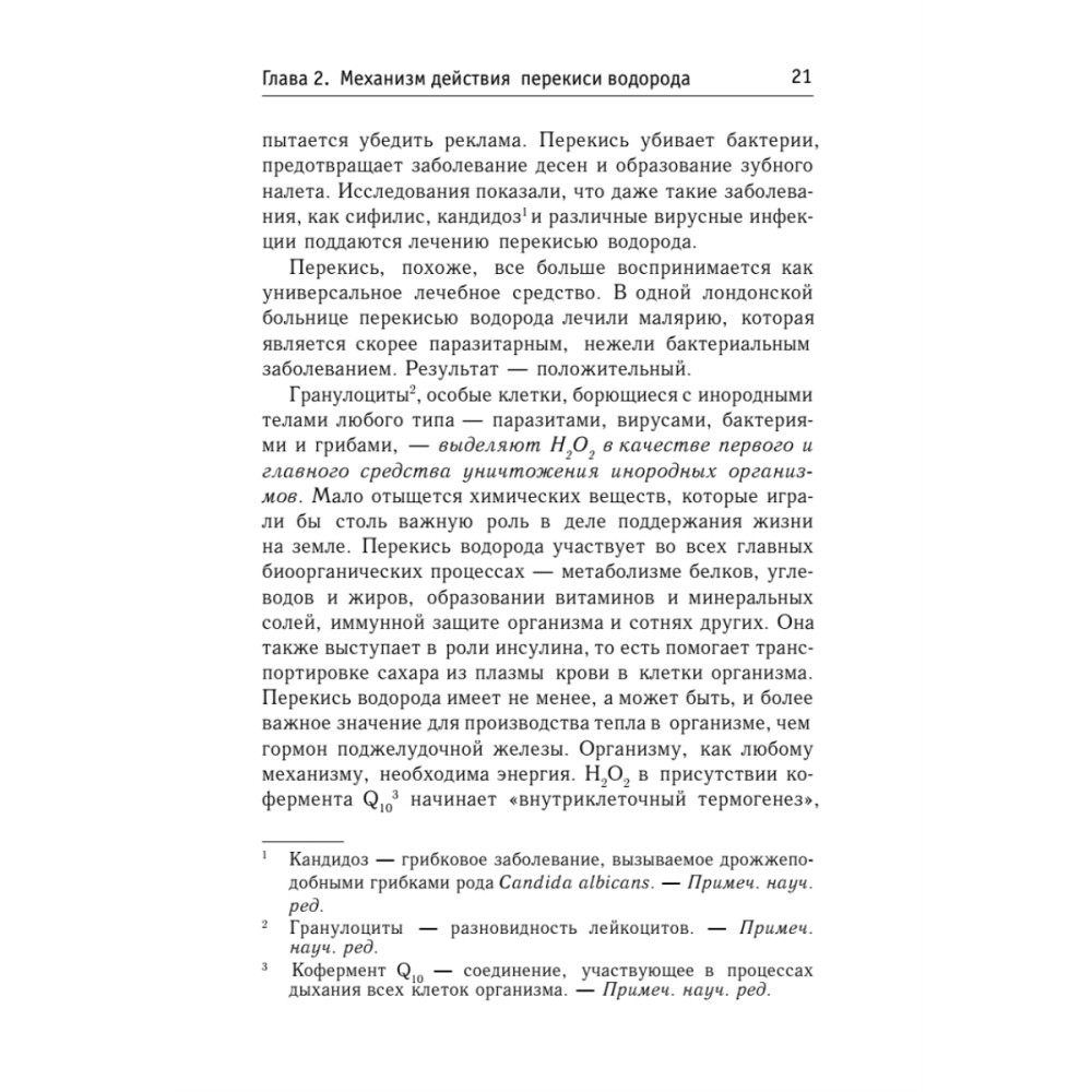 Лечиться перекисью? Неужели такое возможно? Оказывается, перекись водорода, если ею разумно пользоваться, обладает огромными целительными возможностями, участвуя в важнейших биоорганических процессах. Гранулоциты, клетки иммунитета, при помощи перекиси водорода уничтожают «непрошеных гостей» организма — вирусы, бактерии, грибковые инфекции. Присутствие перекиси необходимо для протекания белкового, углеводного и жирового обмена.