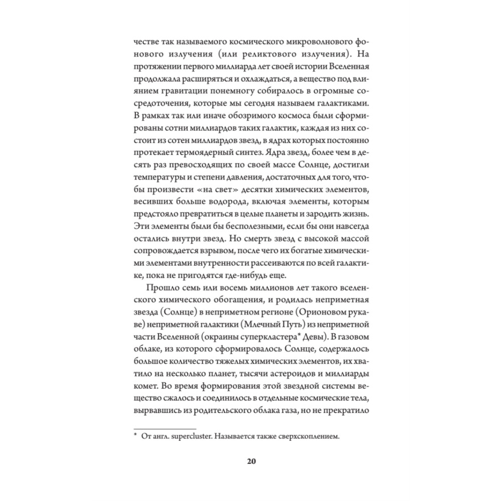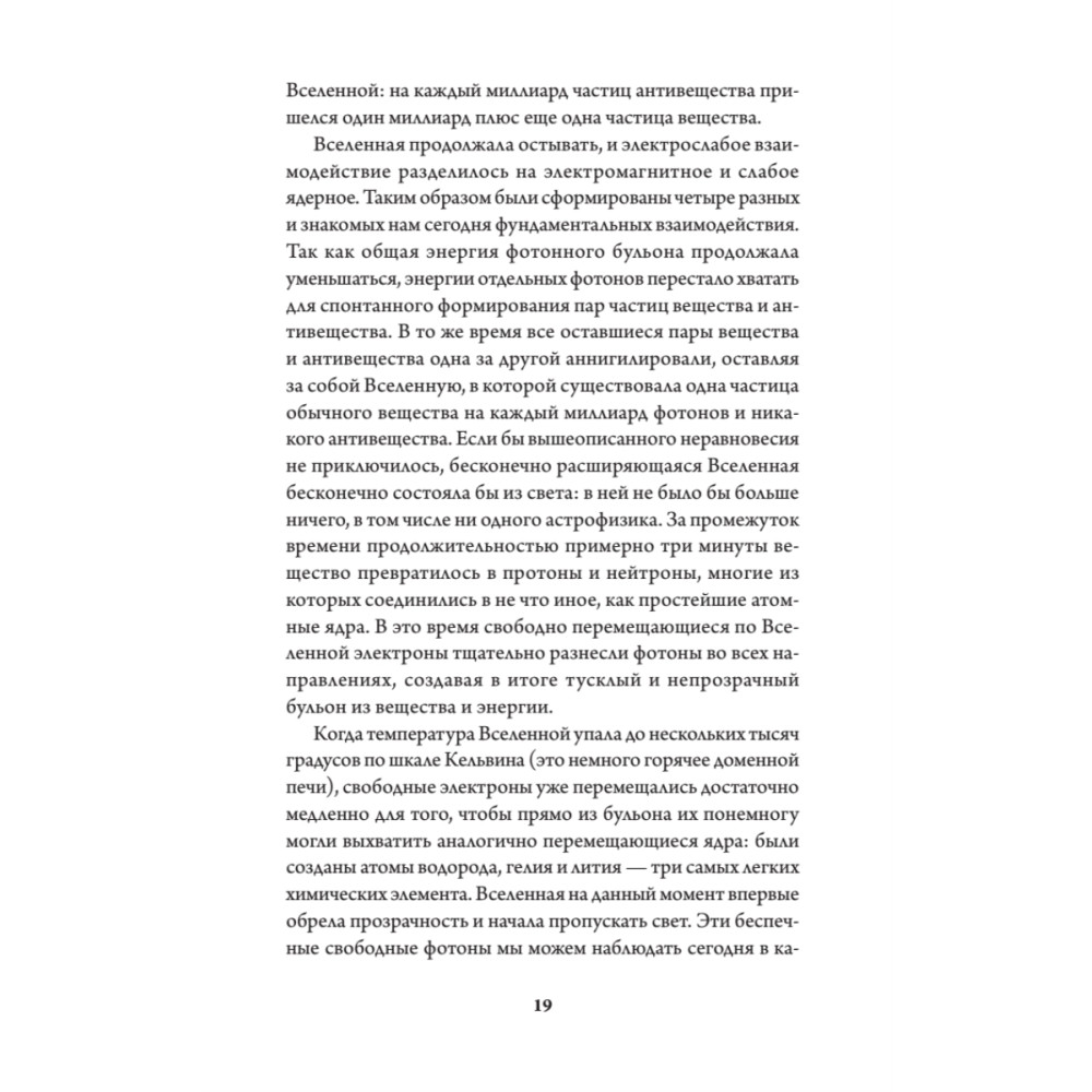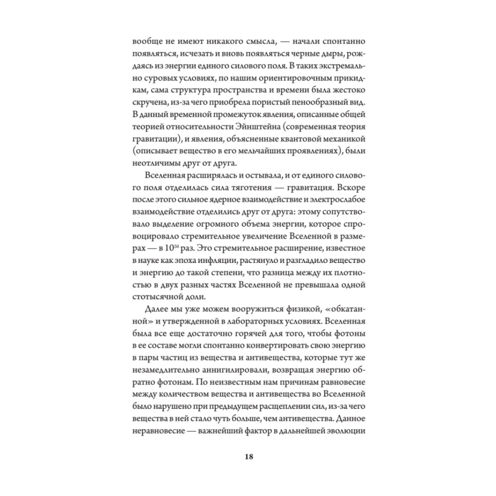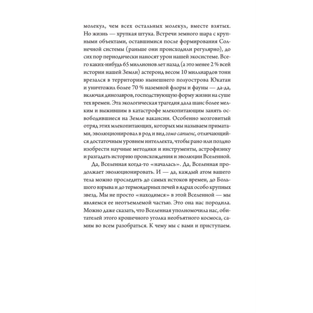 14 миллиардов лет. Полет нормальный. А ведь когда-то, сразу после Большого Взрыва, Вселенная увеличилась настолько, что достигла размеров грейпфрута. За эти 10-33 секунды в ее истории прошла целая эпоха. Когда-то во Вселенной было настолько жарко, что в ней еще не могли образоваться звезды, а потом все стало гораздо интереснее. Выйдите ясной ночью на улицу, полюбуйтесь просторами Млечного пути - а потом прочтите эту книгу и осознайте, что история всего на свете только начинается. У вас в руках - трепетная, увлекательная, завораживающая и фундаментальная книга для всех, кто любит смотреть в небо и хочет понимать, что же он там видит. Добро пожаловать во Вселенную (кстати, и полотенце не забудьте)