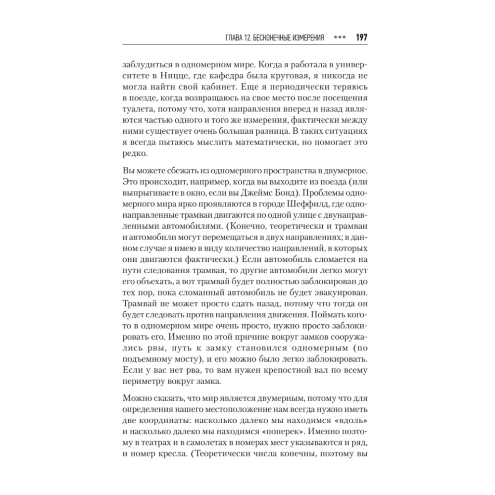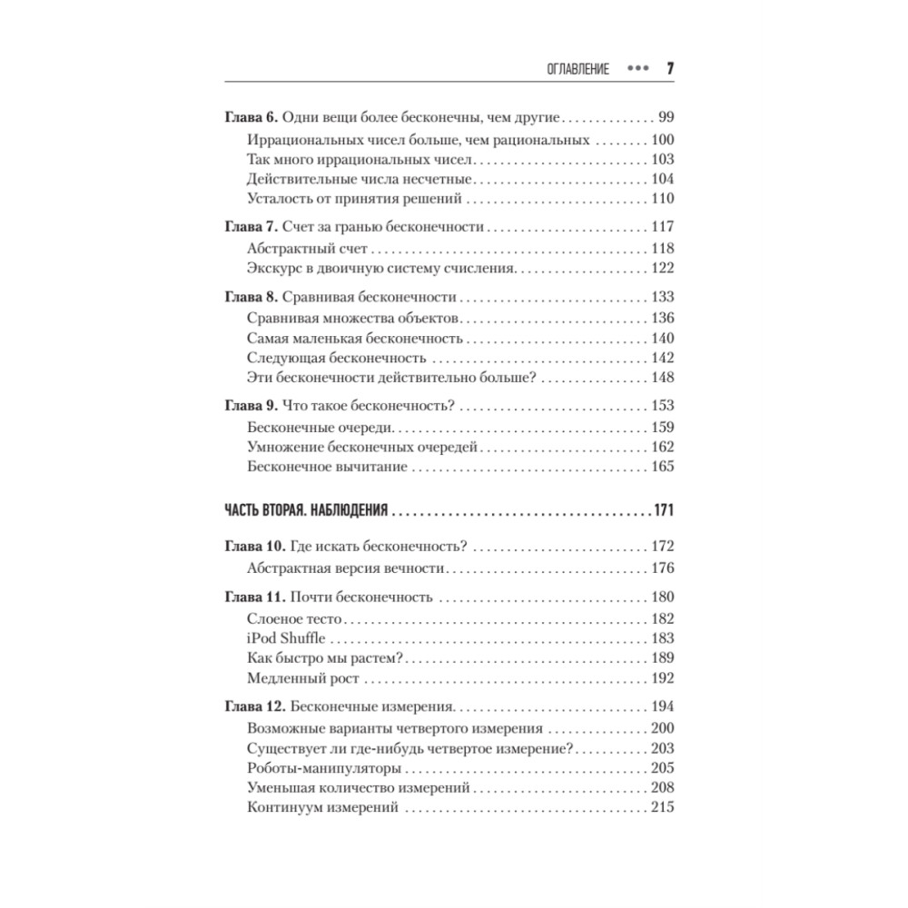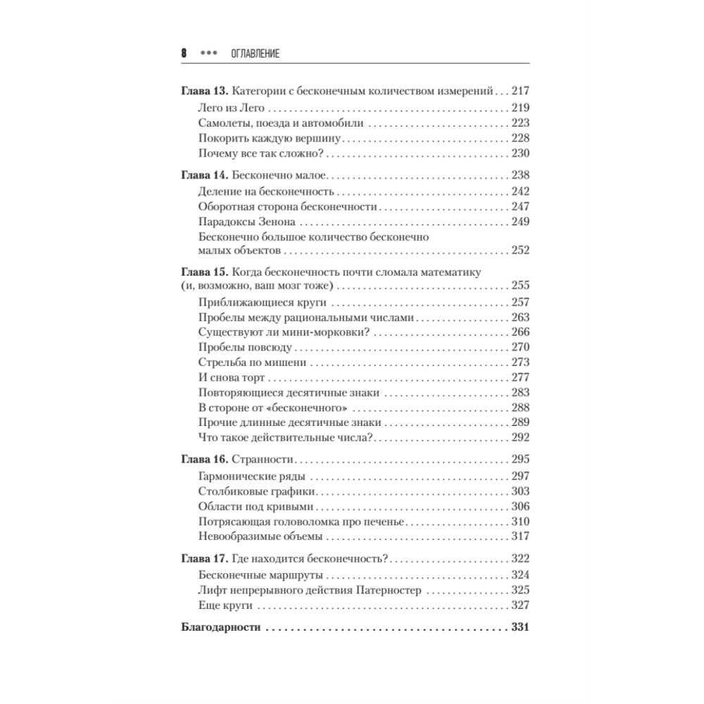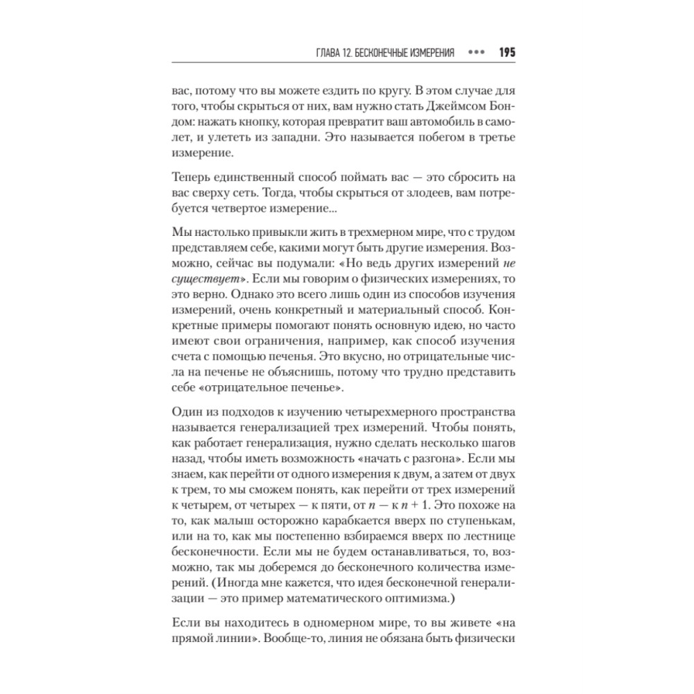 Можете представить себе что-нибудь огромнее Вселенной, но в то же время спокойно помещающееся в вашей голове? Что же это такое? Бесконечность! Юджиния Ченг отправляет нас в потрясающее математическое путешествие, чтобы разобраться в самых загадочных математических абстракциях. Почему некоторые числа невозможно сосчитать? Почему бесконечность + 1 не то же самое, что 1+ бесконечность? Мы узнаем о парадоксе «Гранд-отеля», сможем накормить 7 миллиардов человек с помощью шахматной доски, и даже получим бесконечное количество печенек из маленького (конечного) кусочка теста. Всё это позволит понять и полюбить такую странную и загадочную абстрактную математику. Невероятная книга об огромной и бесконечной Вселенной увлекает и интригует, показывая как один маленький математический символ вмещает в себя огромную идею.