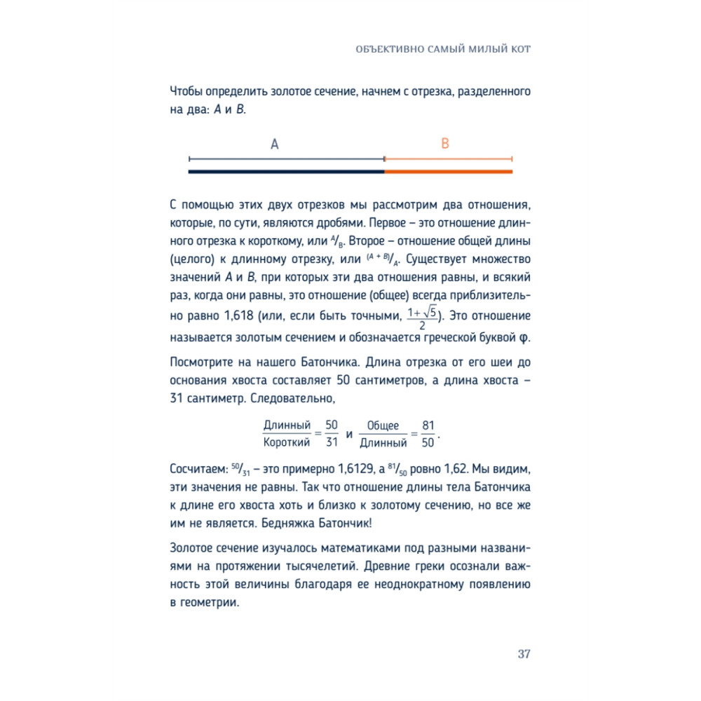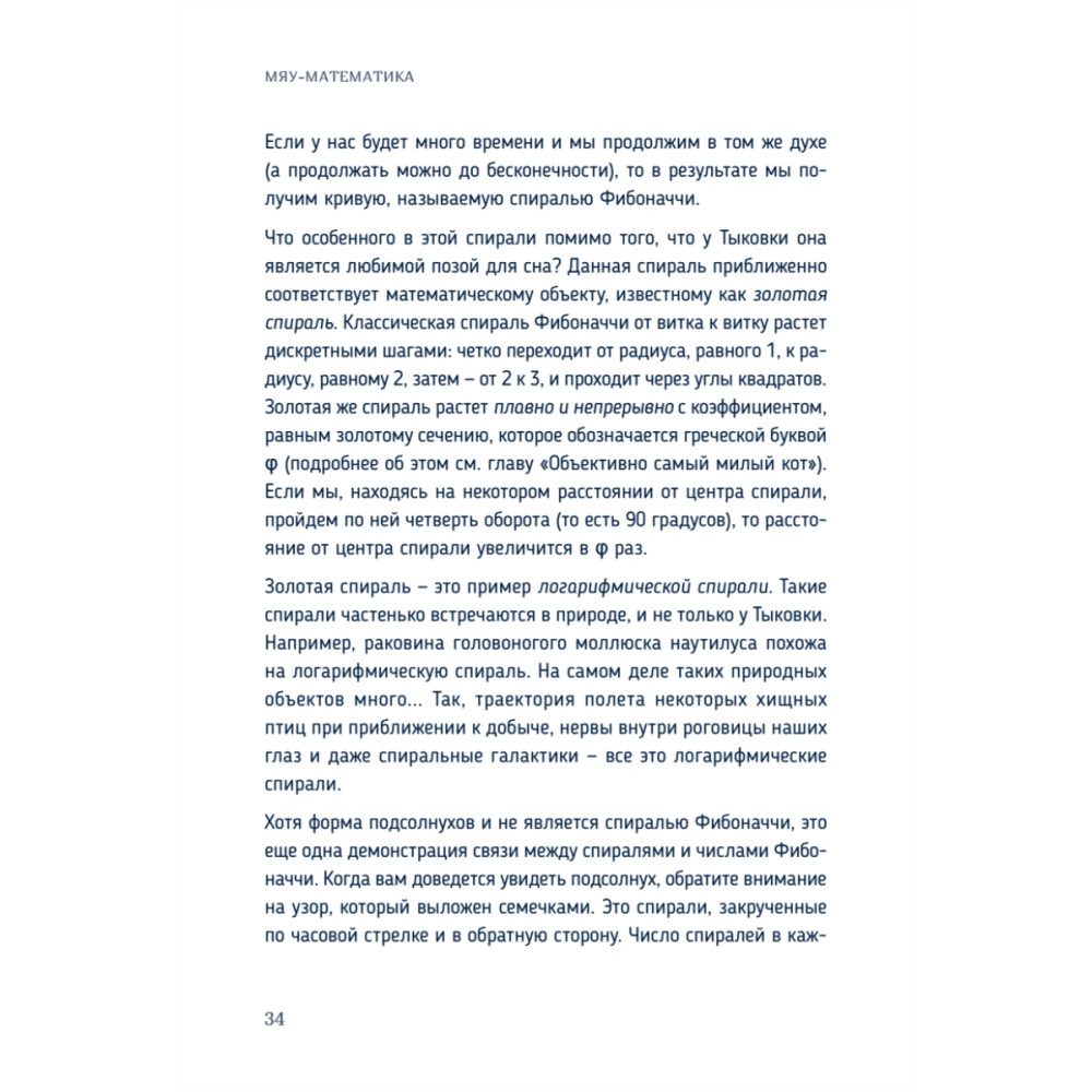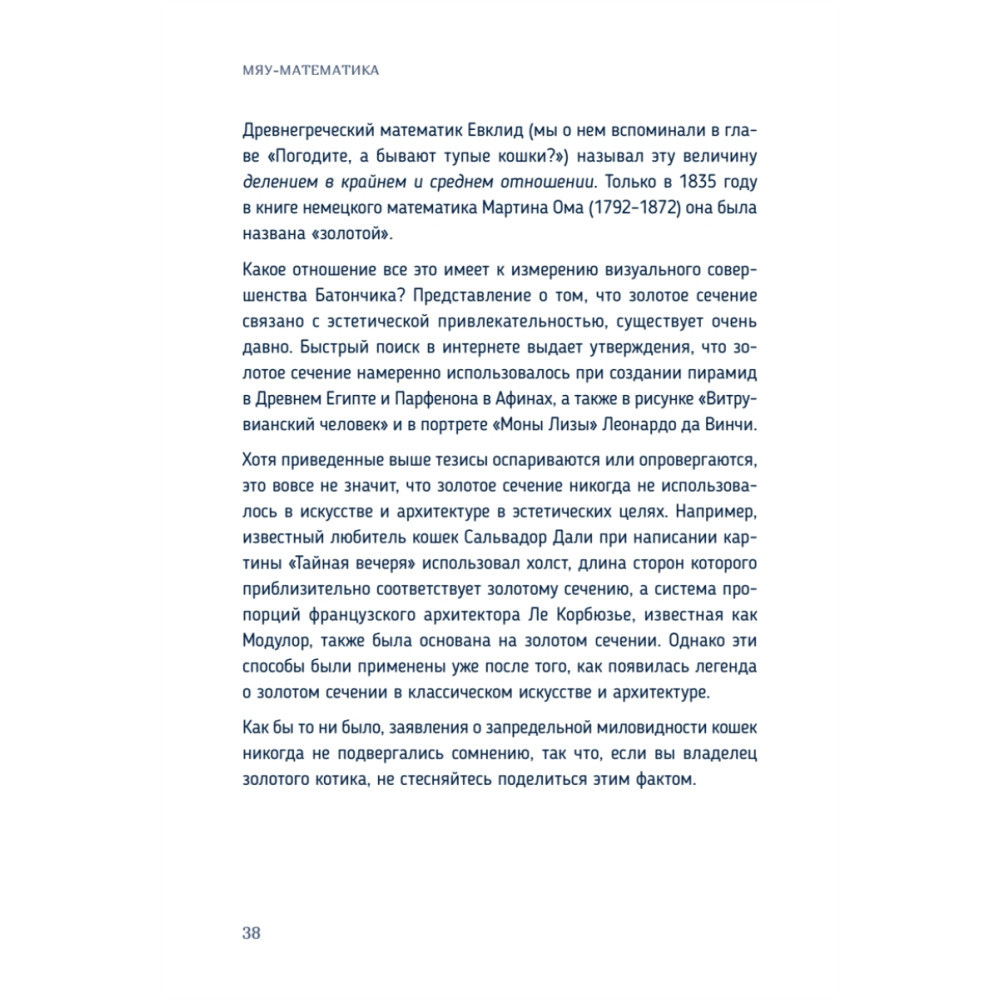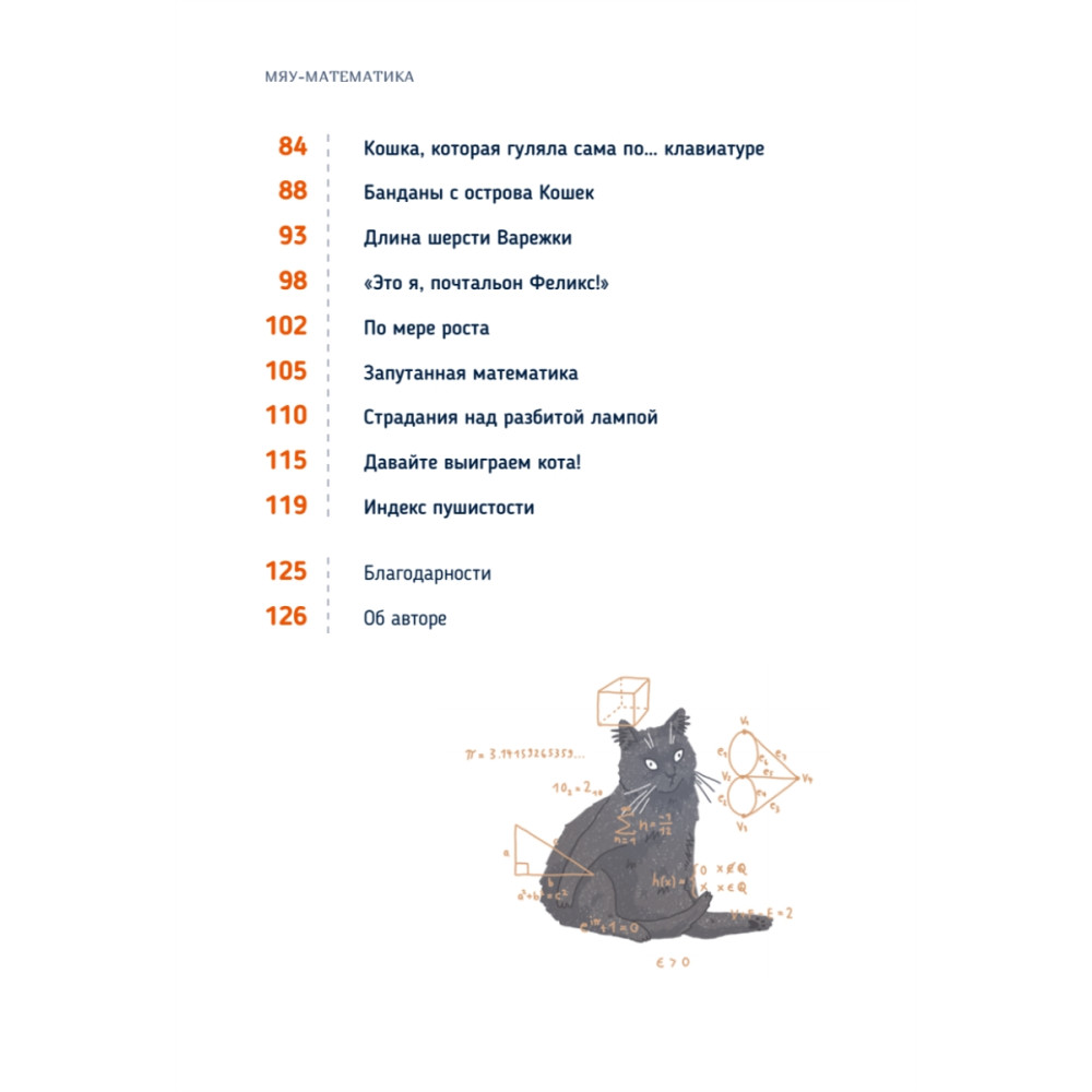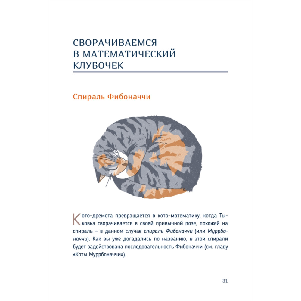 Кото-математика? Именно! В своей книге Дэниел М. Лук превращает скучные числа в захватывающие приключения, где каждый урок ведет... кот! Изучи теорему Муррфагора и научись вычислять лапотенузу. Узнай, почему не все коты «тупые»! Раздели 5 банок еды на 6 питомцев, используя египетские дроби. Проследи за котами Муррбоначчи, чье потомство и умение сворачиваться в спираль являют нам скрытые законы природы. Заинтригованы? А как насчет золотого сечения, определяющего самого милого кота на свете? Или метода Эйлера, позволяющего пушистым проказникам точно рассчитывать свои паркур-прыжки? Даже теория хаоса становится понятной, когда кошка съедает бабочку. Тебя ждут бесконечность рыб на кошачий обед, загадки топологии (коты-хлебушки и ленты Мяубиуса!), а также парадокс дней рождения: у 23 котиков 50-процентная вероятность совпадения дней кота! Узнай про индекс пушистости и почему маленькие кошки "выгоднее"! Эта книга — не просто о математике, а о том, что математика вездесуща, даже когда коты управляют миром. В книге нет заумных терминов, она написана легко, в формате веселых диалогов автора с его четырьмя котами-соавторами и бесконечным множеством их пушистых товарищей по математическим играм. Присоединяйся к Мяу-Мяу, Вермишельке, Конану-Коту и Миссис Вафельке в этом увлекательном путешествии! Мяу!