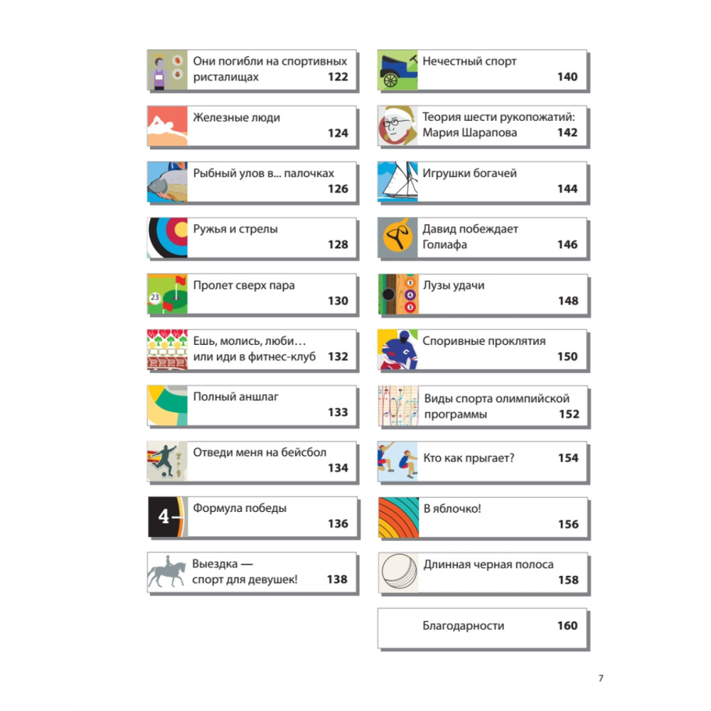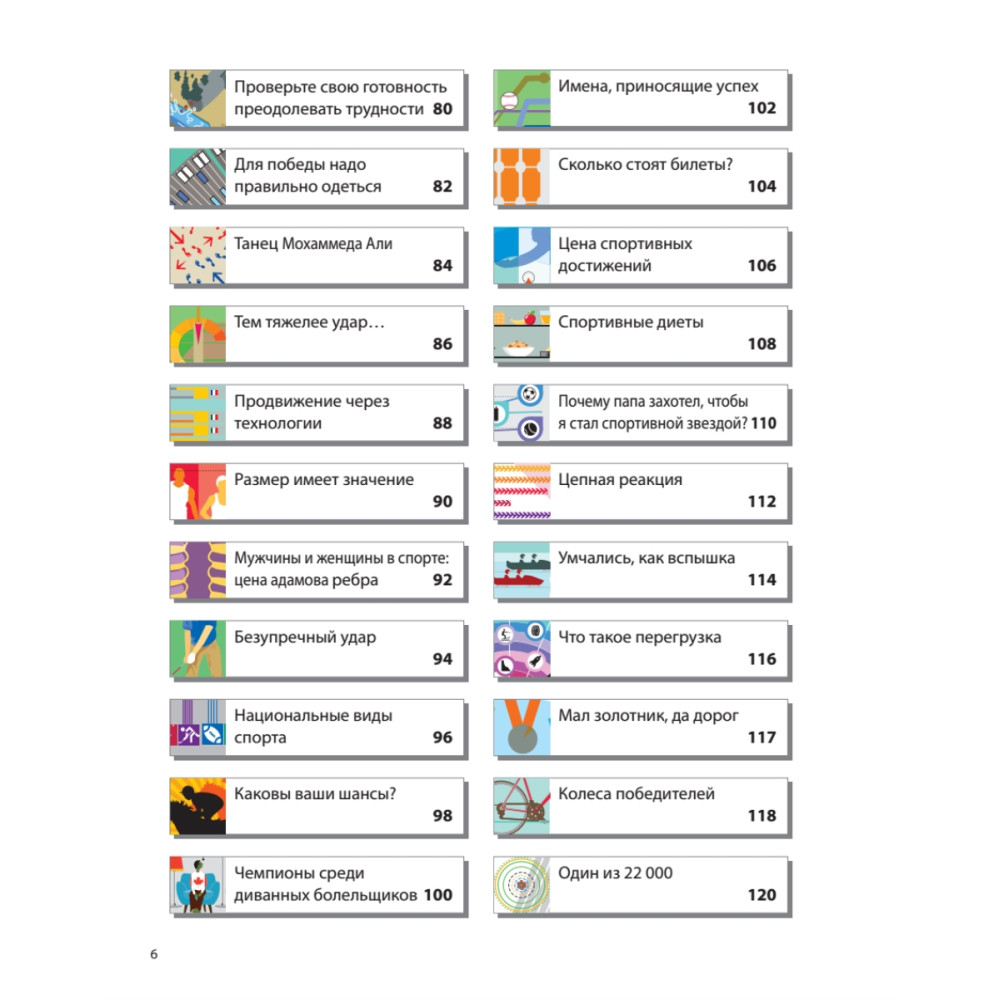 Если вам нужна книга, в которой на каждый вопрос о спорте есть ответ, то вам больше не надо искать — вы держите ее в руках. На страницах вы найдете все что угодно: от танцевальных движений Мохаммеда Али до уровня децибел звуков, издаваемых современными теннисистками,— здесь все подробно описано, изображено и проанализировано. Более 100 потрясающих, невероятных фактов о спорте! Издание представляет уникальные, остроумные и неожиданные факты о каждом виде спорта — от бадминтона до каратэ, от крикета до хоккея.