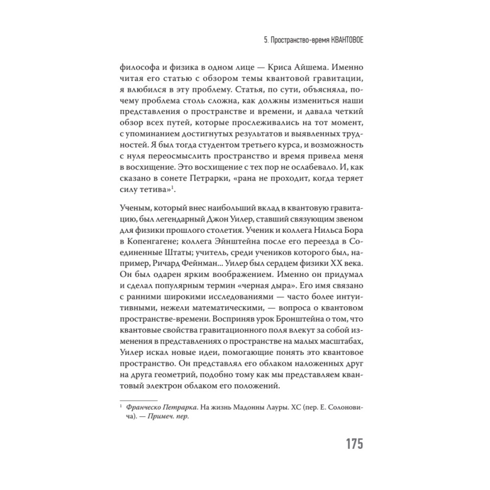«Главный парадокс науки состоит в том, что открывая нам твердые и надежные знания о природе, она в то же время стремительно меняет ею же созданные представления о реальности. Эта парадоксальность как нельзя лучше отражена в книге Карло Ровелли, которая посвящена самой острой проблеме современной фундаментальной физики — поискам квантовой теории гравитации.