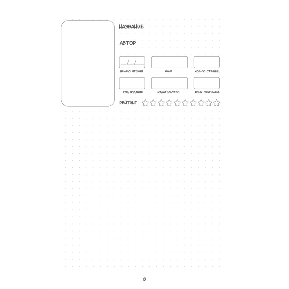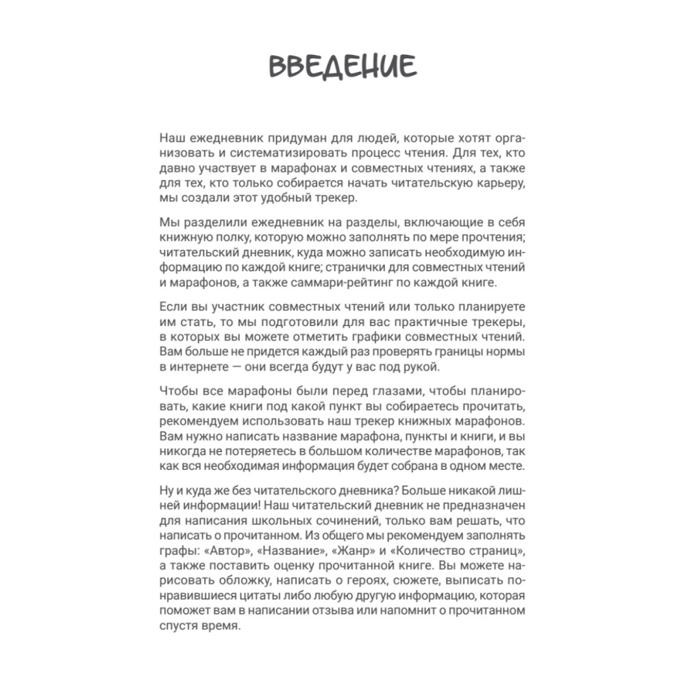 Этот ежедневник подходит как для продвинутых читателей, так и для тех, кто только начинает свой читательский путь. Он позволяет систематизировать прочитанное, вести учёт своих книжных марафонов и не забывать про совместные чтения. Внутренний блок рассчитан на 45 книг - для каждой выделен один разворот, поэтому в нём достаточно места для записи всех ваших мыслей и впечатлений. На книжной полке можно отмечать планируемые или уже прочитанные книги. В конце вы найдёте рейтинг книг, который наглядно обобщит прочитанное.