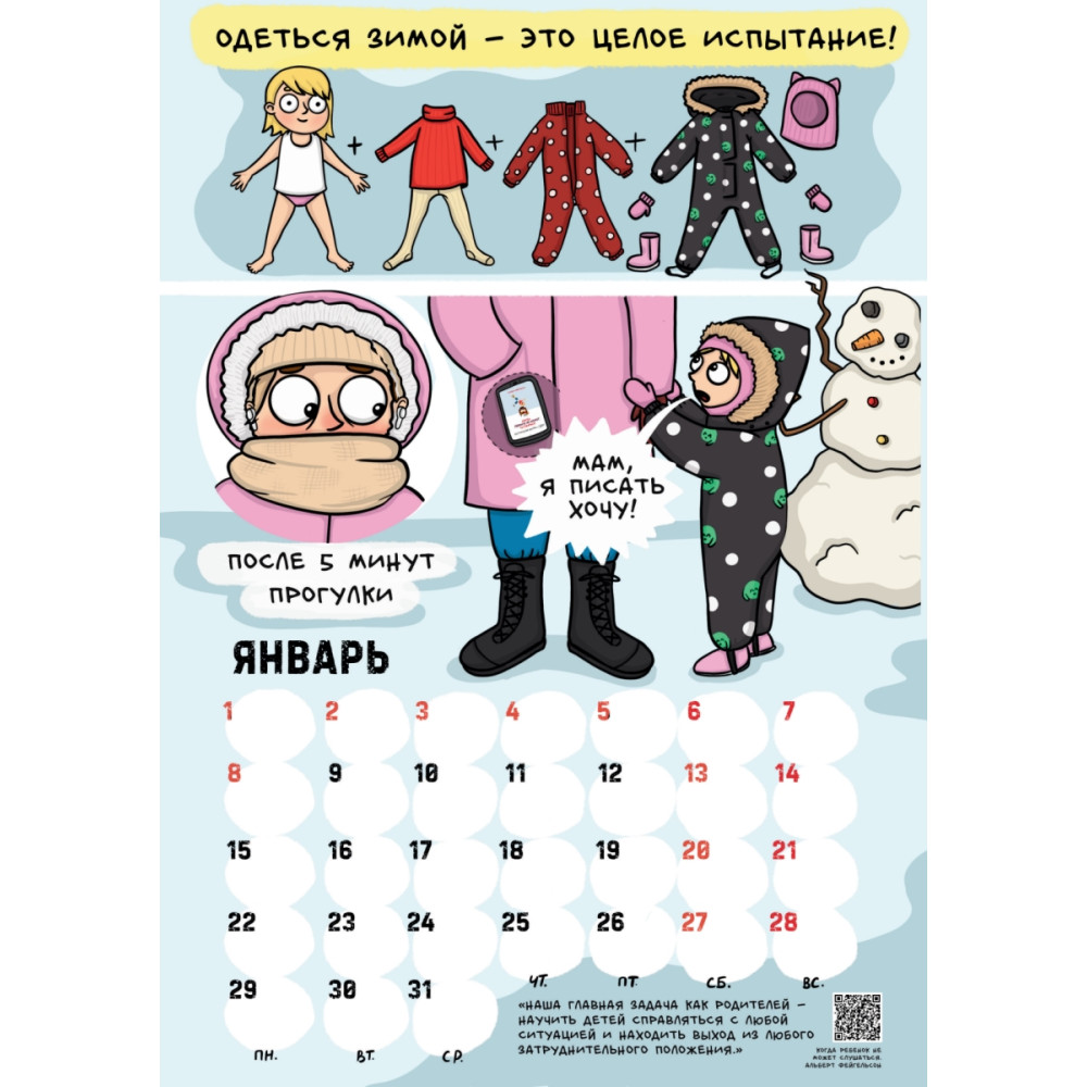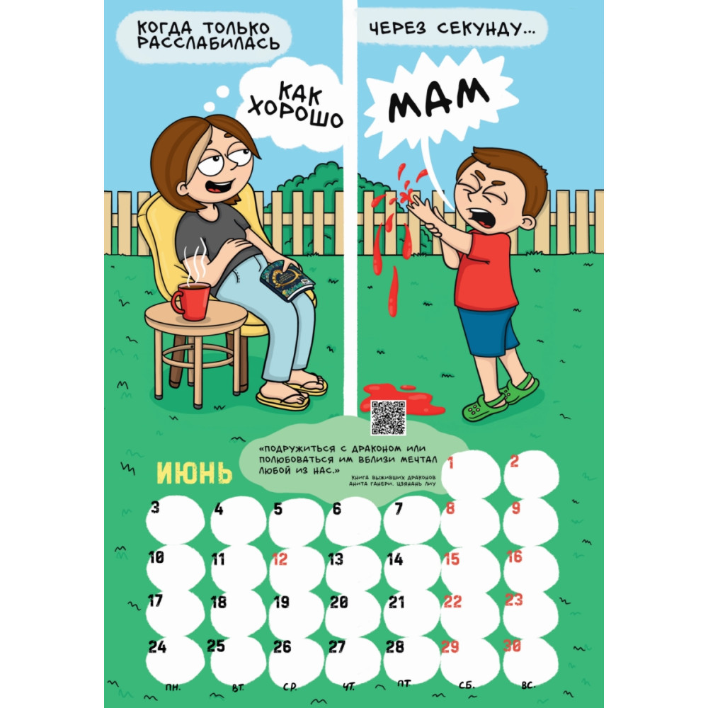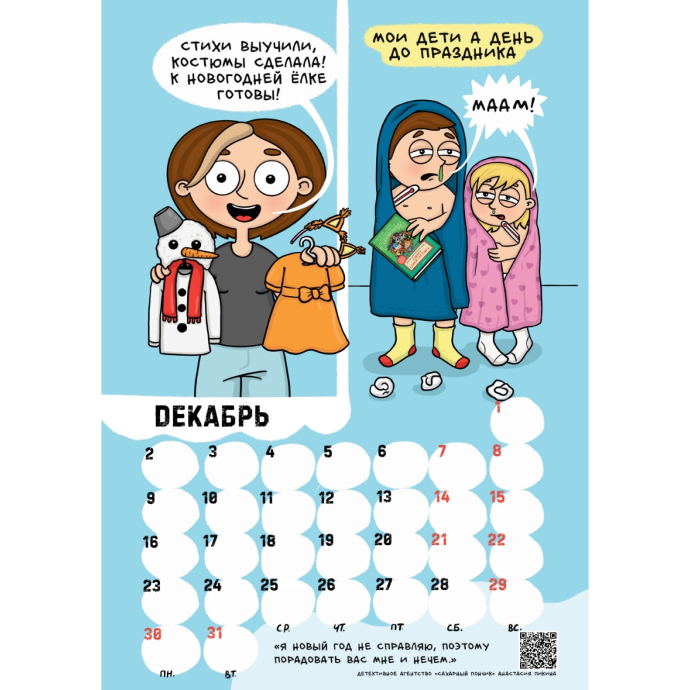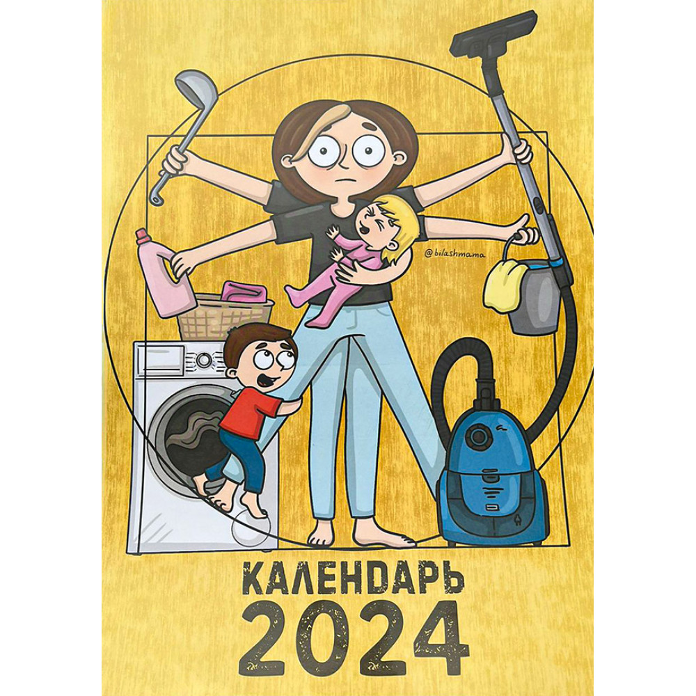 Красочный перекидной календарь расскажет о буднях неунывающей мамы. На каждой странице - весёлая комикс-история, в которой каждая мама узнает себя и своего ребёнка. Календарь выполнен на плотной прочной бумаге, напоминающей тонкий картон, которая не просвечивает, а с помощью удобного подвеса Вы сможете легко закрепить его на стене. Товар снабжён календарной сеткой с практичными белыми окошками, куда можно записывать все важные события. Оригинальные иллюстрации, удобный формат и отличное полиграфическое исполнение будут радовать Вас весь год. Календарь будет прекрасным дополнением к книге Алины Билаш "Декрет. Комиксы о жизни мамы двоих детей".