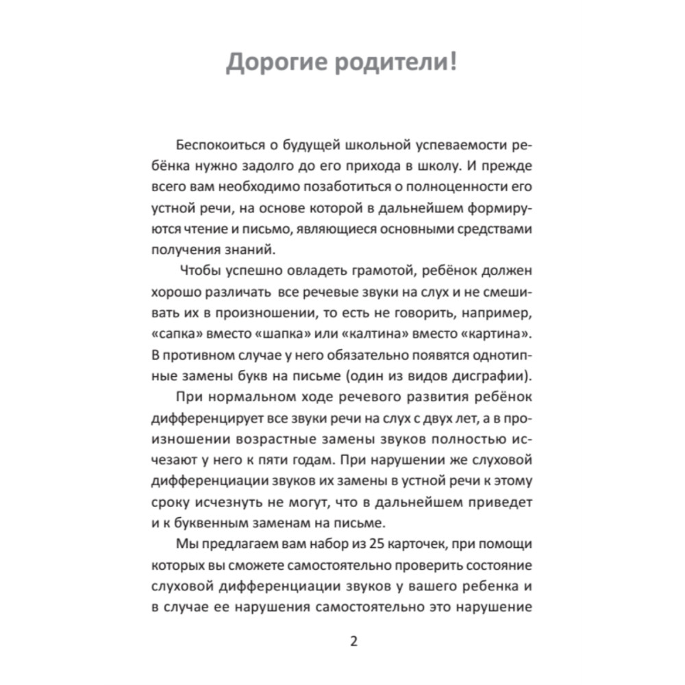Уникальное логопедическое пособие, позволяющее родителям вовремя выявить детские проблемы с восприятием звуков на слух и справиться с ними. Это предупреждает возможное развитие дисграфии и повышает успеваемость в школе. Заниматься по этой методике можно начиная с двух лет. Двадцать пять разноцветных карточек с симпатичными иллюстрациями превратят полезное и важное занятие в увлекательную игру. Пособие, подготовленное кандидатом педагогических наук, профессором кафедры логопедии ЛГУ им. А. С. Пушкина Л. Г. Парамоновой, адресовано не только родителям, но и логопедам, которые могут использовать его в своей практике.