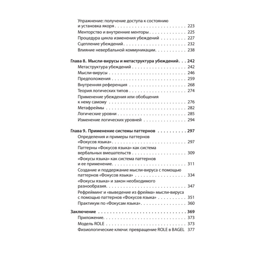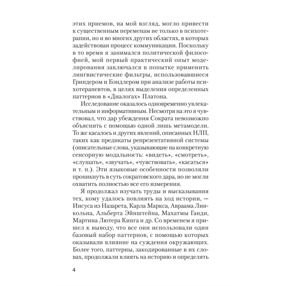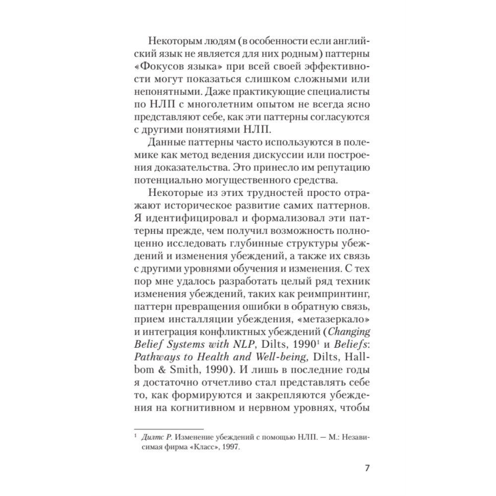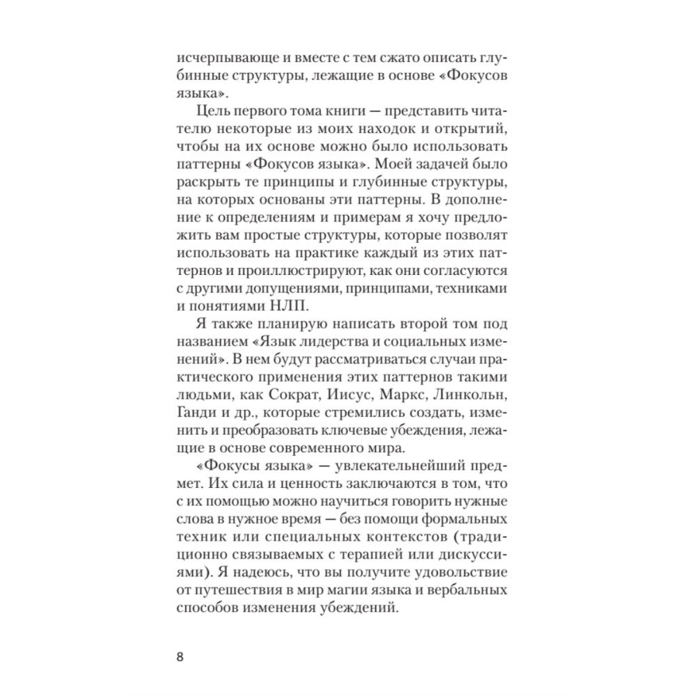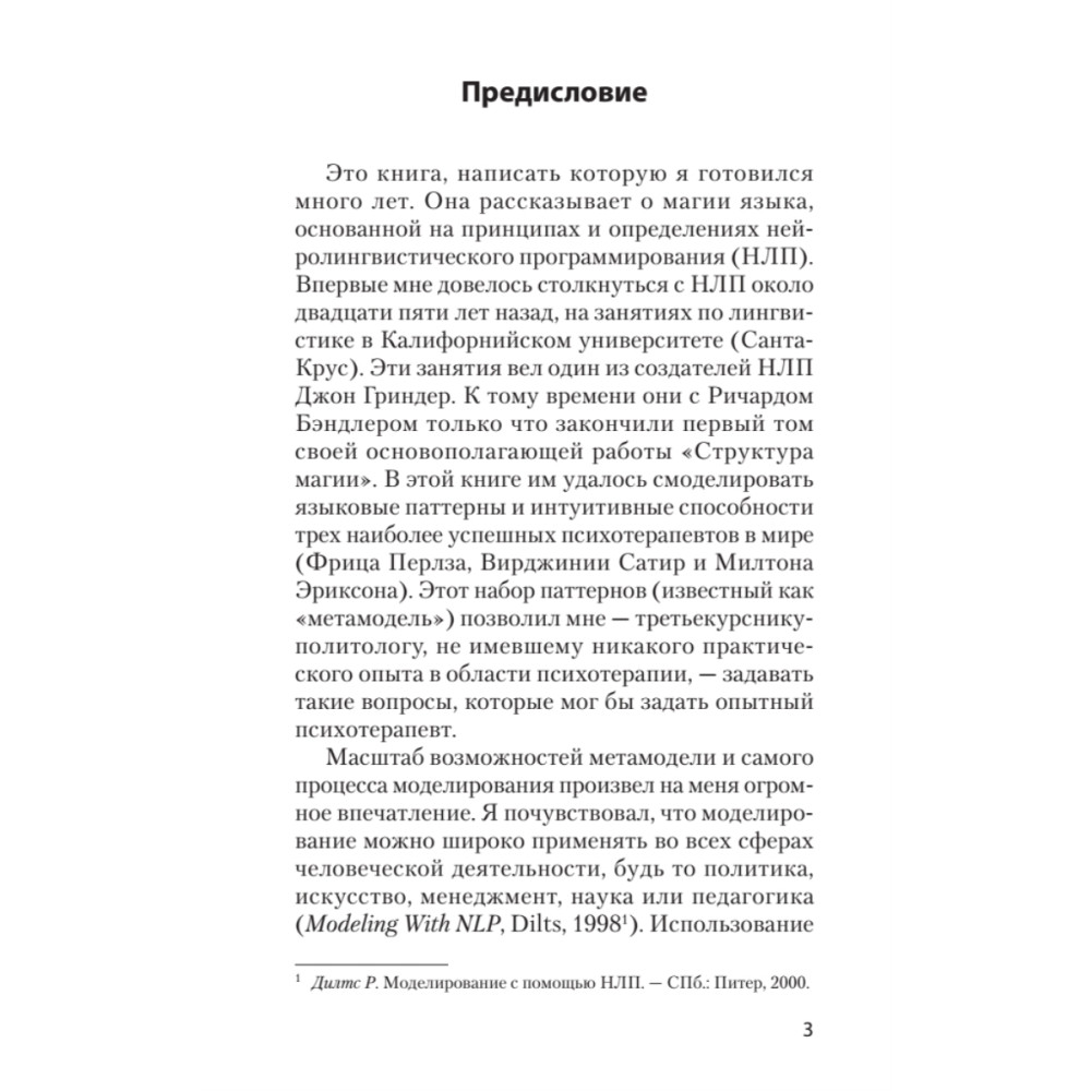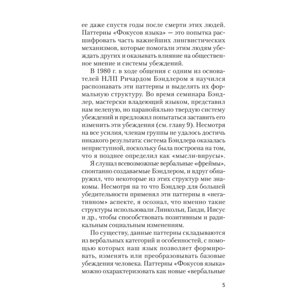 Если вы живете и работаете среди людей, вам постоянно приходится сталкиваться с необходимостью убедить окружающих в чем-то действительно важном. И в этом вам поможет популярнейшая книга Роберта Дилтса, гения нейро-лингвистического программирования. Вам просто не обойтись без «фокусов языка». Смысл в том, что определенные речевые шаблоны (паттерны) способны преобразовывать убеждения и восприятие какой-либо ситуации, кардинально изменяя наши реакции на нее. За три десятилетия, прошедшие с момента их открытия, «фокусы языка» заслужили право называться самым эффективным методом влияния и лучшим средством изменения убеждений в процессе общения. Откройте для себя новые возможности. С помощью «фокусов языка» вы научитесь главному — говорить нужные слова в нужное время.