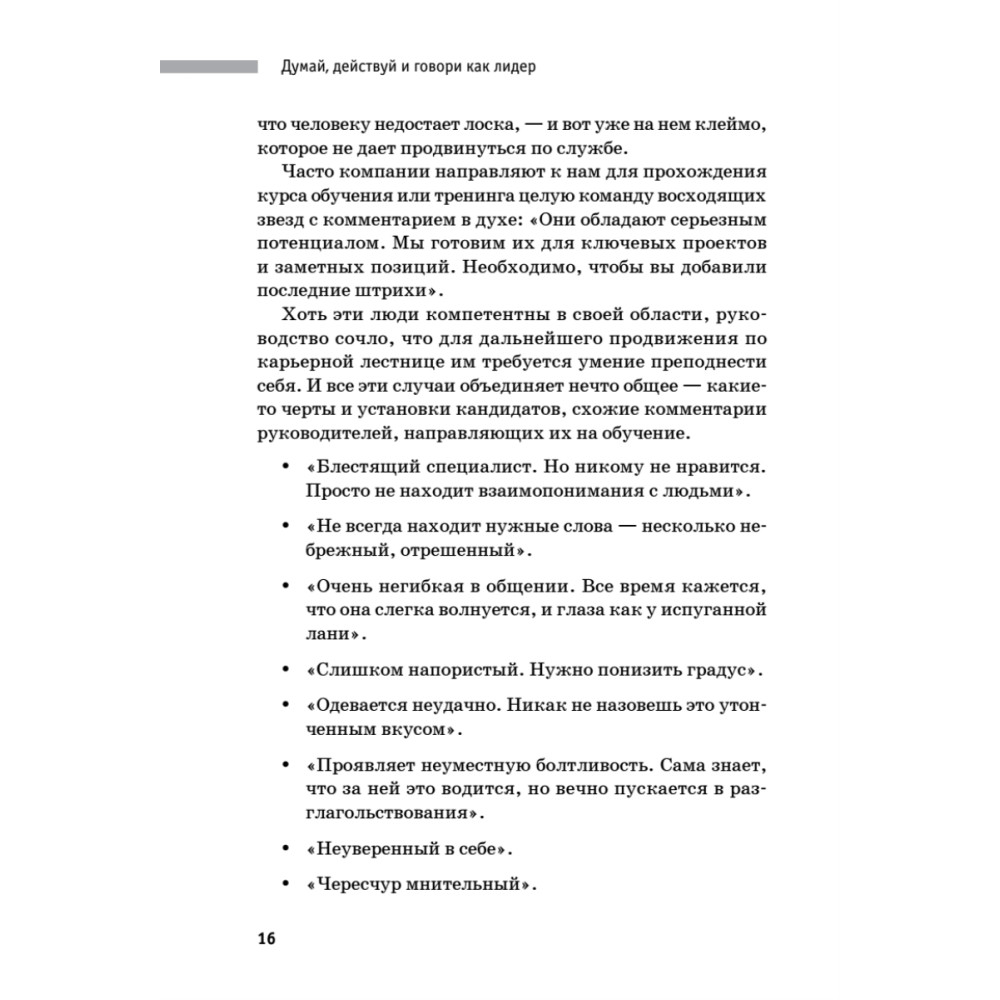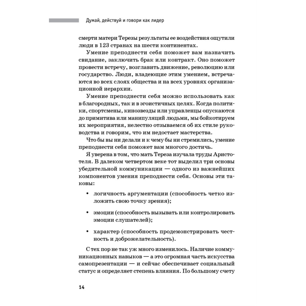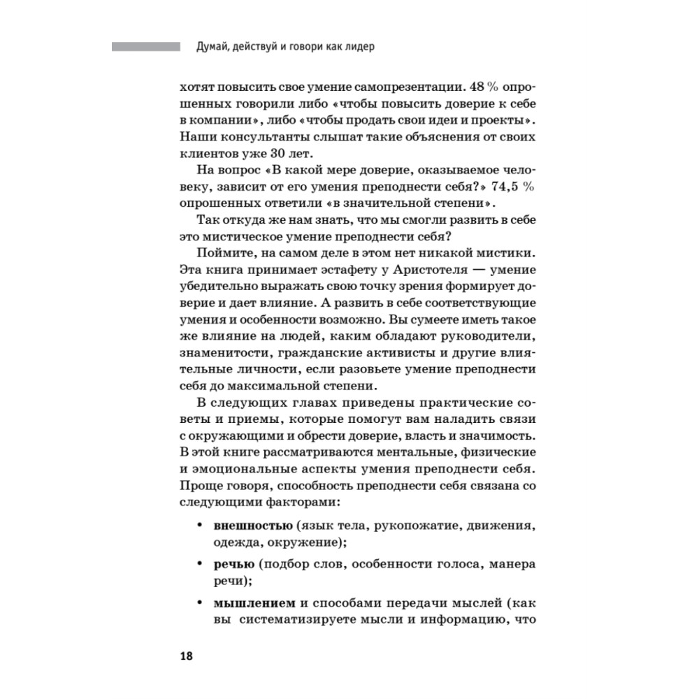 Поведение лидера трудно описать, но вы всегда его узнаете. Лидер притягивает внимание, его невозможно не слушать, на него нельзя не смотреть, его вопрос не получится оставить без ответа. За таким человеком люди готовы идти, и это работает везде – в делах, в личном общении, в политике. Вы думаете, человек рождается, обладая такими способностями? На самом деле, вы можете научиться вести себя как лидер и производить на людей соответствующее впечатление. И для этого не нужно никакой особенной харизмы или выдающихся способностей, все дело в манерах поведения. В этой книге признанный эксперт риторики и консультант Дайанна Бухер рассказывает о десятках небольших, но очень значительных трюков, которые помогут вам выработать стиль поведения лидера. Вы научитесь контролировать свой голос, язык тела, взгляд, движения, запомните и будете употреблять фразы, располагающие к доверию, запоминающиеся и утверждающие ваш особый статус. Вы привыкнете думать на несколько шагов вперед, излагать свои мысли так, чтобы люди принимали вашу точку зрения, внушать уважение и привлекать внимание. Научитесь вести себя как лидер, станьте лидером!