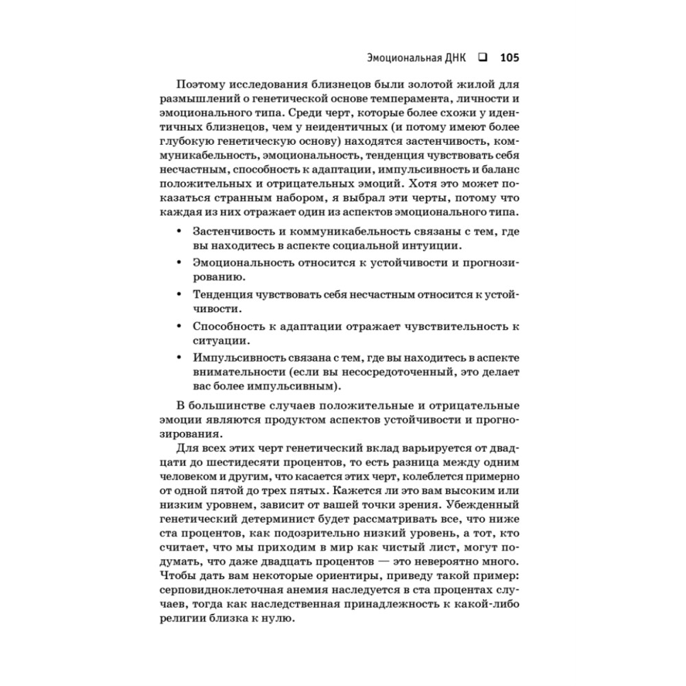 Эта книга стала признанным мировым бестселлером. Ричард Дэвидсон – один из ведущих современных исследователей мозга, и его подход к психотипам и человеческим эмоциям действительно инновационный. Каждая личность представляет собой уникальную композицию из шести основных эмоциональных «стилей» в особых пропорциях, поэтому психотип человека так же индивидуален, как и его отпечатки пальцев. Каждый эмоциональный стиль связан с определенными химическими процессами в головном мозге, и благодаря этому факту мы можем управлять своим мозгом и развивать его, контролируя тот или иной эмоциональный стиль. С помощью этой методики можно не только развиваться как личность, но и лечить депрессию, аутизм и другие психические недуги. В книге Дэвидсон и Бегли подробно и доступно описывают свой подход, так что вы сможете использовать его самостоятельно.