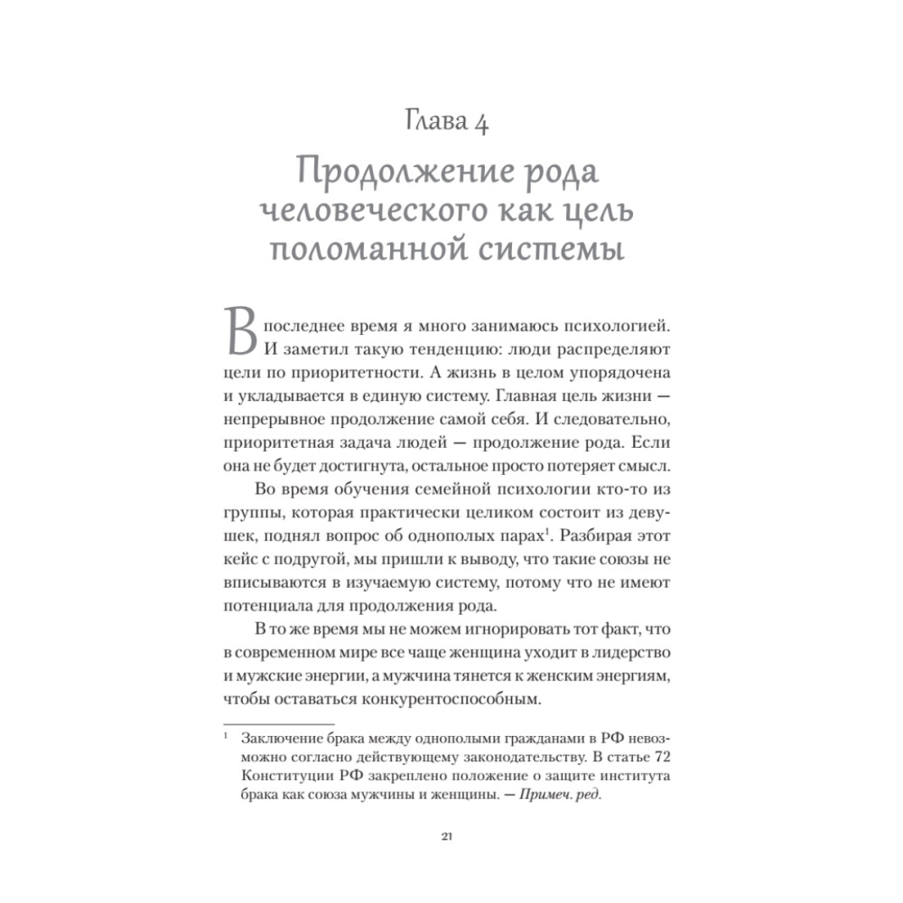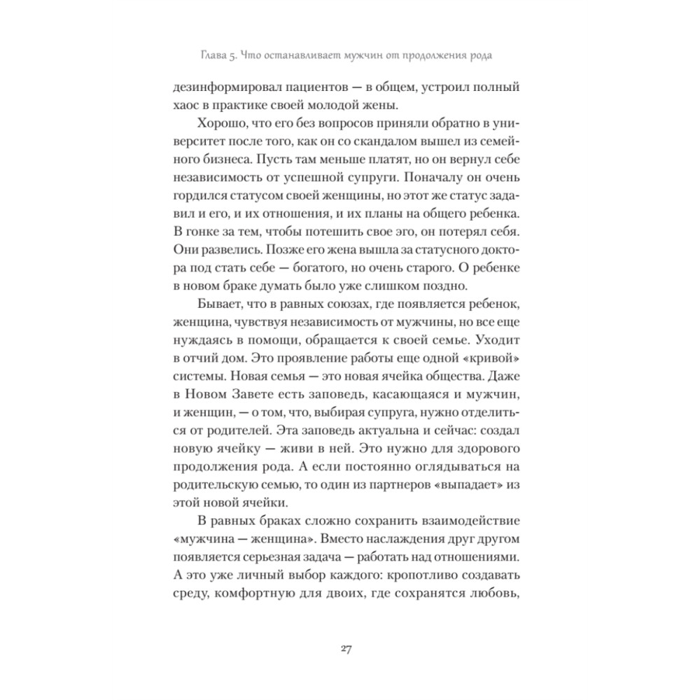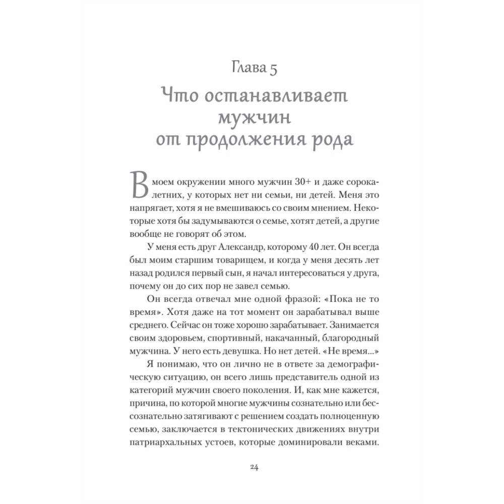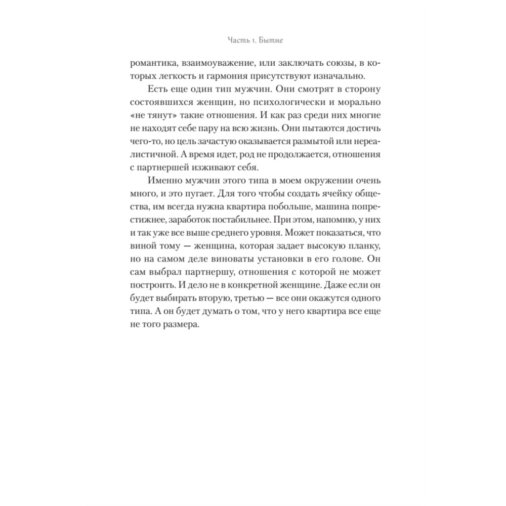 Книга о тонкостях взаимоотношений между мужчиной и женщиной в эпоху перемен. В мире, где традиционные роли больше не работают, а границы ответственности в паре всё больше размываются, автор исследует, как можно построить настоящие партнёрские отношения. Сквозь призму системной психологии раскрываются самые острые вопросы современности: почему всё труднее выстраивать крепкие и долгосрочные союзы, откуда берутся раздражение и усталость в отношениях, и как найти внутренний ресурс для любви — к партнёру, детям и самому себе.