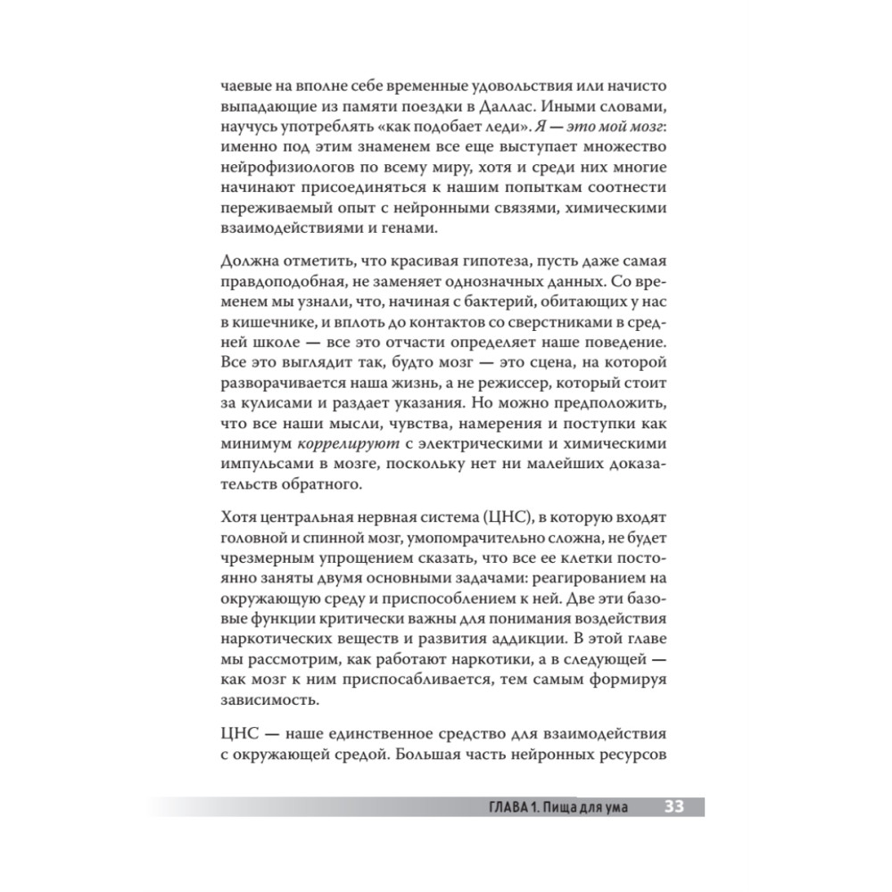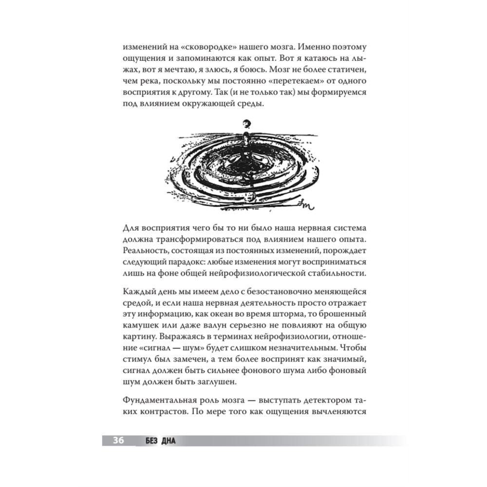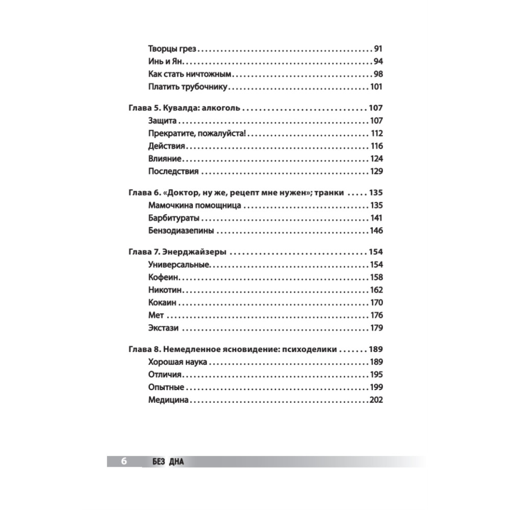 Еще одна рюмка. Одна затяжка, один эклер, одна чашка кофе... Мы уверены, что сможем остановиться в любой момент, просто нужно включить силу воли. Но даже если удается затормозить на какое-то время, после перерыва зависимость только набирает обороты. К этому печальному выводу рано или поздно приходят все зависимые — бесплатный сыр только в мышеловке. Из книги вы узнаете: чем отличается «зависимый» мозг от обычного, какие изменения мозга и поведения происходят в результате регулярного употребления психоактивных веществ и какие скрытые силы личности способны победить зависимость. В этой искренней и яркой книге Джудит Гризел, бывшая зависимая и известный нейробиолог, объясняет, какую роль психоактивные вещества играют в нашей жизни, и показывает принципиально новый способ, как нам справиться со злоупотреблением. Книга «Без дна» очень необычная. Объяснения биохимических и физиологических причин наркотических зависимостей переплетены с личным опытом автора: бывшей наркоманки, сумевшей выбраться, получить докторскую степень по поведенческой нейрофизиологии и стать экспертом в области нейробиологии, химии и биогенетическим механизмам аддикций. Эту книгу интересно читать, Джудит Гризел с одной стороны объясняет работу мозга или причину приятных ощущений, а с другой сразу дает «практический пример», поясняющий, что это все значит для человека, уже имеющего пристрастие к каким-то веществам. Много метафор, много сравнений (например, чем действие алкоголя отличается от транквилизаторов и почему?) и главное, неприкрытая правда о том, что на самом деле стоит за кратковременным спокойствием или эйфорией, вызванными новой «дозой». История, которую следует прочитать, чтобы избавиться даже от тени мысли, будто бы существует такой стимулятор, который не принесет организму никакого вреда: удовольствие не бывает бесплатным Галина Вирясова, кандидат химических наук по специальностям биоорганическая химия и молекулярная биология, выпускающий редактор блога доказательной медицины «Медфронт» Наседкин: «Удивительная история ученого, которая не только смогла осознать, глубоко проанализировать и в итоге победить пагубную зависимость. Самое главное — она сумела извлечь из всего этого пользу и поделиться накопленными знаниями с другими. Это поистине достойно восхищения»