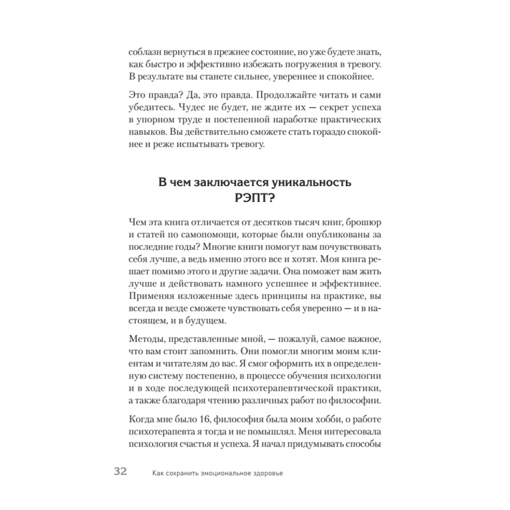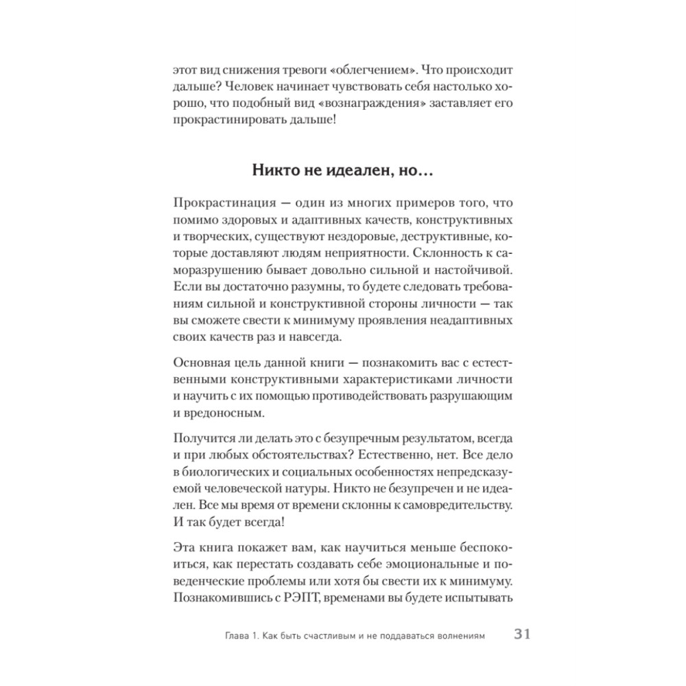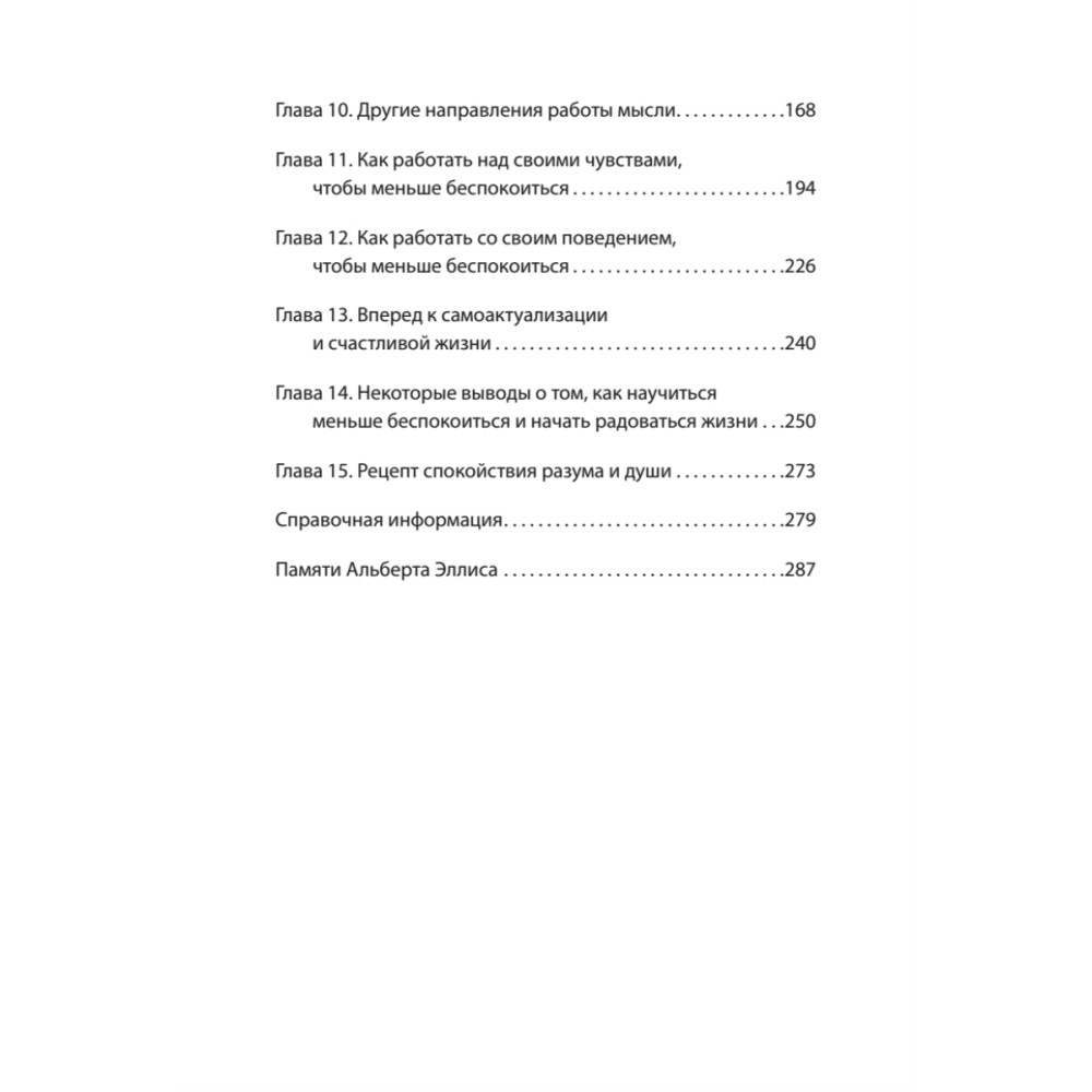 Как часто вы поддаетесь тревоге, думая, что все идет из рук вон плохо? Критикуете себя жестокими словами, стремитесь к безупречности и впадаете в прокрастинацию? «Если вы расстроены, вы склонны к саморазрушению», — утверждает Альберт Эллис. Психотерапевт с мировым именем и автор более 75 книг по психотерапии предлагает практические методы работы с разрушительными эмоциями. Здесь вы найдете упражнения по борьбе со стыдом, чувством вины, модели конструктивного отношения к жизненным задачам и анкету самопомощи. Прочитав книгу, вы научитесь останавливать нарастающее беспокойство, перестанете обижаться на людей, начнете относиться к себе с пониманием, заботой и любовью.