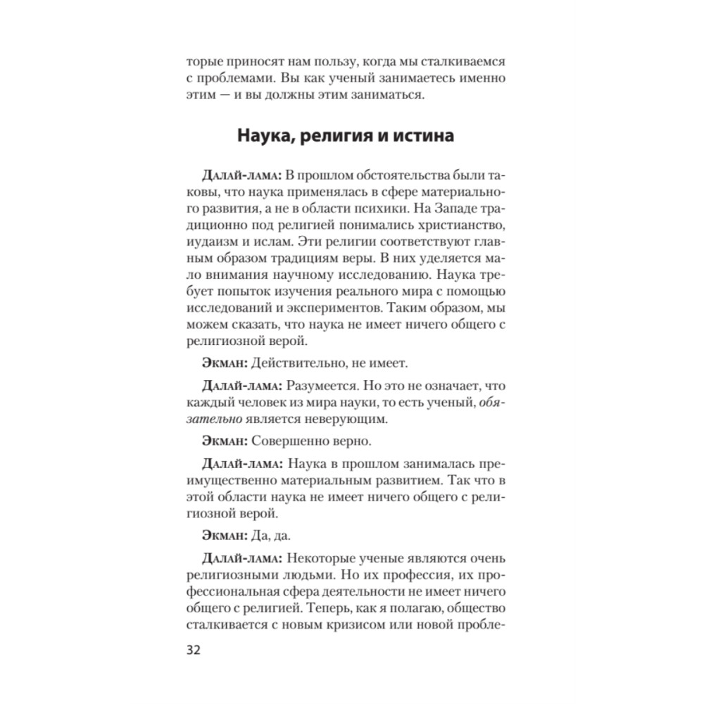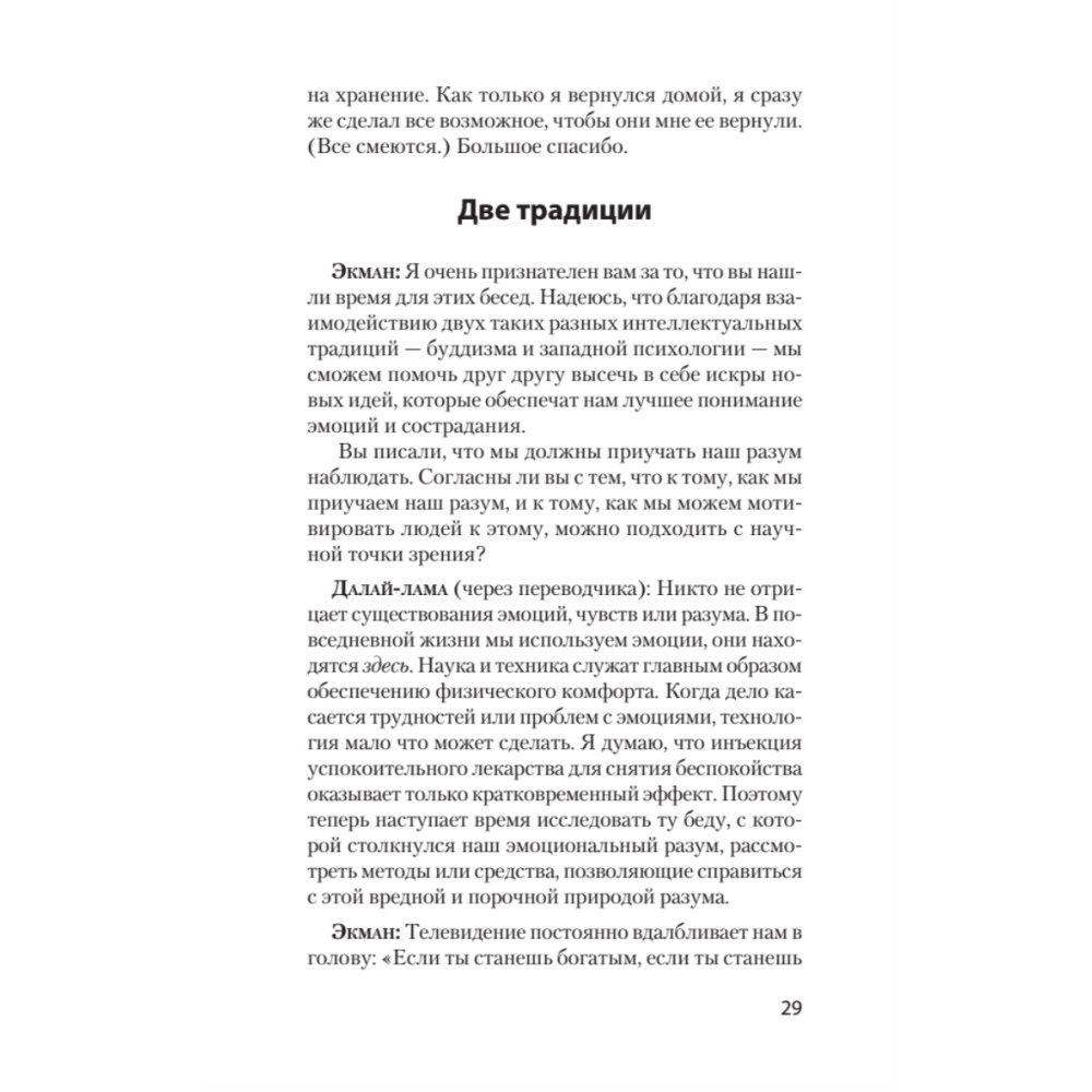 В мире не так мало умных людей. Но по-настоящему мудрых — единицы. Их мысли и слова представляют особую, ни с чем не сравнимую ценность для всех нас. Это книга-разговор. Диалог замечательных представителей Востока и Запада — Его Святейшества Далай-ламы и выдающегося американского психолога Пола Экмана. Правда и ложь, деструктивные эмоции, трудные люди, разум и чувства, искусство счастья и финансовый успех, прощение и ответственность, исцеляющий гнев, природа сочувствия и применение медитации — круг обсуждаемых тем максимально широк. На каждый вопрос дан интересный и полезный ответ. Прочтите эту книгу, чтобы понять то, что не понимали прежде. Только общение с наимудрейшими обогащает!