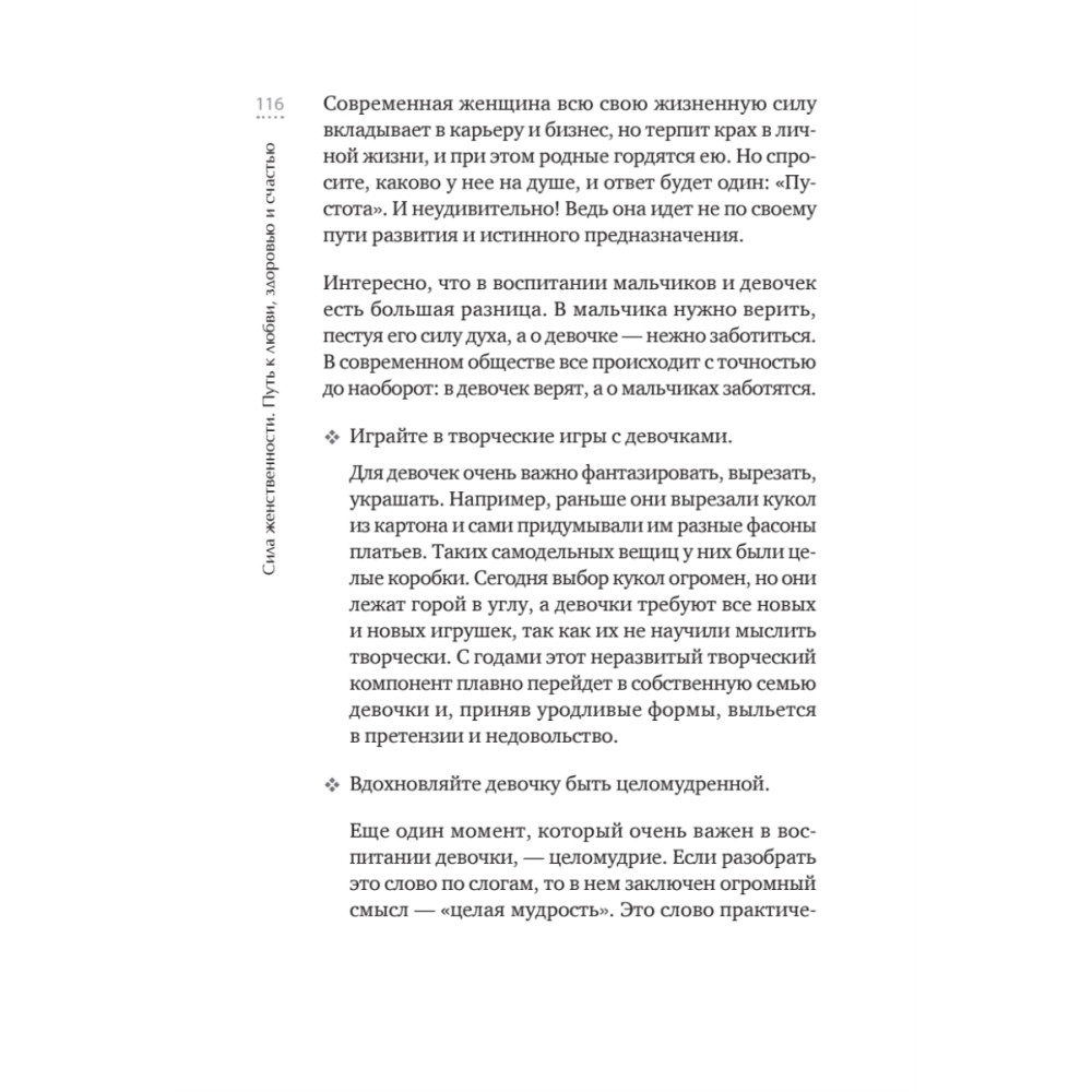 Это книга о счастье женщины. Некоторые ошибочно могут подумать, что счастье женщины в красивых платьях, в деньгах или в количестве детей. Но это не так. Женщина счастлива, когда имеет внутреннюю гармонию, хорошие отношения с мужем и детьми, а также занимается интересной работой. Все мы в определенный момент очень четко осознаем, что пришла пора что-то менять. Обычно наступает этот критический момент не самым приятным образом: для кого-то это развод, для кого-то – потеря сил от большого количества работы, кто-то не может много лет выйти замуж, кто-то хочет помочь мужу бросить пить... Суть одна, мы принимаем решение учиться жить правильно. На первом этапе, женщине важно стать внутренне сильной. Научиться успокаивать мысли, достичь внутренней стабильности. Когда появятся силы жить дальше, надо начать заботиться о других. Когда женщина заботится обо всех и развивает отношения с людьми, она наполняется красотой. На третьем этапе важно пересмотреть свои отношения с мужчиной. На этом этапе есть силы строить отношения по-новому, приходит понимание, как это делать. Когда у женщины появляются крепкие отношения в семье, это дает уверенность для реализации в социальной жизни. В книге подробно разбирается, как женщине правильно ставить цели, как успокоить ум, и все успеть. Показывается, как можно увеличить женскую энергию и получить силы от общения с людьми. Вы узнаете, как научиться использовать женскую энергию для работы, как общаться с сотрудниками, дружить, помогать другим. Авторы книги Олег Геннадиевич Торсунов и Татьяна Полякова глубоко раскрывают эти темы