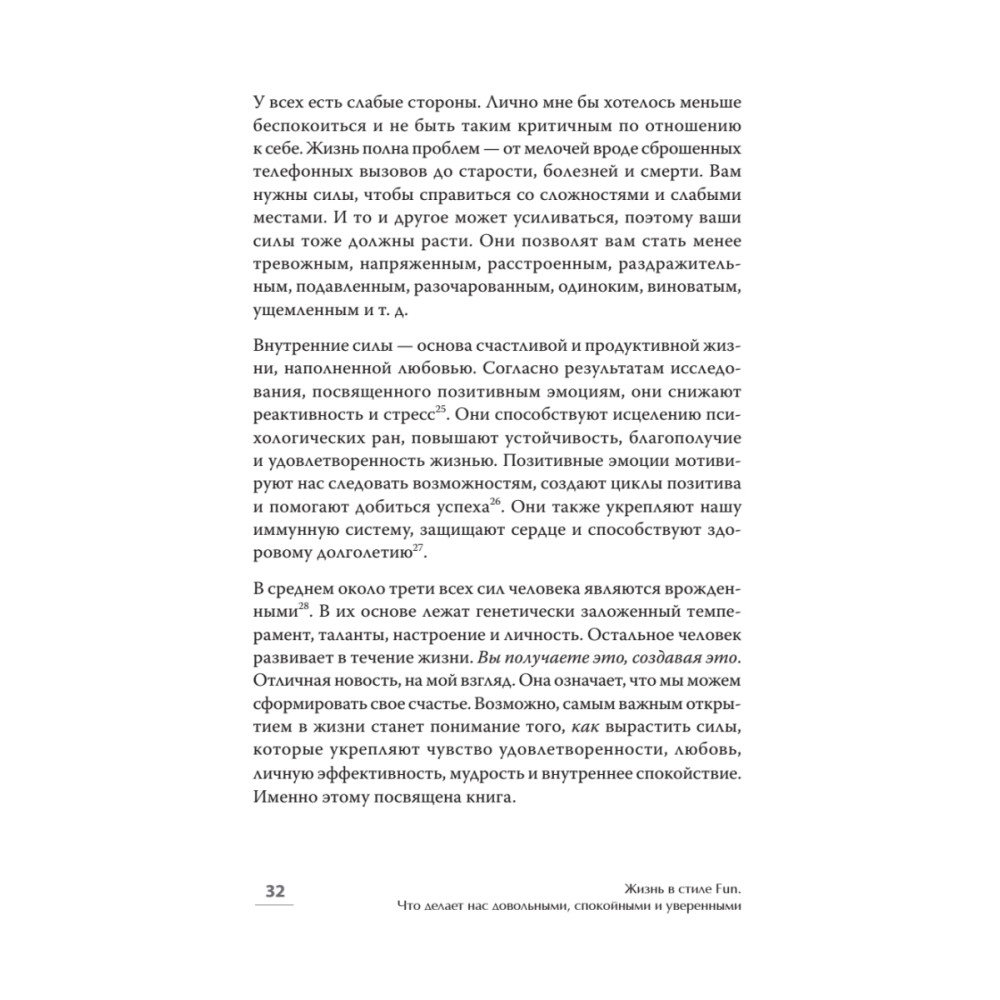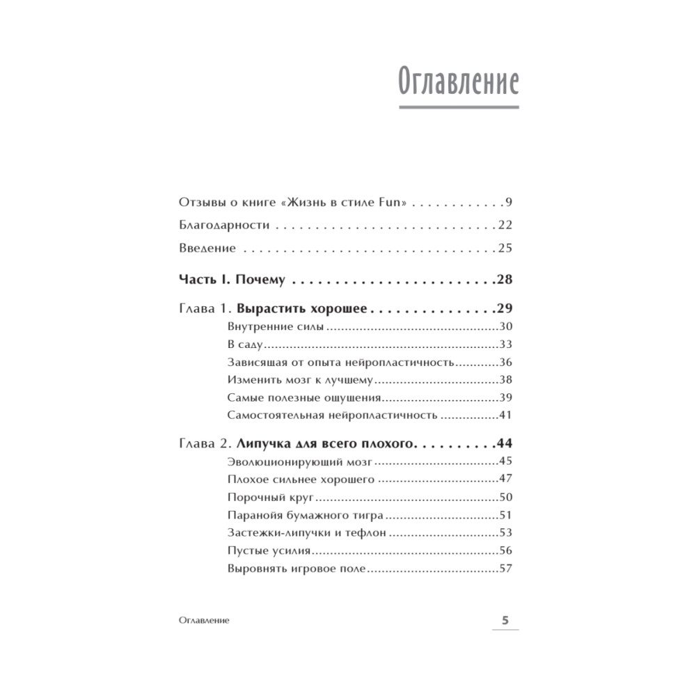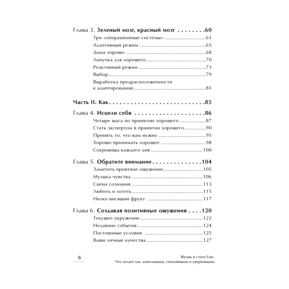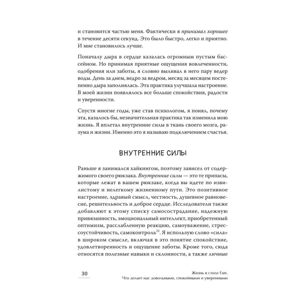 «Жизнь в стиле Fun» поразительна. Она предлагает новое видение того факта, что наш мозг предпочитает сначала реагировать на все негативно, и дает конкретные рекомендации по переучиванию его на позитивные реакции. «Книга посвящена одному простому явлению: скрытой силе повседневных позитивных ощущений. Силе, способной перевоспитать мозг и таким образом изменить жизнь к лучшему. Я покажу вам, как превратить активное переживание приятных мгновений в вашу сильную сторону, достичь уверенности, свободы, комфорта, самоуважения и начать заботиться о себе. Речь не о тех моментах, когда вы чувствуете себя на миллион долларов. Я говорю о простых радостях жизни: ощущение уюта от любимого свитера, удовольствие от чашки кофе, теплота общения с другом, удовлетворение от выполненного задания или любовь вашего спутника. Вы научитесь практике принятия хорошего. Если посвящать ей по десять секунд несколько раз в день, это укрепит состояние радости, спокойствия и внутренней силы. Наука, лежащая в основе этой практики, не относится к позитивному мышлению. И это не очередная программа по созданию позитивных чувств. То и другое не приносит пользы вашему мозгу. В нашей книге речь пойдет о трансформации мимолетного опыта в устойчивые положительные изменения вашей нейронной сети». Рик Хансон «Жизнь в стиле Fun» учит нас избавляться от привычки видеть в первую очередь негатив, которая появилась в ходе эволюции. Она помогает наслаждаться позитивными вещами. Сделайте себе и своим близким лучший подарок: подарите эффективную стратегию по усилению радости с помощью практик, связанных с мозгом, одновременно простых и приятных.
