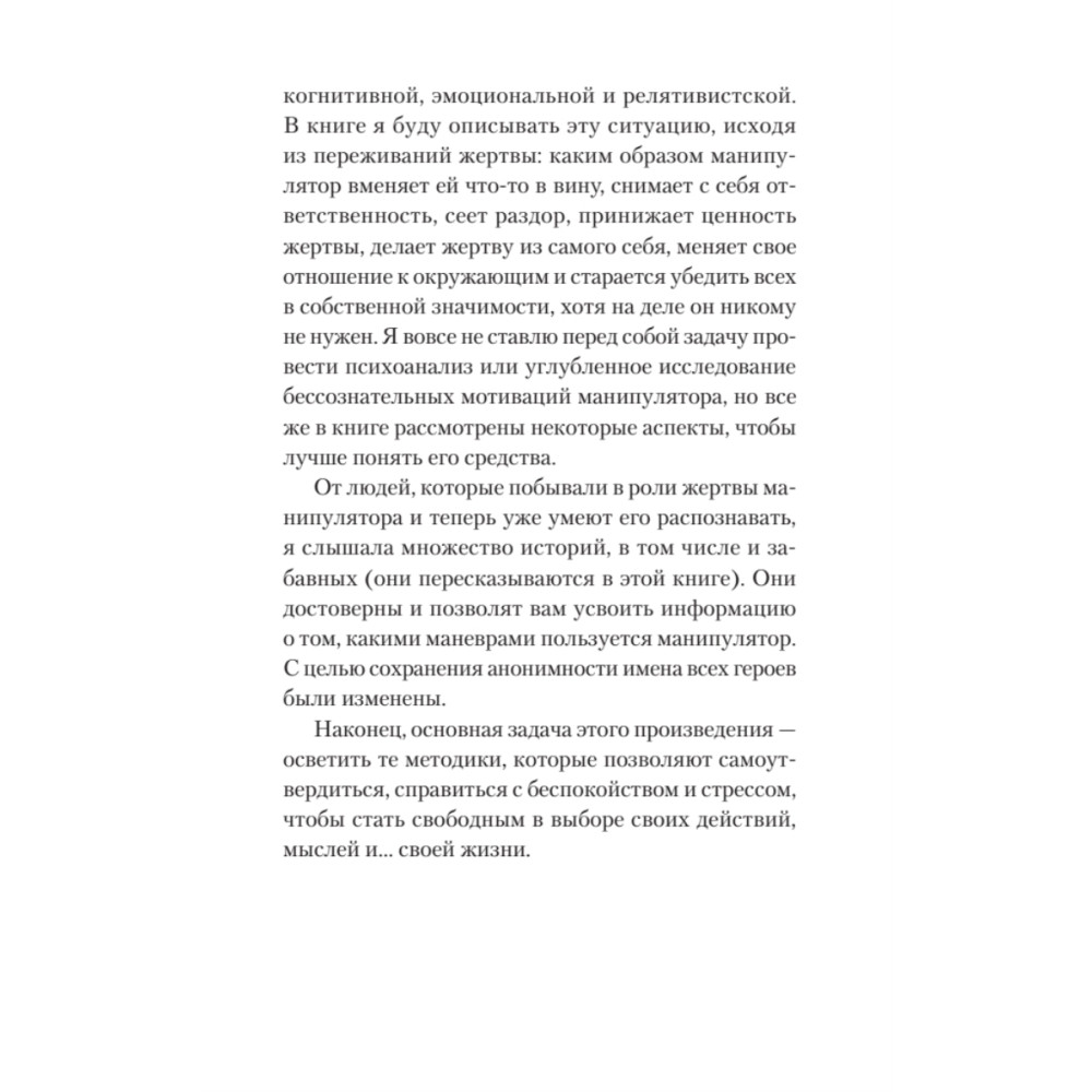Кто из нас не испытывал на себе психологических манипуляций со стороны родственников, друзей, коллег и просто знакомых? Отвратительное ощущение, что тебя вынуждают делать то, что ты делать совершенно не хочешь, обманным путем втягивают в очередную сомнительную историю, знакомо практически каждому. Как правило, мы чувствуем, что нужно сказать «нет», но сдаемся под напором эмоций, именно на это и рассчитывают манипуляторы. Как противостоять такому эмоциональному террору? Как распознать талантливо маскирующегося манипулятора? Советы дает известный французский психолог Изабель Назаре-Ага. Воспользуйтесь рекомендациями профессионала, и вы всегда будете принимать решения, руководствуясь собственными суждениями и разумными доводами, а не хитрыми уловками манипуляторов.