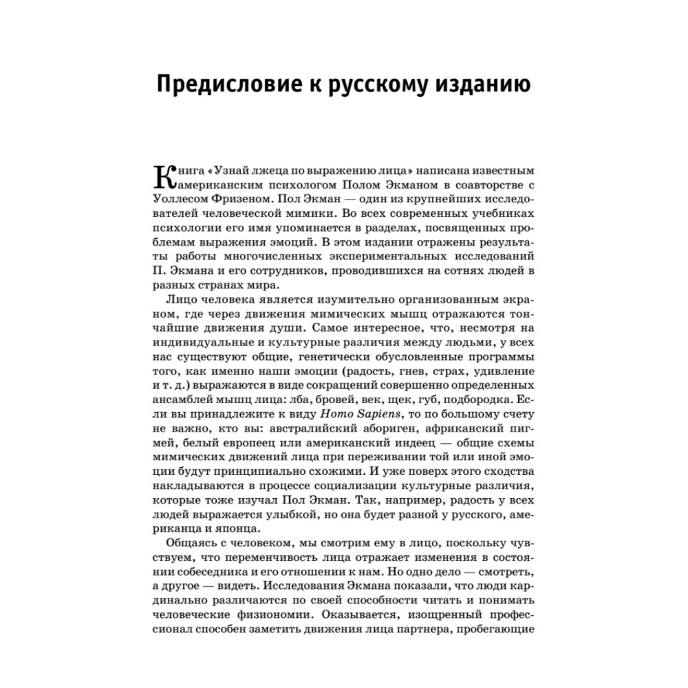 Перед вами новая книга Пола Экмана, которую вполне можно назвать вторым томом нашумевшего бестселлера «Психология лжи». Это книга-продолжение, книга-тренажер, книга-расшифровка. Вы заметите, если кто-то притворяется удивленным? А если кто-то испуган, но хочет выглядеть рассерженным, вам под силу это разглядеть? Насыщенная огромным количеством тщательно отобранных фотографий и специальных упражнений, эта книга позволит вам безошибочно распознавать ложь, моментально читая по лицам эмоции: как подлинные, так и «наигранные». Радость, удивление, страх, гнев, печаль, отвращение — ничто не ускользнет от вашего внимательного взгляда. Совершенствуйте свои навыки, чтобы защититься от обмана на работе и дома. Мастерство Пола Экмана сослужит вам хорошую службу!