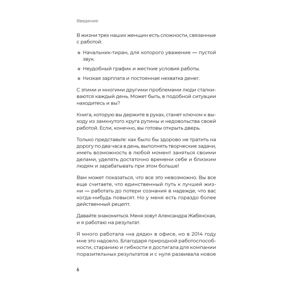 Желание жить лучше – это то, что объединяет сотни тысяч людей по всей стране. От Калининграда до Петропавловска-Камчатского, от Балтийска до Сочи огромное число женщин ищут подходящую работу. Им важно получать достойные деньги, но пахать в две смены без выходных и не видеть семью они не согласны. Книга поможет найти идеальную работу и реализовать свои мечты. Александра Жабянская, популярный блогер, онлайн-предприниматель, специалист по удаленной работе, рассказывает, как устроено онлайн-пространство и откуда там появляются деньги. Вы сможете разобраться, что выбрать: удаленную работу, фриланс или бизнес. Книга мотивирует стремиться к лучшей жизни и большему заработку, чтобы достойно обеспечивать себя и своих близких, дает конкретные рекомендации и упражнения, благодаря которым читатель получит ощутимый результат быстрее и легче. Издание адресовано всем, кто интересуется темой удаленной работы, онлайн-заработка или переходом из офлайна в онлайн.