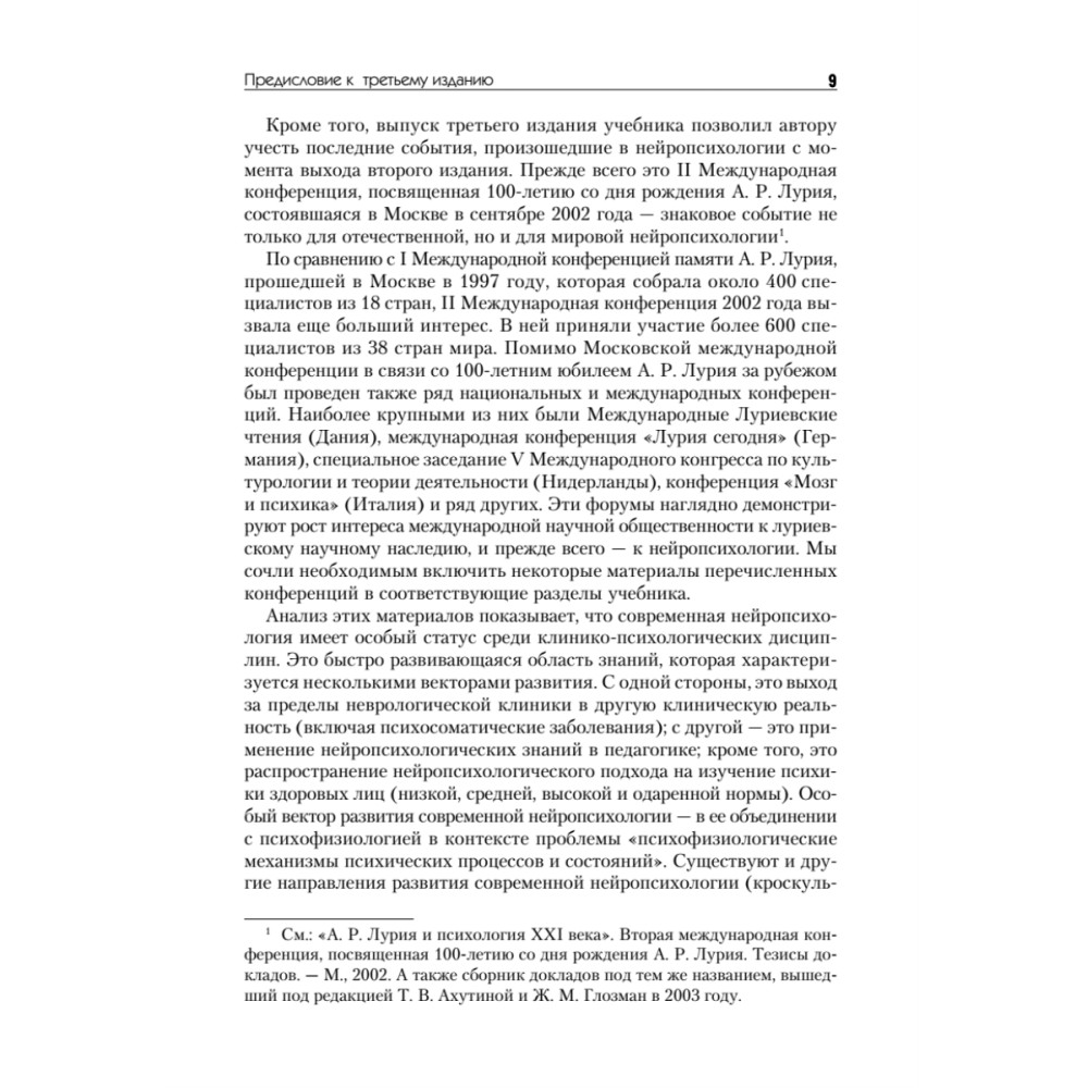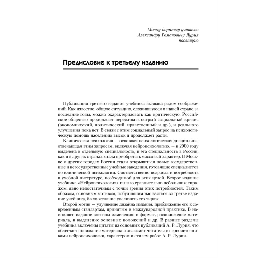 В четвертом, исправленном, издании учебника излагаются основы нейропсихологии — одной из нейронаук, возникшей на стыке психологии и медицины (неврологии, нейрохирургии) и созданной в нашей стране работами А. Р. Лурия и его учеников. В настоящее издание включено более подробное рассмотрение основных тенденций развития современной нейропсихологии, анализ ее многовалентности, широкого спектра теоретических и практических задач, что необходимо для подготовки современных специалистов в области клинической психологии. Вы можете скачать хрестоматию по нейропсихологии под ред. Хомской по ссылке или QR-коду на 4й стороне обложки.