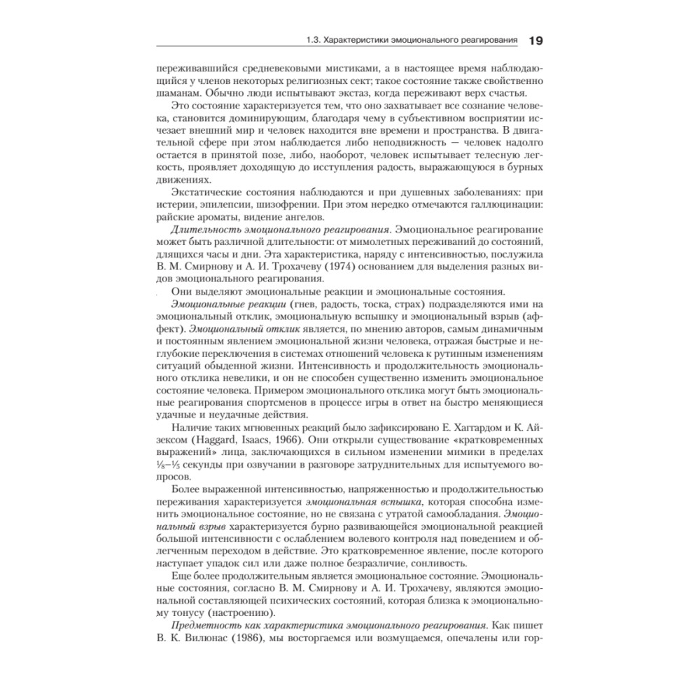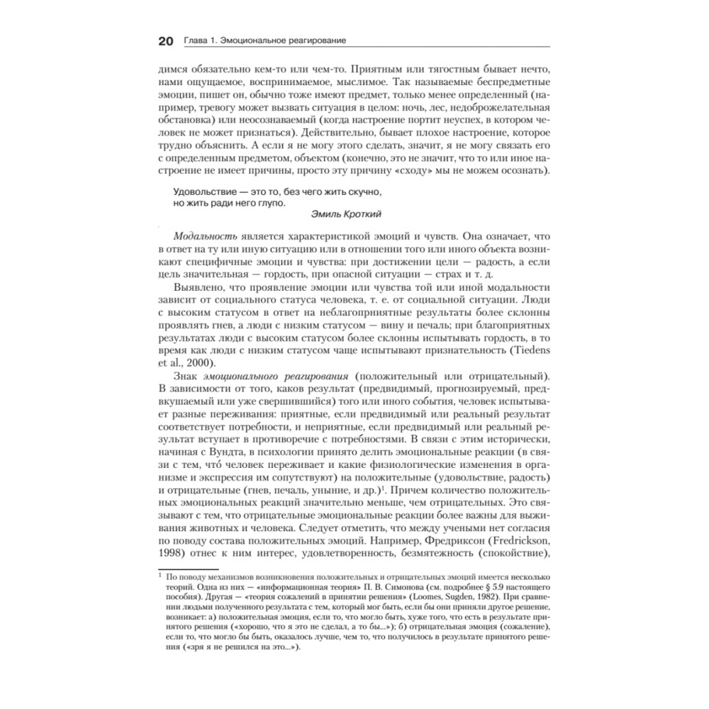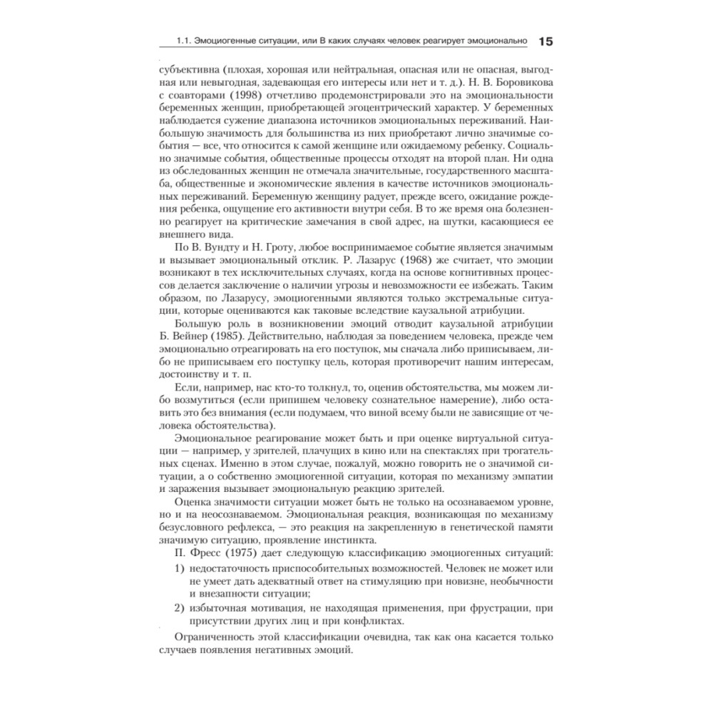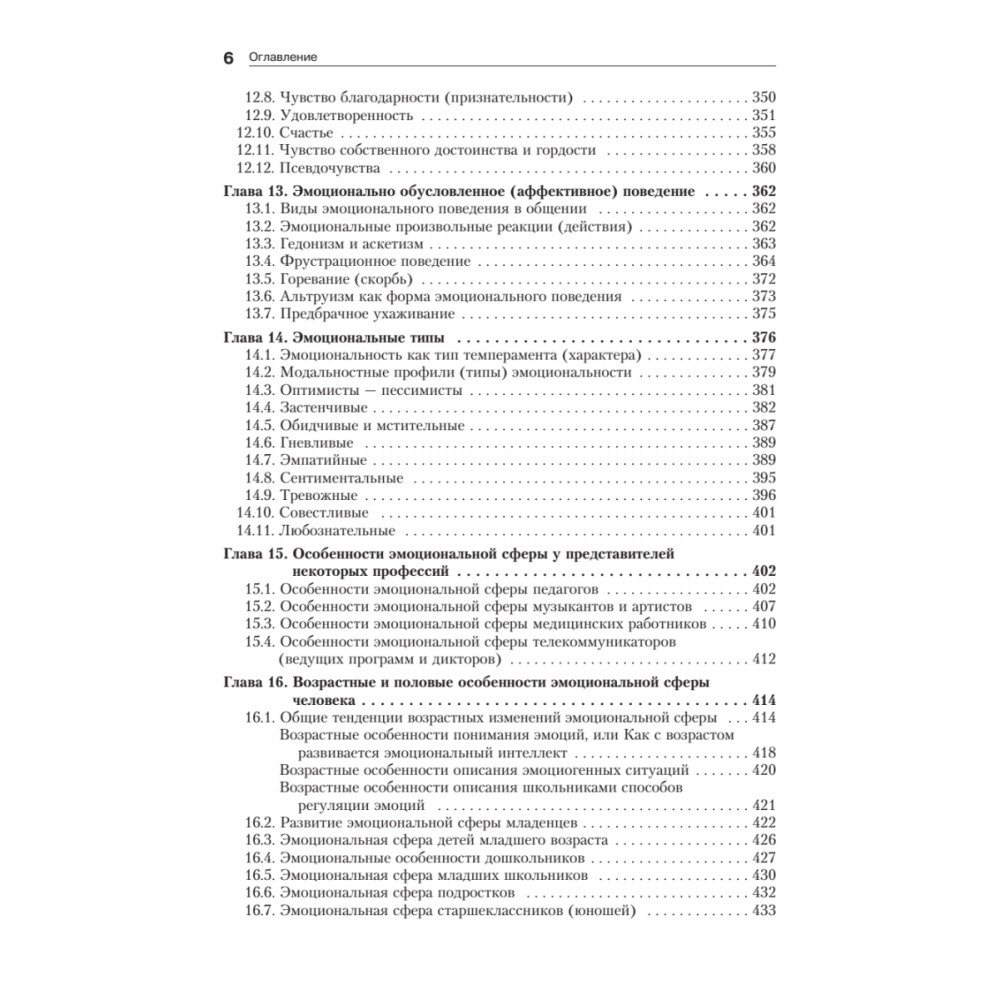 Второе издание учебного пособия (предыдущее вышло в 2001 г.) переработано и дополнено. В книге изложены теоретические и методологические вопросы изучения эмоций и чувств человека. Основное внимание уделено анализу структуры эмоциональной сферы и ее составляющих: эмоционального тона, эмоций, эмоциональных свойств личности, чувств, эмоциональных типов. Рассмотрены теории возникновения эмоций, их функции и роль в жизни человека, изменения эмоциональной сферы в онтогенезе и при патологии. В пособии приведены многочисленные методики изучения различных компонентов эмоциональной сферы человека, которые могут с успехом использоваться как в научных, так и практических целях. Научное содержание почти всех глав второго издания расширено с учетом отечественных и зарубежных исследований, опубликованных за последние 15 лет. Учебное пособие предназначено для психологов, психофизиологов, педагогов, а также для студентов и аспирантов психологических и педагогических факультетов и вузов.