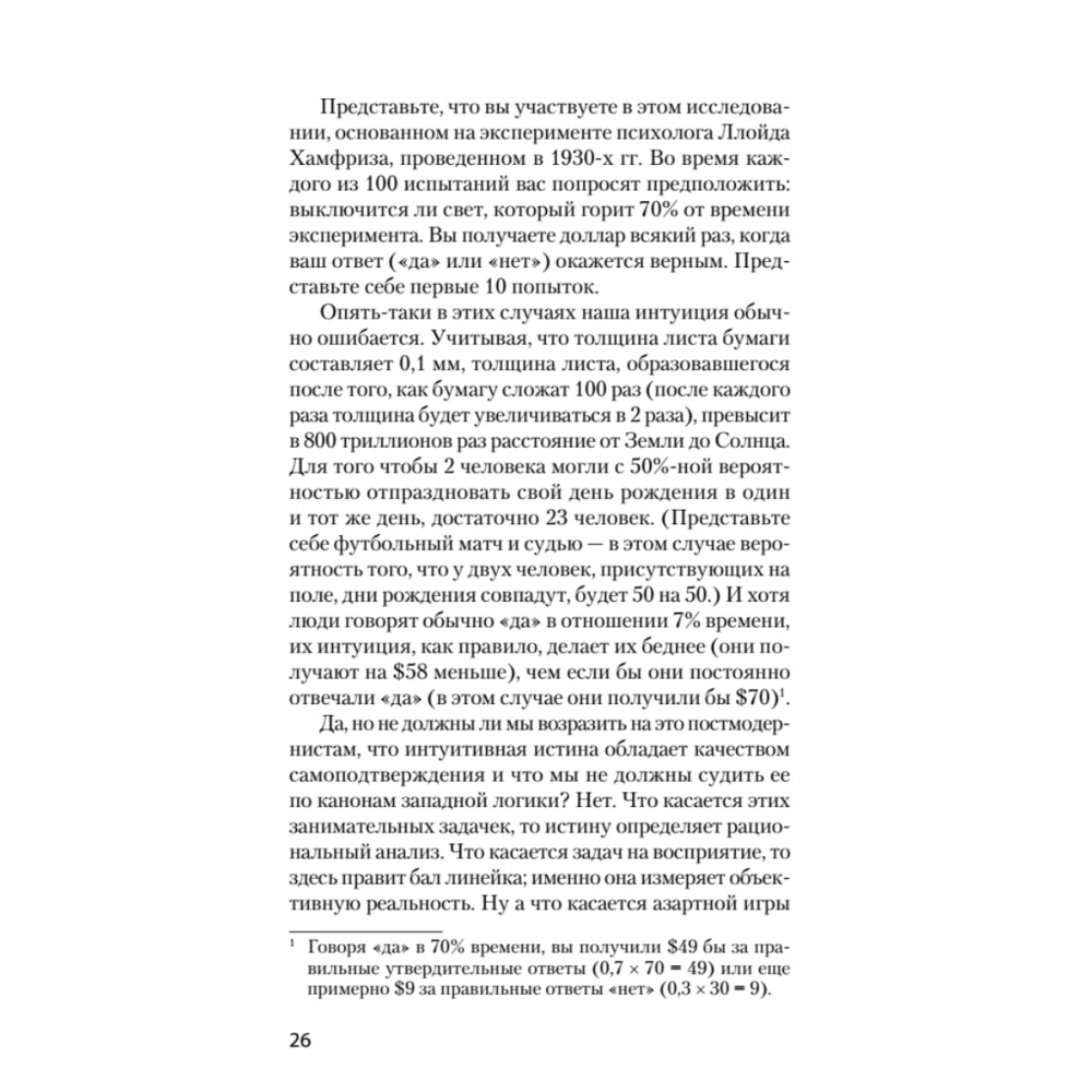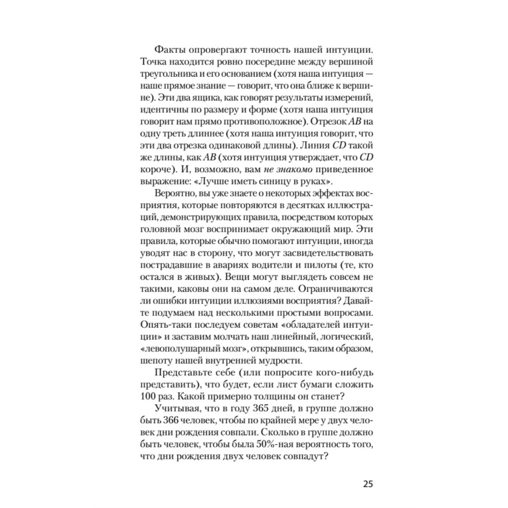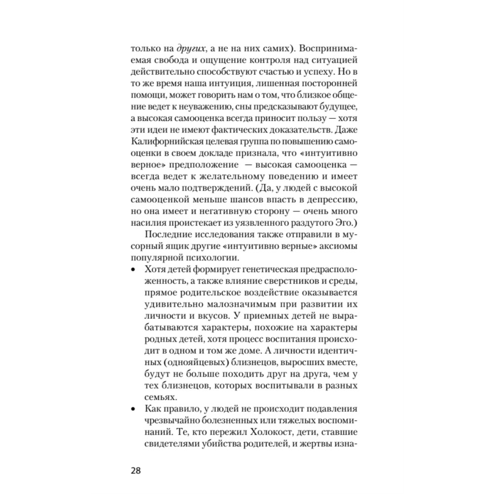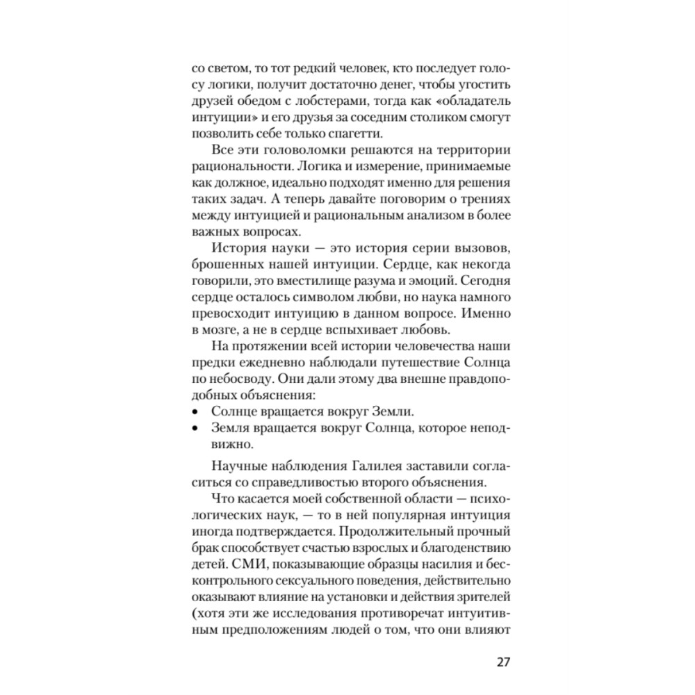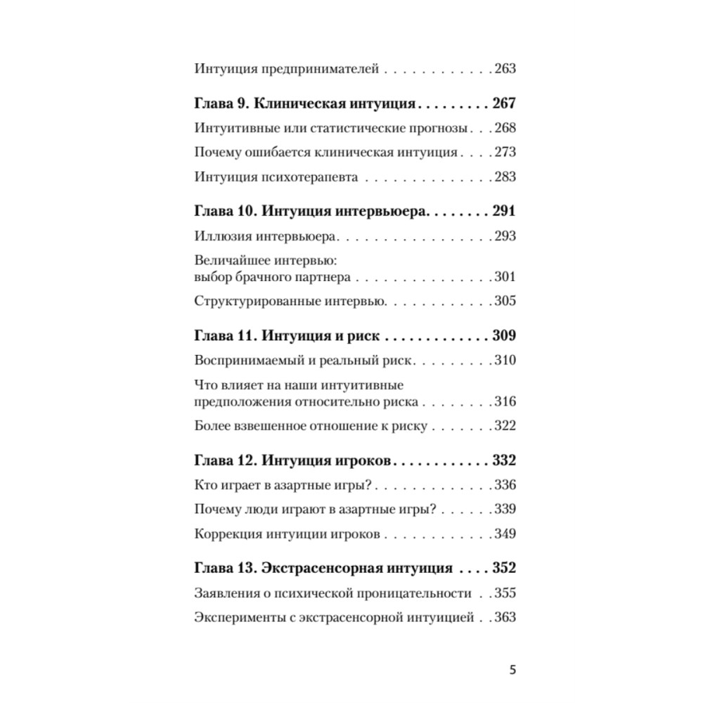 Насколько надежна наша интуиция? Можем ли мы полагаться на нее, когда делаем покупки в магазине, выбираем спутника, нанимаем сотрудников или оцениваем собственные способности? Известный во всем мире психолог Дэвид Майерс показывает, что интуиция, пробуждая в нас поразительную проницательность, в то же время может иногда ввести в опасное заблуждение. Автор освещает сильные и слабые стороны использования интуиции в случаях, когда судьи и присяжные оценивают правдивость показаний, когда психологи и психиатры выявляют склонность к преступлению, когда руководители принимают решение о найме новых сотрудников. Издание предназначено для психологов и представителей смежных специальностей, а также для преподавателей и студентов профильных факультетов высших учебных заведений.