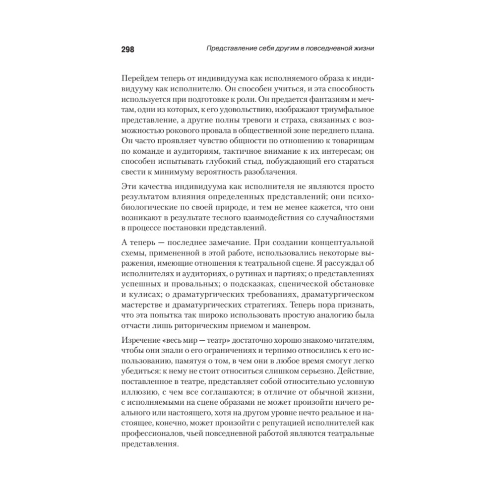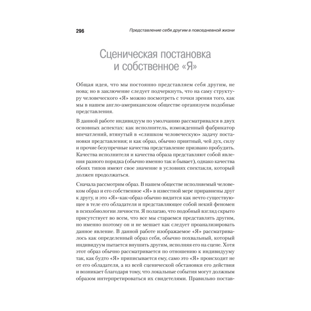 Эта книга исследует сферу человеческого поведения в социальных ситуациях и то, как нас видят другие. Каждый человек в каждодневном социальном общении представляет себя и свою деятельность другим, пытается управлять и управлять впечатлениями, которые они формируют о нем, и использует определенные методы, чтобы поддержать его выступление, подобно тому, как актер представляет характер аудитории. Обсуждение этих социальных методов, предлагаемых здесь, основано на подробном исследовании и наблюдении социальных обычаев во всем мире.