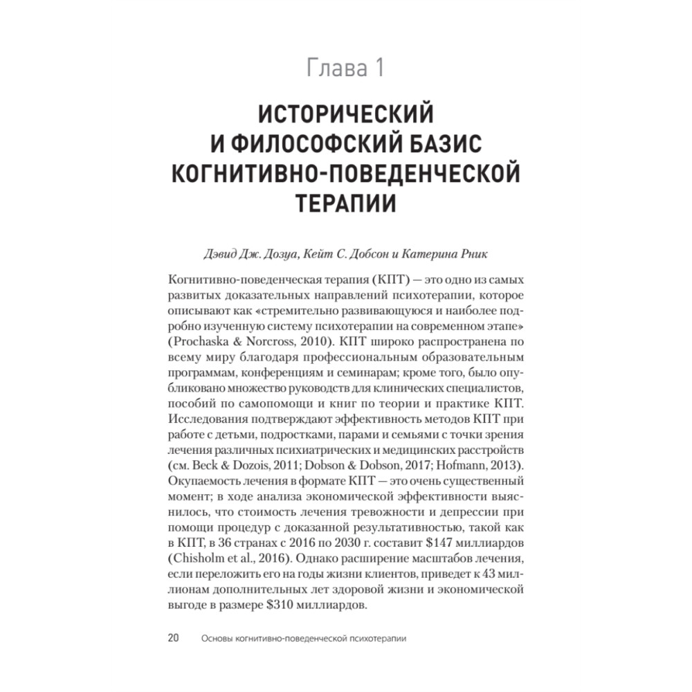 Авторы этой книги, ведущие специалисты, Кейт Добсон и Дэвид Дозуа, описывают концептуальные и научные основы КПТ. В издании подробно рассматриваются основные КПТ-подходы, включая эмоционально-ориентированную терапию решения проблем, рационально-эмотивную поведенческую терапию, схема-терапию, вмешательства на основе осознанности и принятия, а также диалектическую поведенческую терапию (ДБТ). Кроме того, в книге есть информация, посвященная клинической оценке и главы, посвященные трансдиагностическому лечению и моделям профилактики на основе КПТ. Авторы подробно обсуждают применение КПТ-подходов к конкретным группам населения, включая детей и подростков, супружеские пары, клиентов с различными культурными особенностями и многое другое.