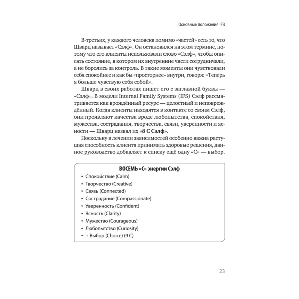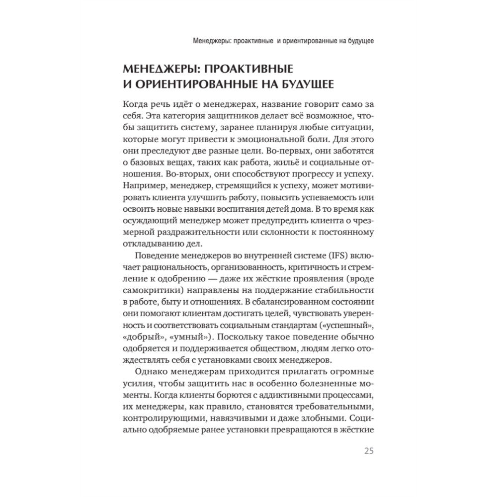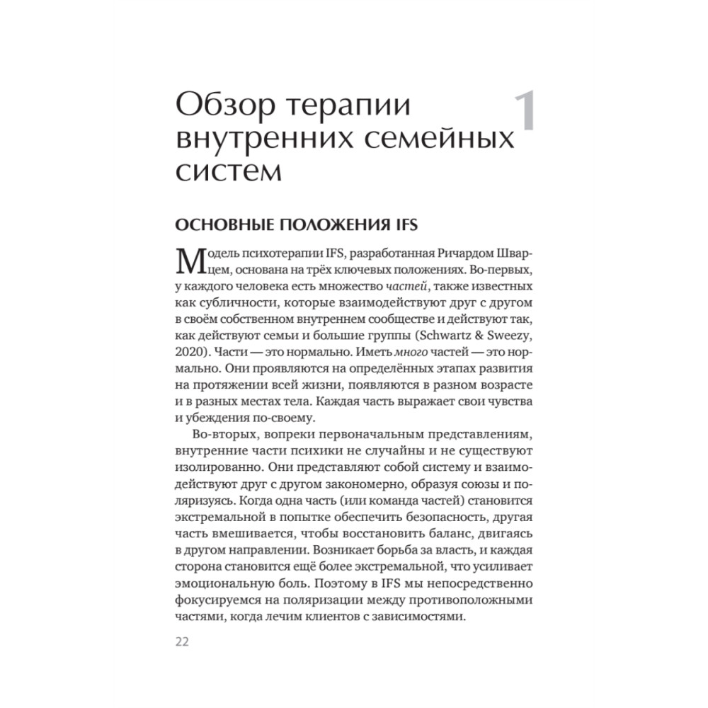 Часто зависимость рассматривается как болезнь или неконтролируемая привычка, которая сигнализирует о недостатке силы воли. Подход IFS предлагает сменить парадигму. Авторы этой книги считают, что зависимое поведение — это выбор ценной внутренней сущности (части), которая в прошлом отчаянно пыталась спасти человека и, убежденная, что должна продолжать эту работу (иначе случится нечто ужасное), застряла в своей защитной роли, сейчас уже деструктивной. Иными словами, зависимые части нередко отчаянно пытаются притупить наши болезненные эмоции: вину, стыд, ужас — либо удержать других «страшных» защитников, таких как ненависть к себе или суицидальные мысли. Следовательно, то, что они защищают, необходимо исцелить или изменить, прежде чем эти части прекратят активность. В книгу включены практические упражнения не только для клиентов, но и для терапевта, которые помогут ему исследовать свои внутренние части, вовлечённые в конфликт вокруг зависимости, и научиться принимать их.