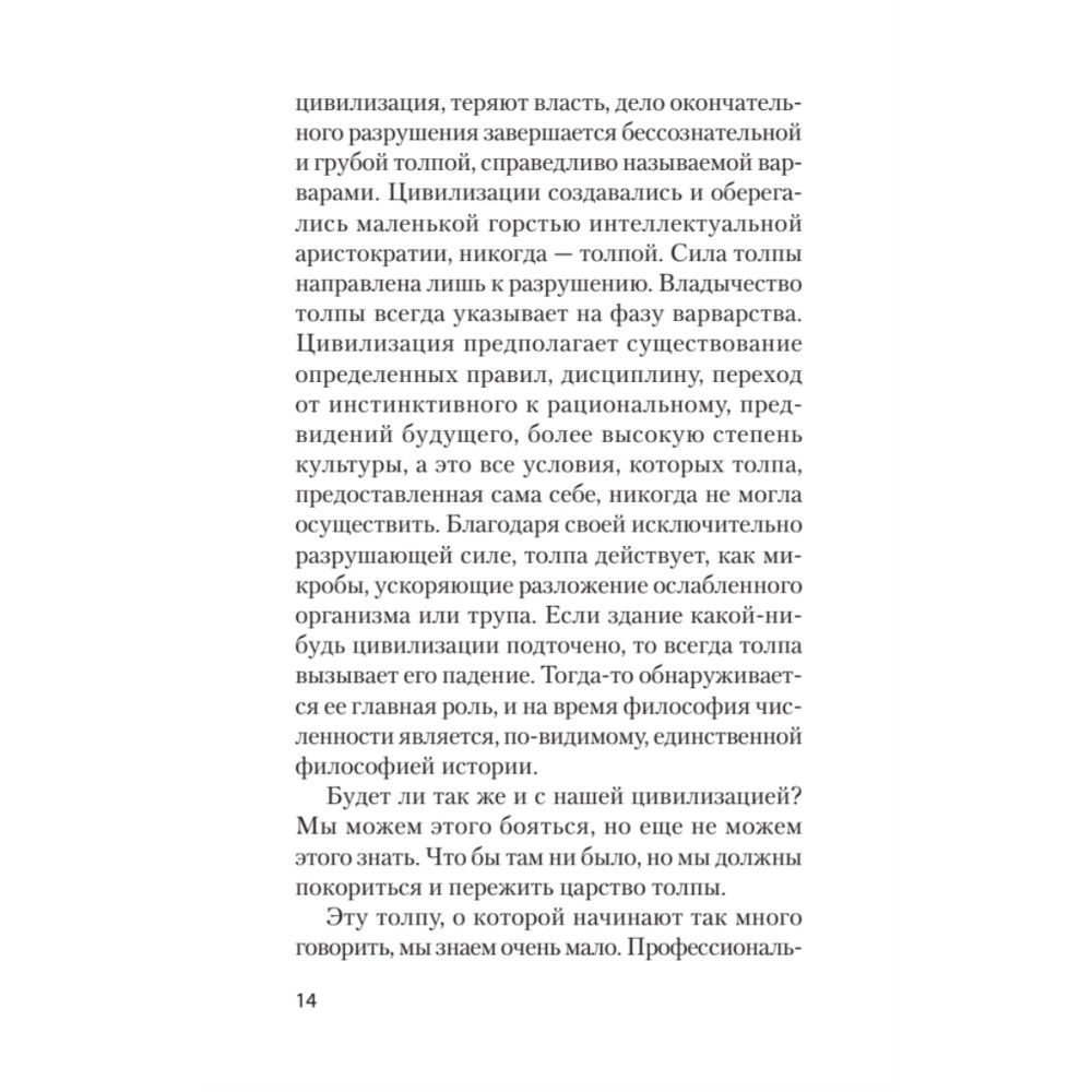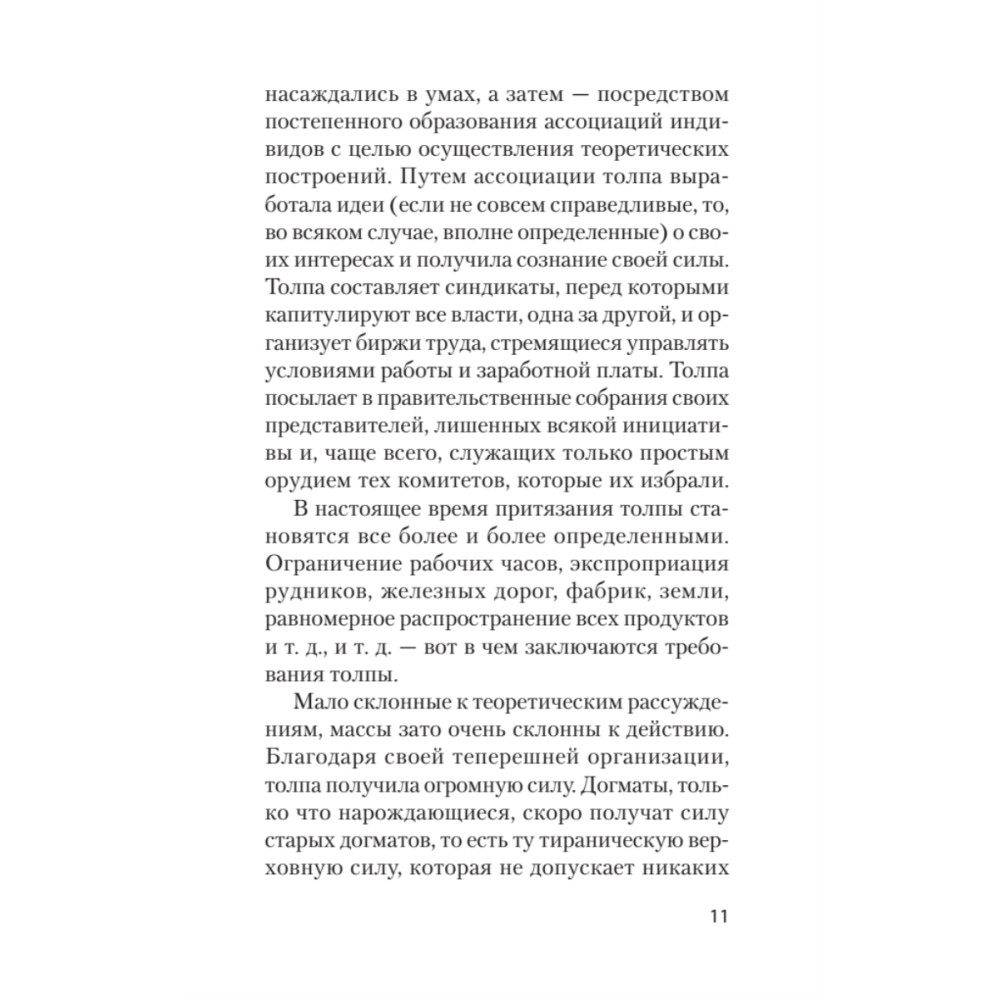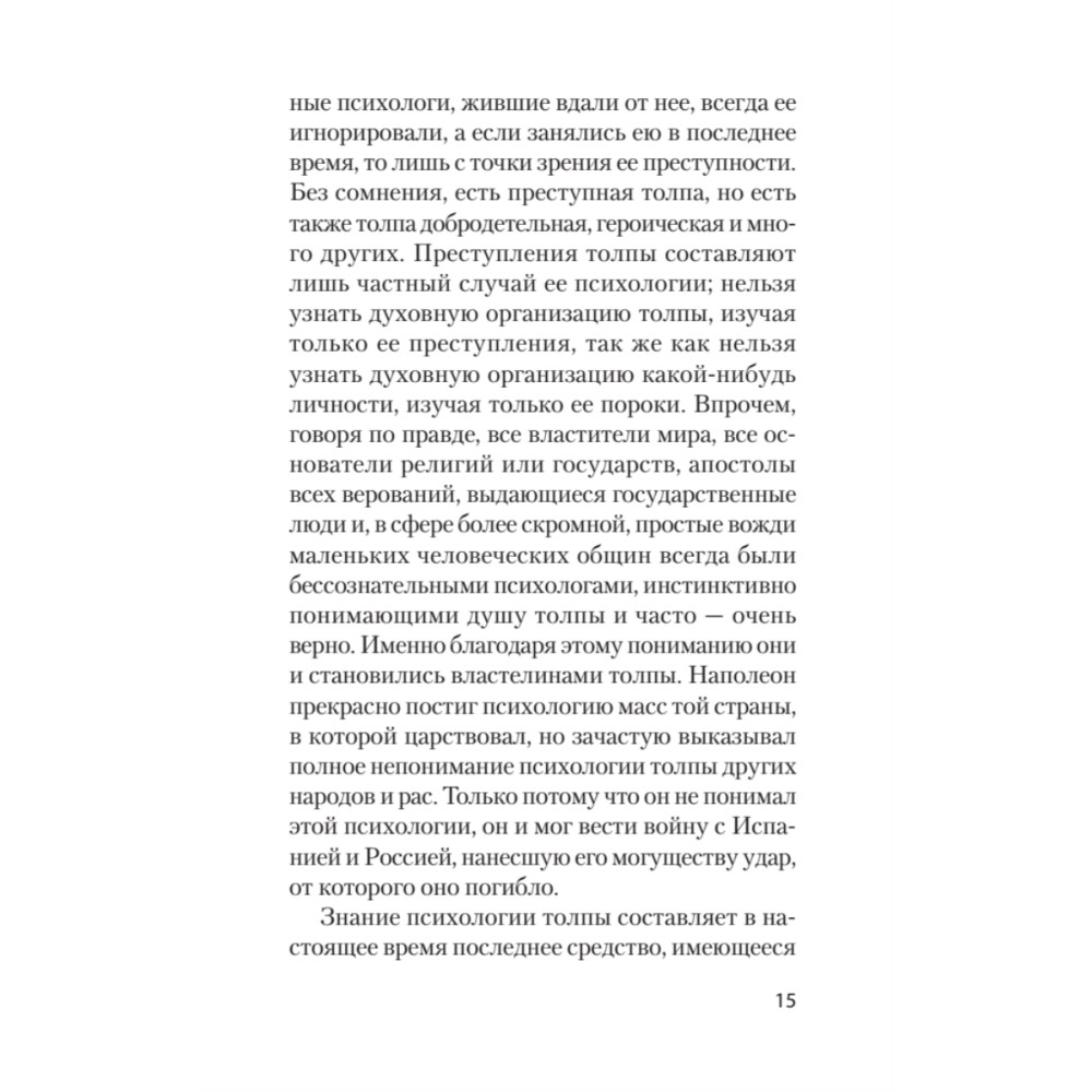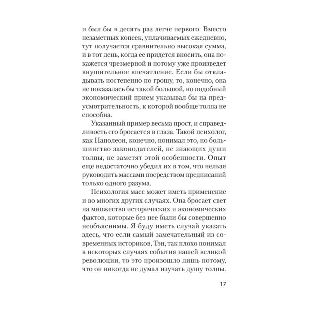Эта книга была широко известна на протяжении всего ХХ века. Французский социолог и ученый Гюстав Лебон описал технологии манипулирования массами людей. Власть толпы очень сильна и может быть опасна. Научитесь управлять своим поведением и не давайте себя втягивать в сомнительные мероприятия.