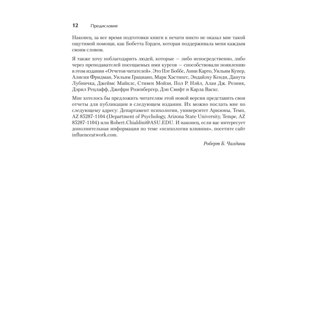 «Психология влияния» — одно из лучших учебных пособий по социальной психологии, конфликтологии, менеджменту, по мнению большинства западных и отечественных психологов. Книга Роберта Чалдини выдержала в США 5 изданий, ее тираж давно уже превысил 2 500 000 экземпляров.