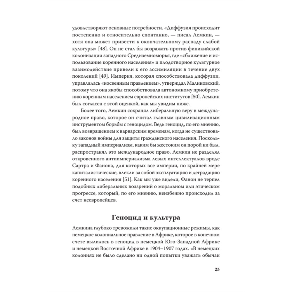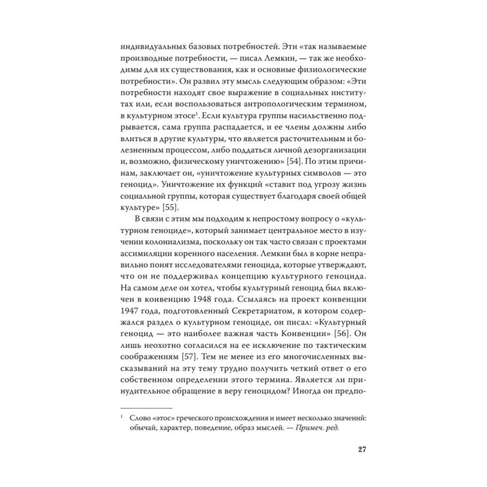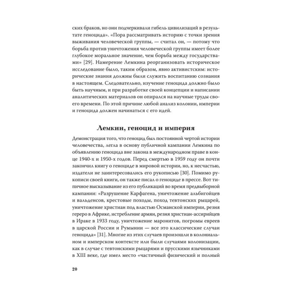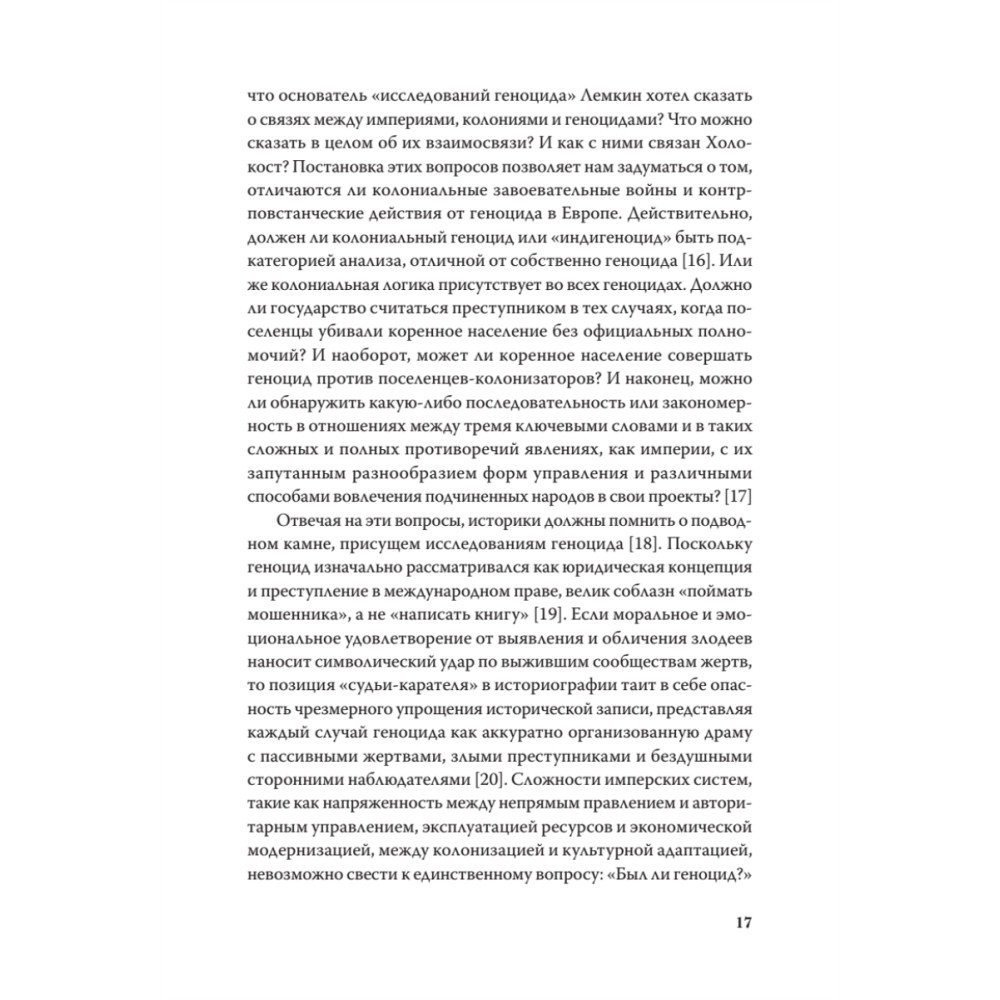 В 1944 году Рафаэль Лемкин (польский юрист, автор проекта Конвенции ООН о предупреждении и наказании преступления геноцида) ввел термин “геноцид” для описания иностранной оккупации, которая уничтожила или навсегда искалечила подвластное население. Согласно этой традиции, книга "Империя, колония, геноцид" включает геноцид как явление в эпохальные геополитические преобразования последних 500 лет: европейскую колонизацию земного шара, взлет и падение континентальных сухопутных империй, насильственную деколонизацию и формирование национальных государств. Такой взгляд на вещи бросает вызов привычному пониманию массовых преступлений двадцатого века и показывает, что геноцид и “этнические чистки” были неотъемлемой частью имперской экспансии.