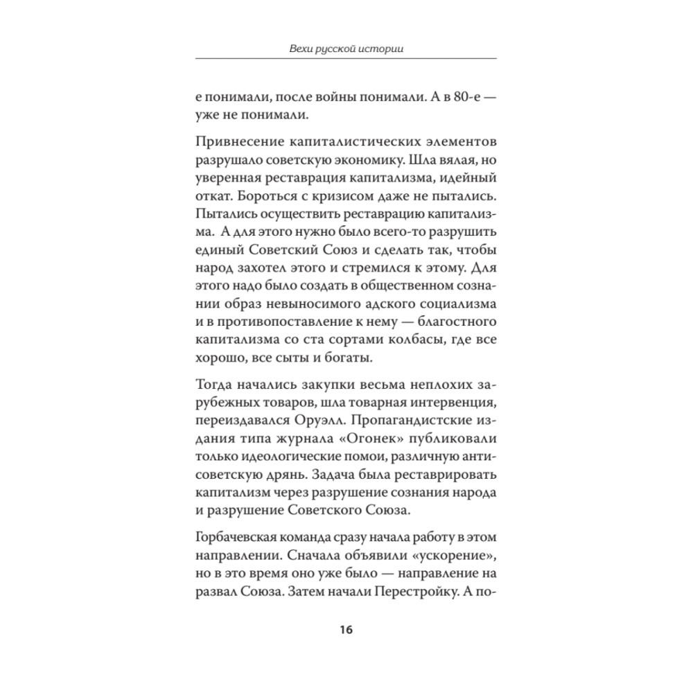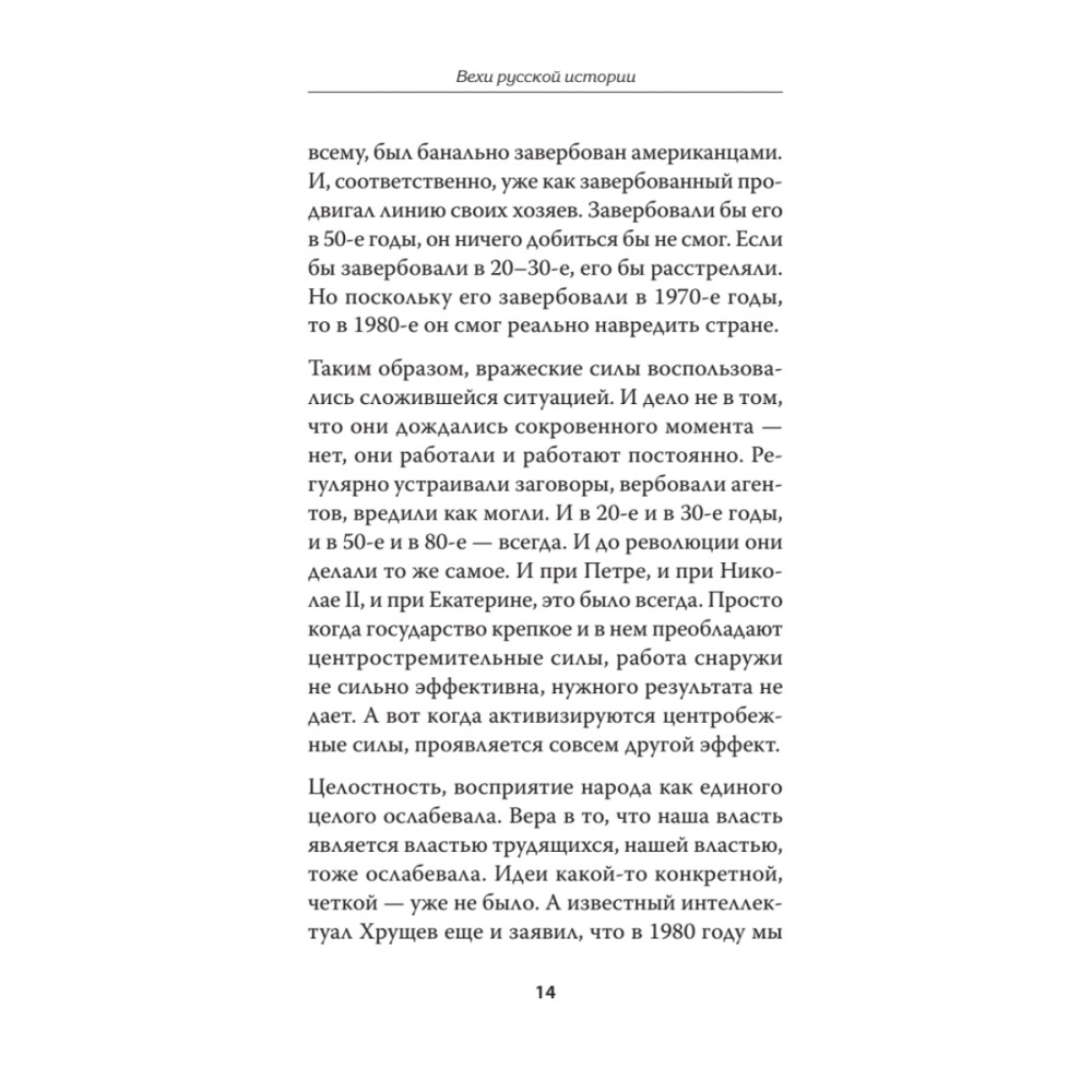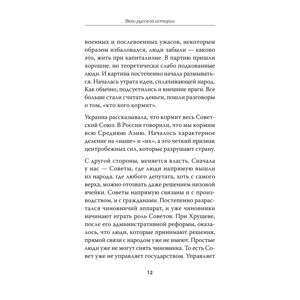 Книга "Вехи русской истории" посвящена поворотным моментам на пути развития России. Чтобы понимать текущую ситуацию, в которой находится наша страна, необходимо знать основные факты и события русской истории. Каждый раз, когда Россия делала исторический выбор, и двигалась по собственному, ни на кого не похожему пути, проявляя при этом чудеса самоотверженности и героизма, она побеждала. Когда же страна шла по проторенной другими дороге, которая, казалось бы, вела к гарантированному положительному результату, чаще всего она проигрывала.